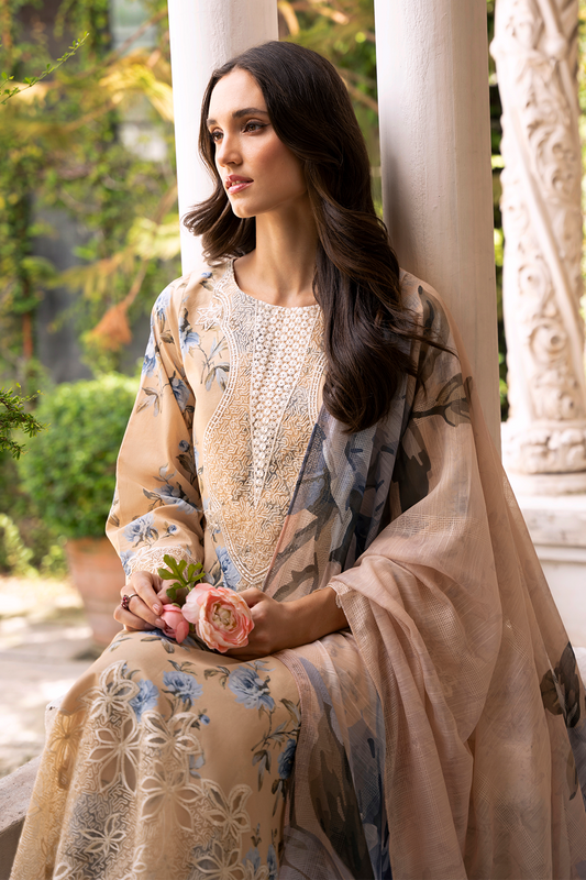 Beige Embroidered Cambric Lawn 3 Pc Dress - Esra Fashion