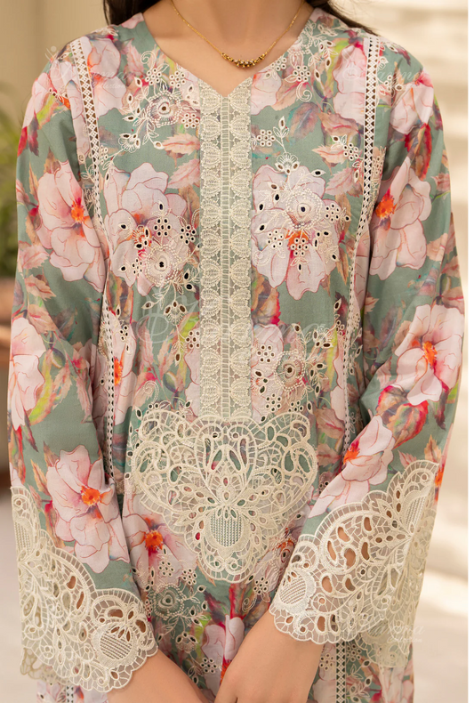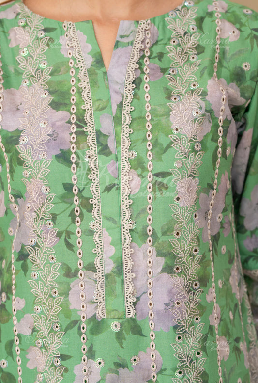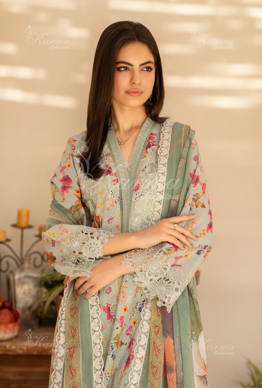 (Mint Green) Printed Chikenkari Cotton Lawn 3 Pc - Karma Collection