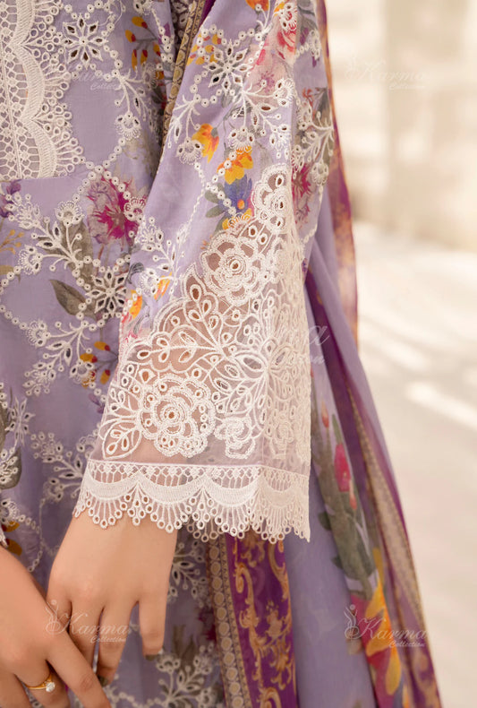 (Lilac) Printed Chikenkari Cotton Lawn 3 Pc - Karma Collection