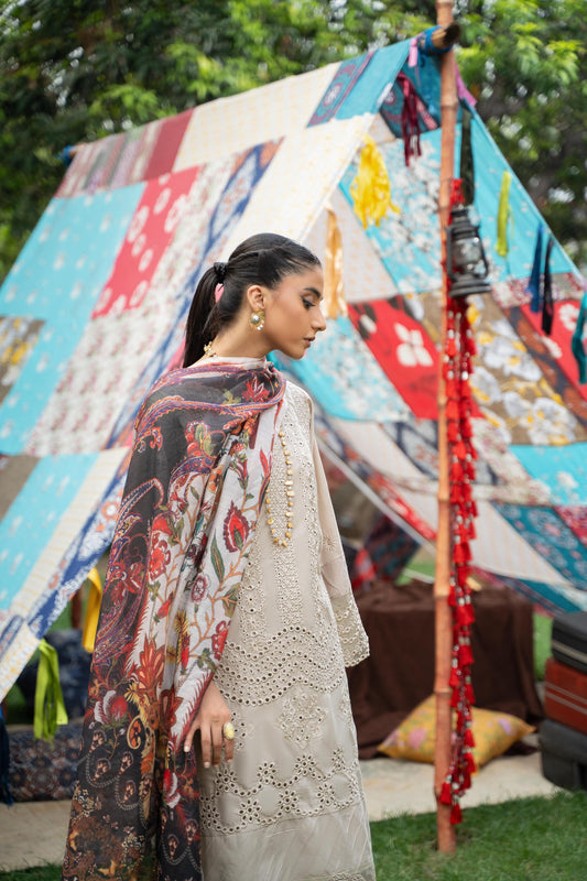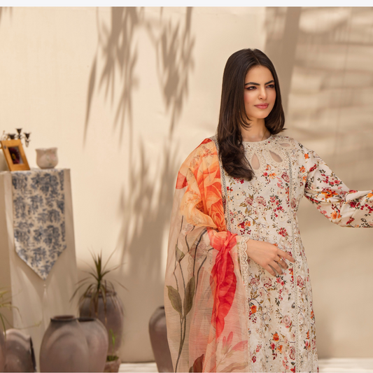 (Ivory) 3 Pc Chikenkari Lawn Dress-Raniya.h