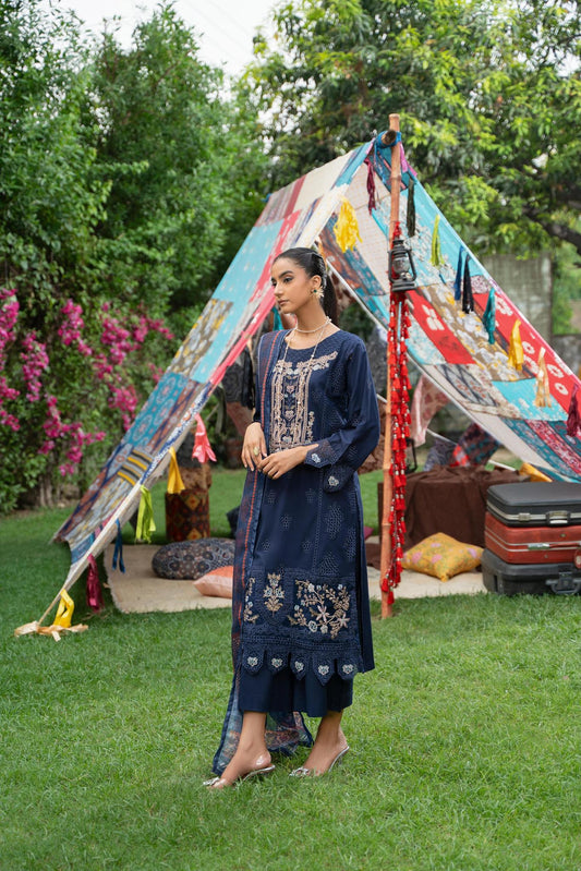 (Blue) 3 Pc Chikenkari Lawn Dress-Raniya.h