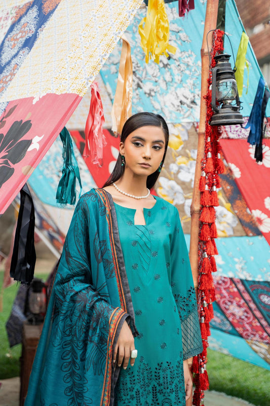 (Light Turquoise) Printed Chikenkari Cotton Lawn 3 Pc - Karma Collection