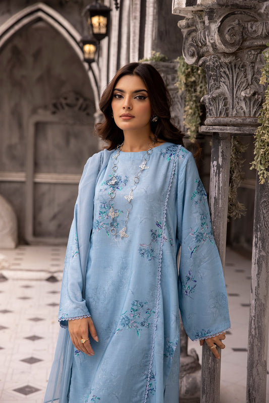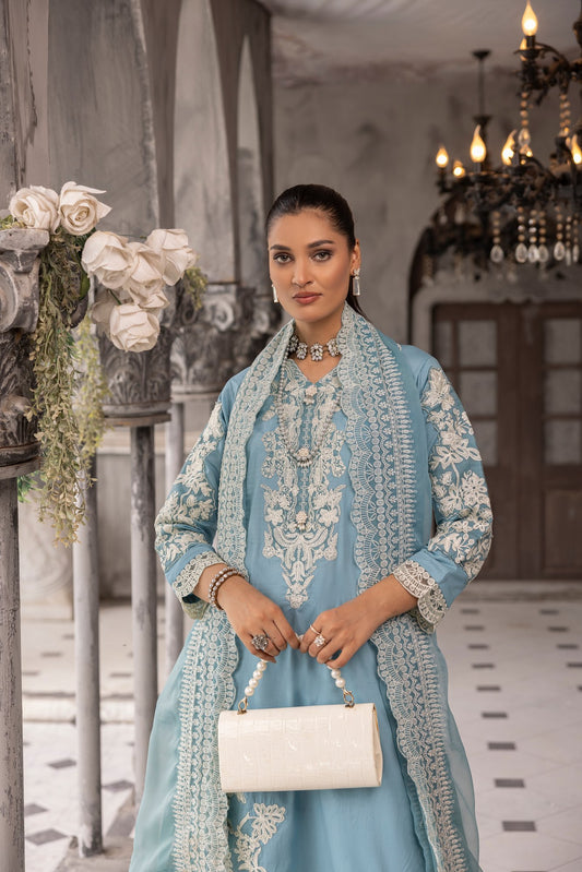 (Ice Blue) 3 piece embroidered cambric cotton dress-Simrans
