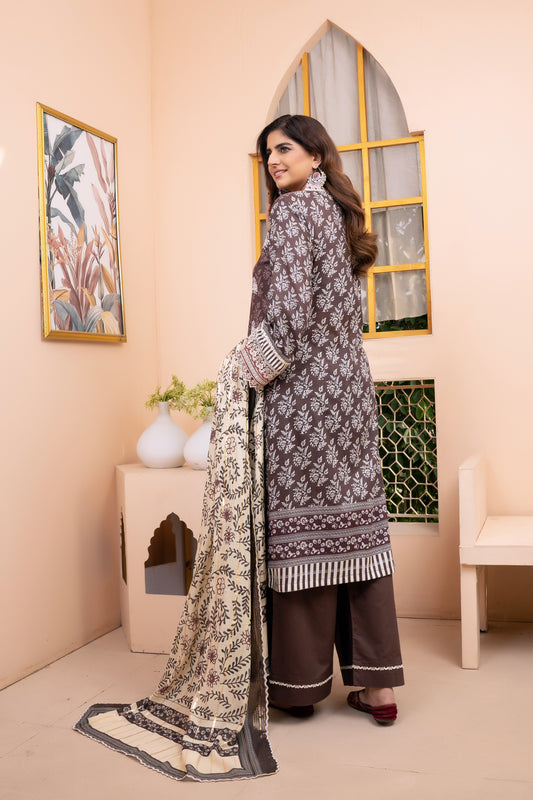 (Brown) 3Pc Printed Embroidered Lawn Dress by MUNIRA