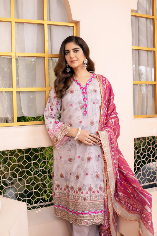 (Pinkish Grey) 3Pc Printed Embroidered Lawn Dress by MUNIRA