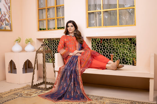 (Orange) 3Pc Printed Embroidered Lawn Dress by MUNIRA