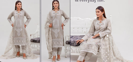 Light Grey 3 Pc Festive Embroidered Cotton dress - Rangz