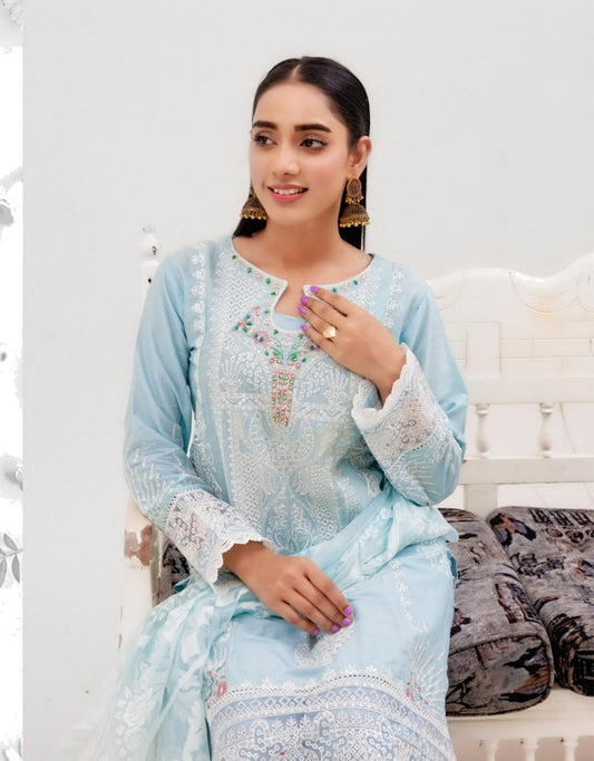 (Blue) Chikenkari Lawn Ready to Wear 3 Pc Dress-Adan's Libas