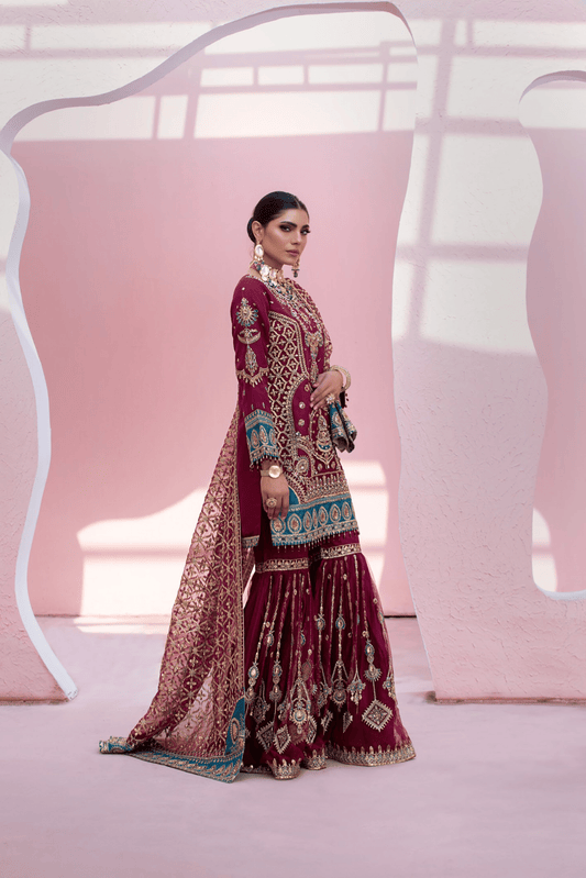 (Maroon) 3 Pc Embroidered Organza wedding Wear Dress-Differ