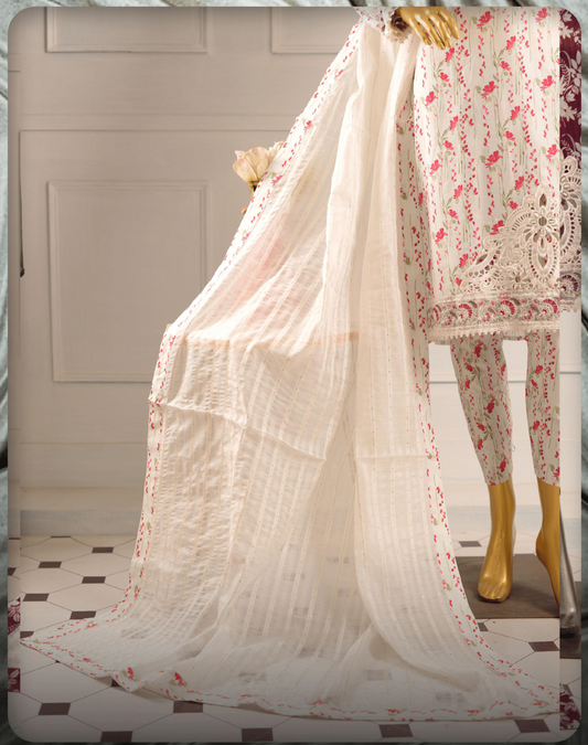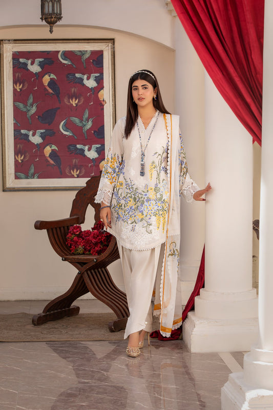 (White) 3 Pc Embroidered Printed Lawn Dress (RIVAAJ)