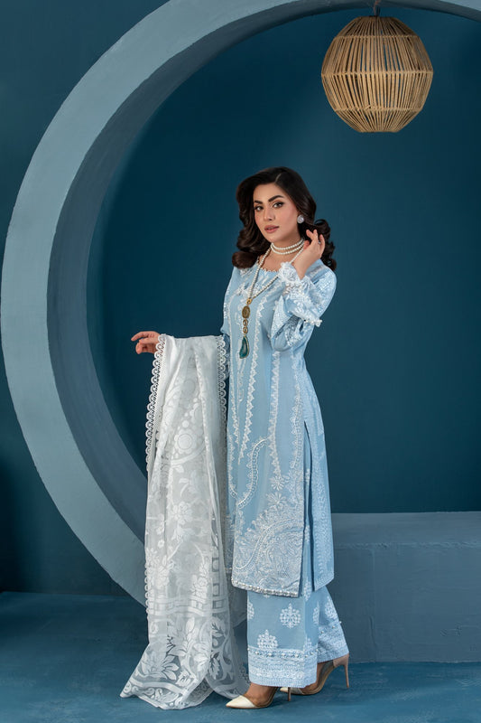 (SKY BLUE) 3 Pc Embroidered Lawn Dress-Heera's