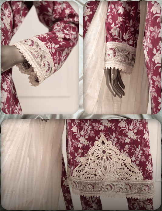 (Magenta) 3 Pc Embroidered Printed Lawn Dress
