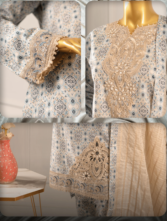 (Beige) 3 Pc Embroidered Lawn Dress-Heera's