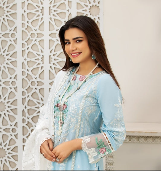 (CASAL BLUE) Embroidered 3 Piece Lawn Dress - Zainab Fazlani