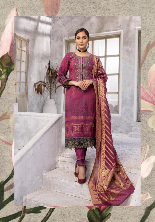 (Light Burgundy) "Bella Festive" 3 Pc Embroidered Jacquard Dress by Simrans