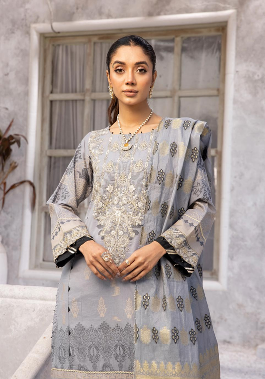 (Grey) "Bella Festive" 3 Pc Embroidered Jacquard Dress by Simrans
