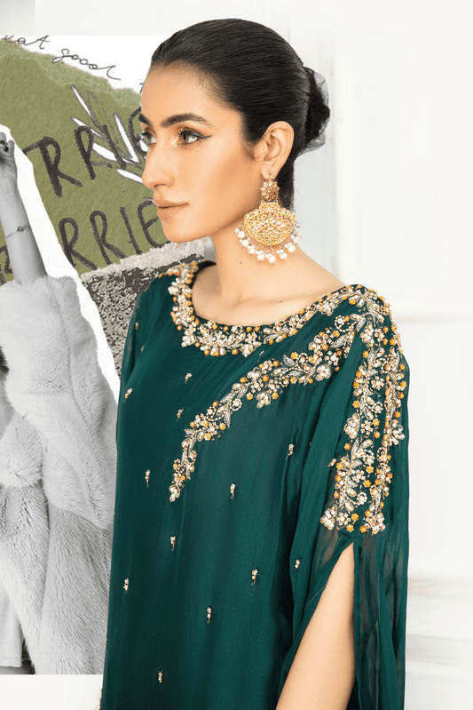 Regular price £34.99 GBPRegular priceUnit price perSale price £34.99 GBP(Bottle Green) SIMRANS ‘FUSION GLAM’ | Chiffon 3PC Ready To Wear