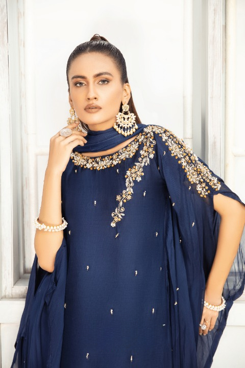 Regular price £34.99 GBPRegular priceUnit price perSale price £34.99 GBP(Navy Blue) SIMRANS ‘FUSION GLAM’ | Chiffon 3PC Ready To Wear