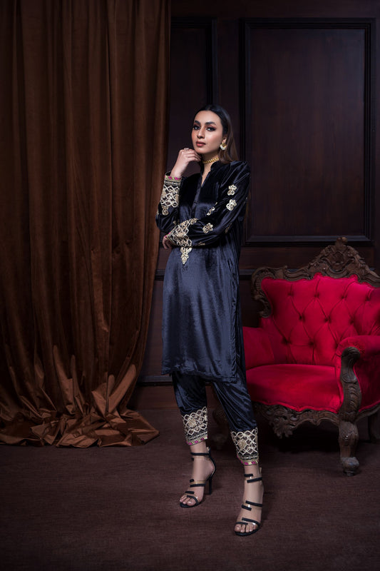 Black Luxury Velvet | 2 Piece Embroidered | Tilla Embroidery On Neck