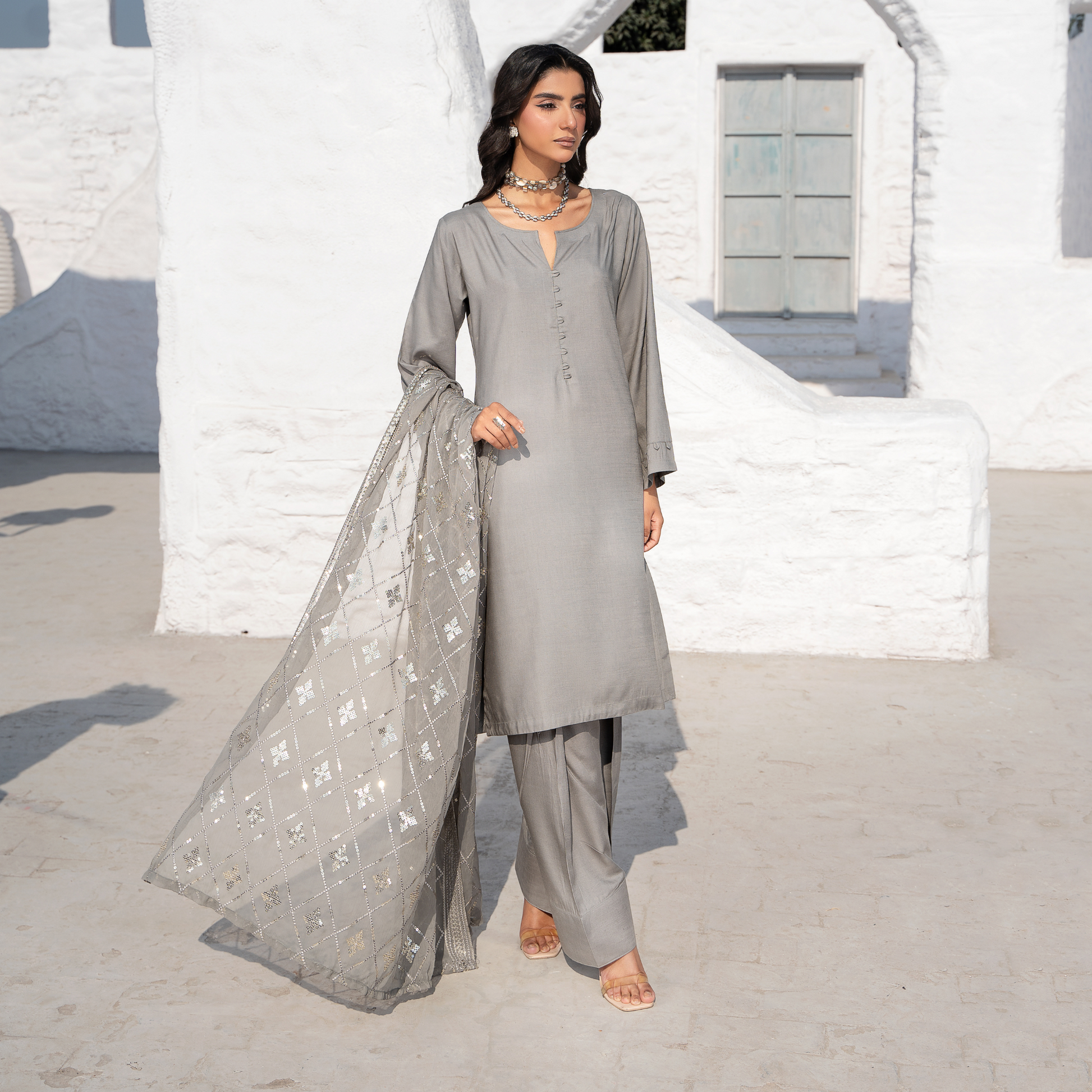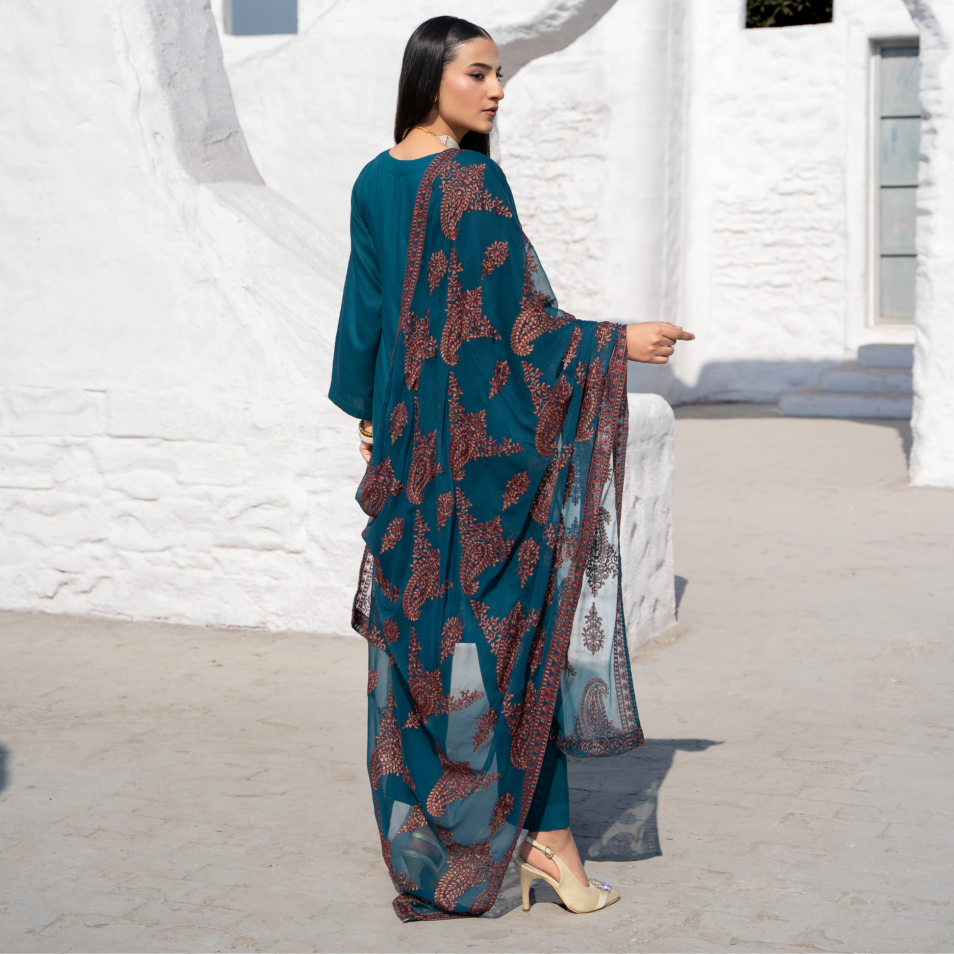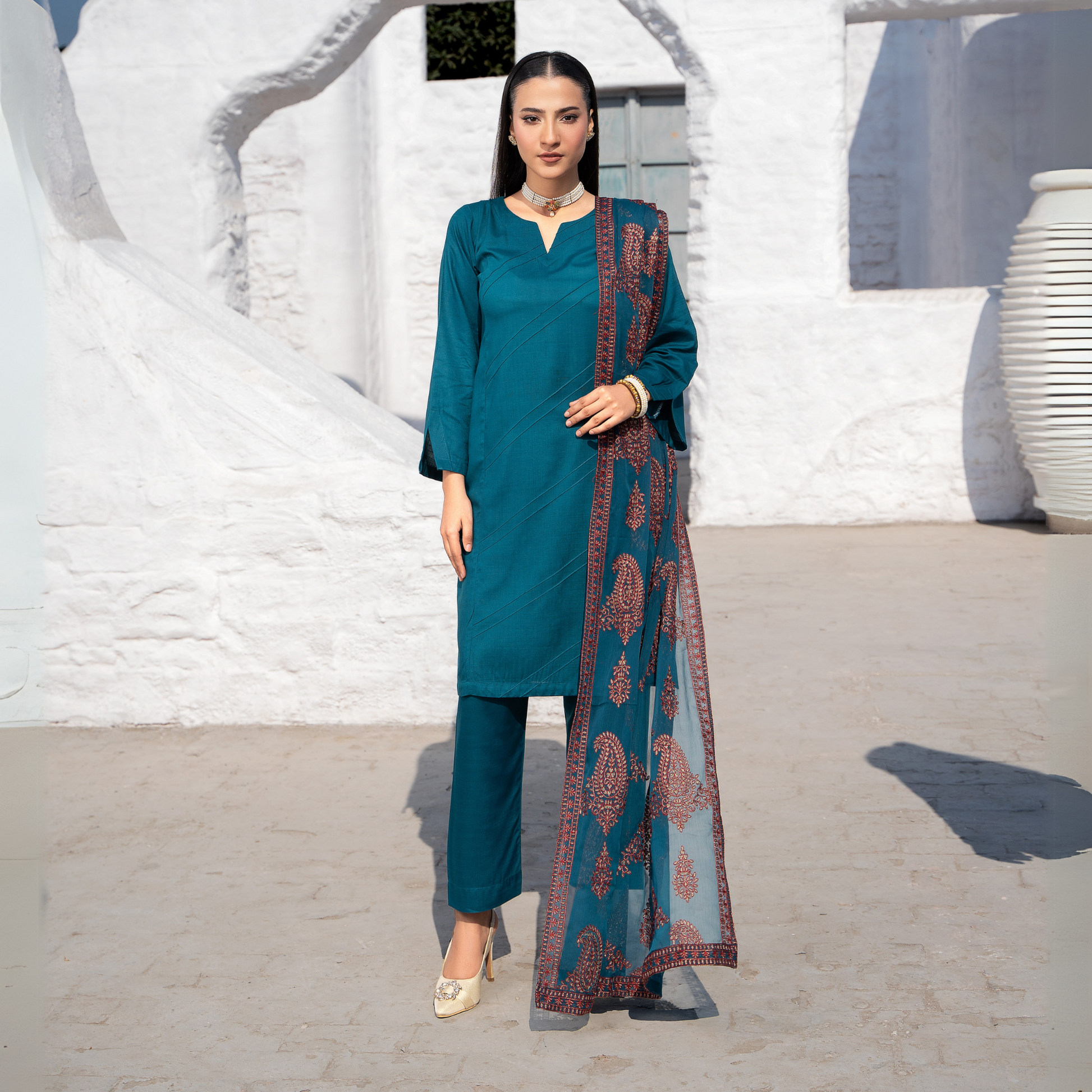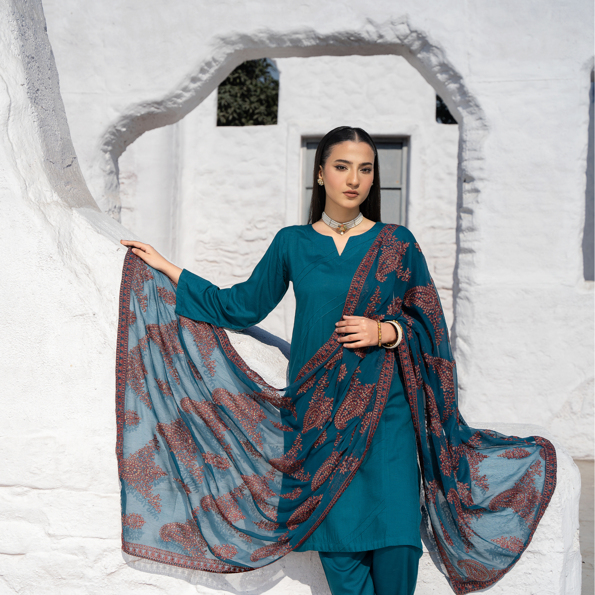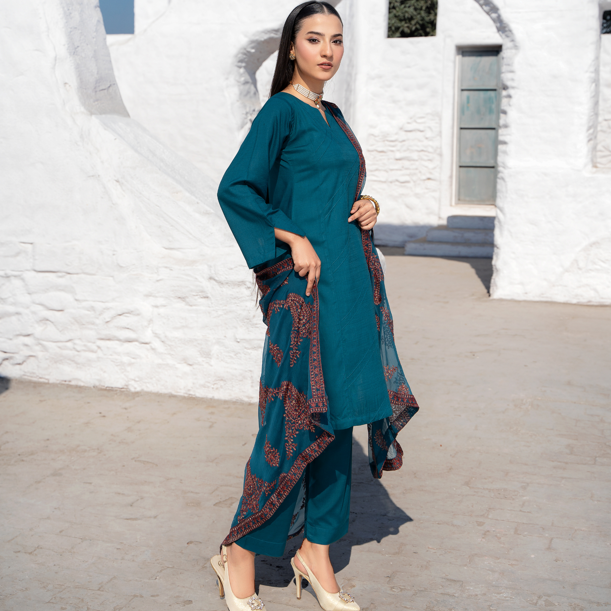 3 Pc Solid Slub Linen Dress with Embroidered Chiffon Dupatta| Winter Collection | Raniya.h | RA-13
