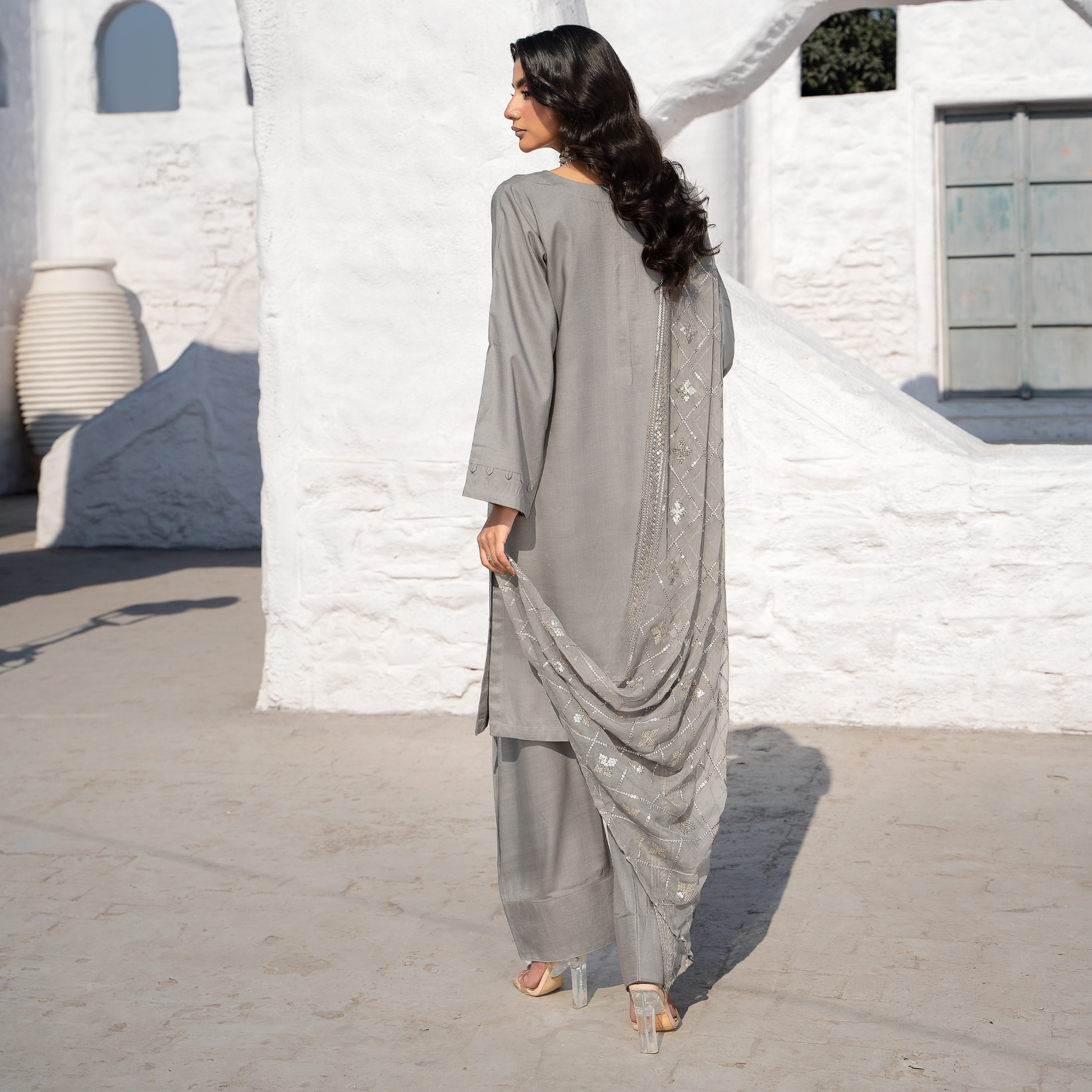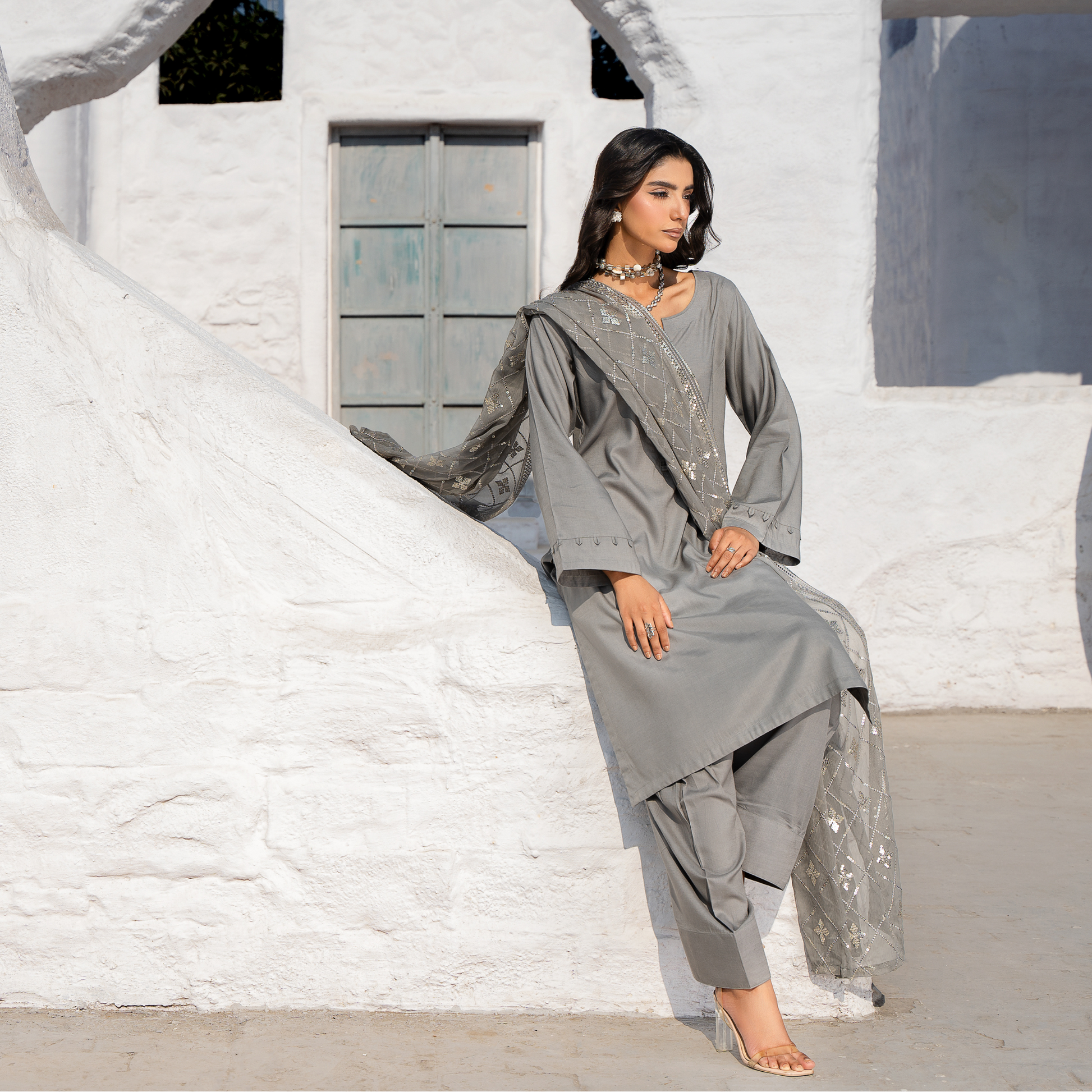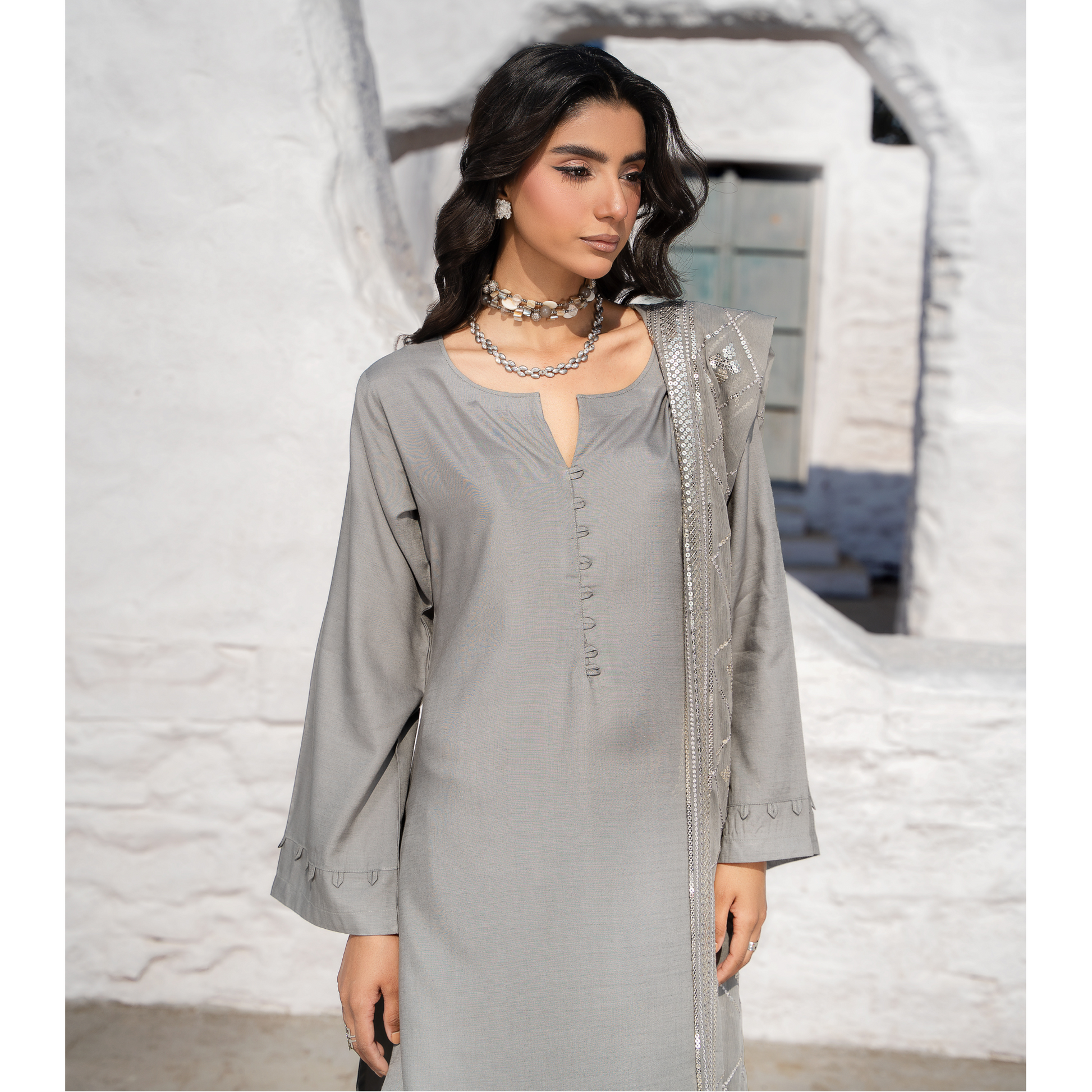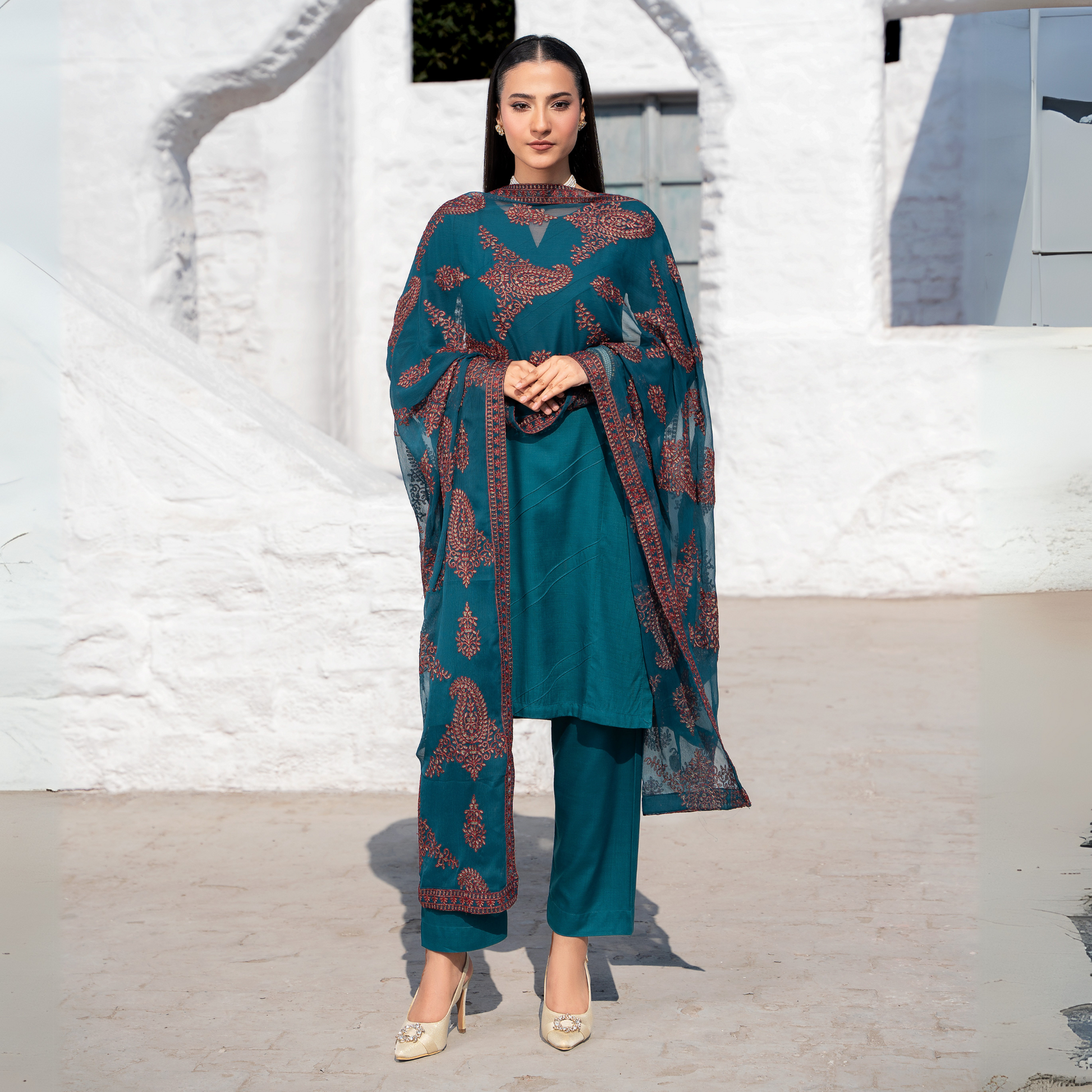 3 Pc Solid Slub Linen Dress with Embroidered Chiffon Dupatta| Winter Collection | Raniya.h | RA-13