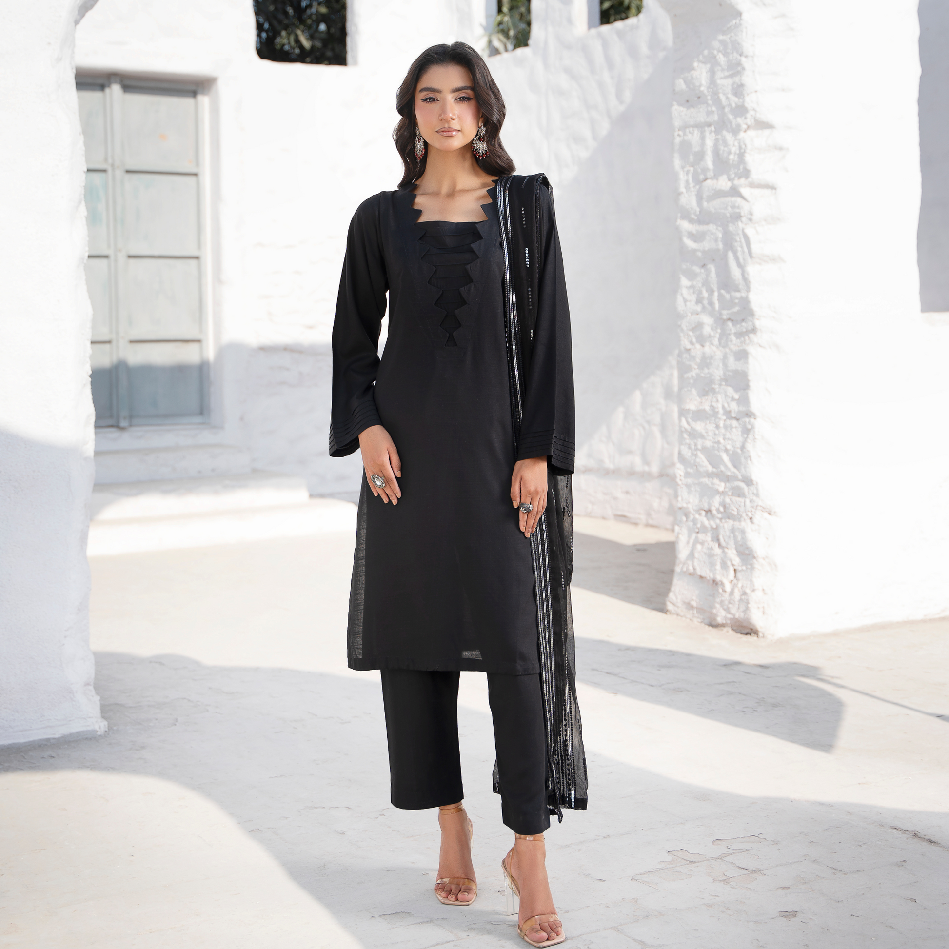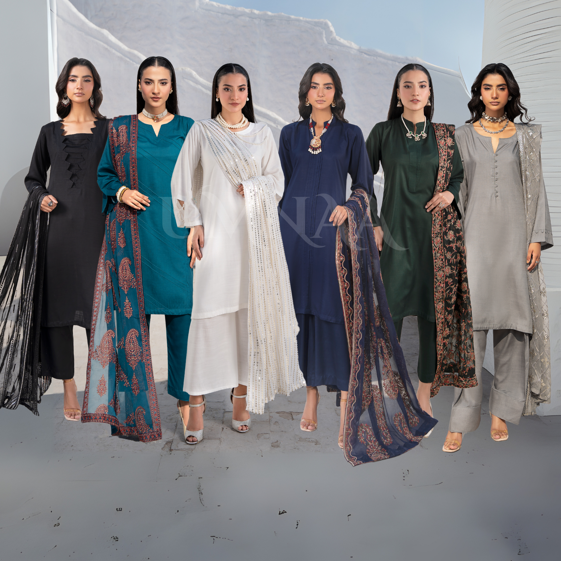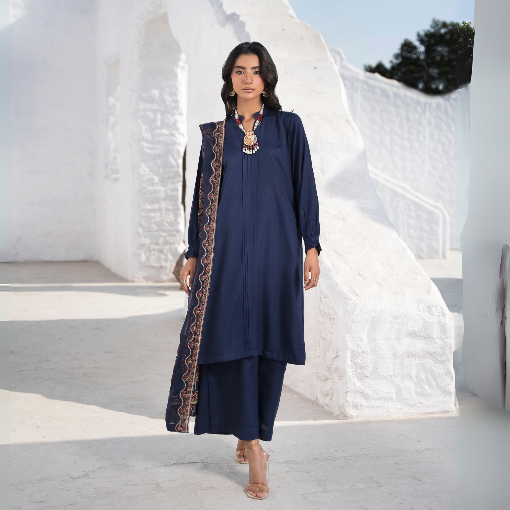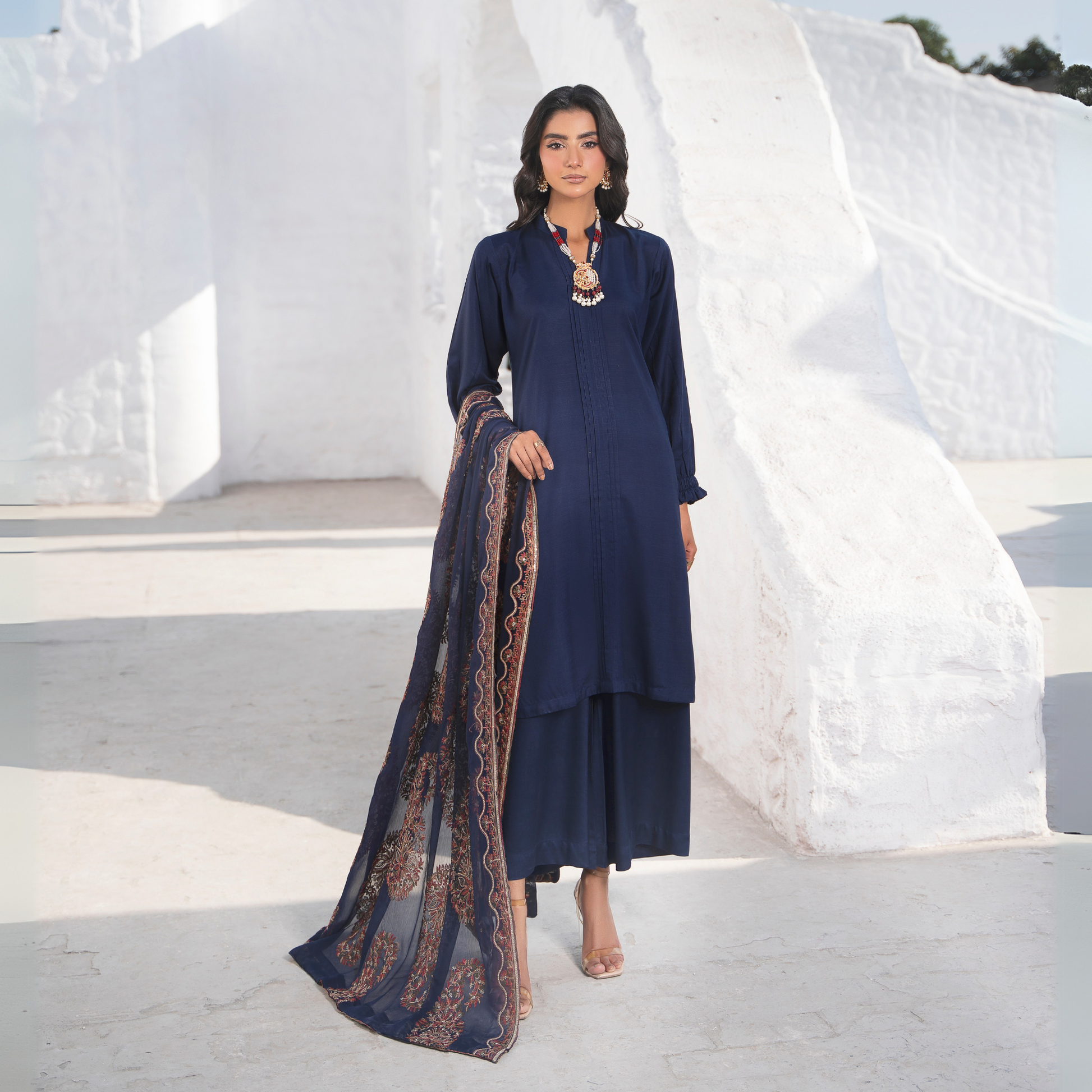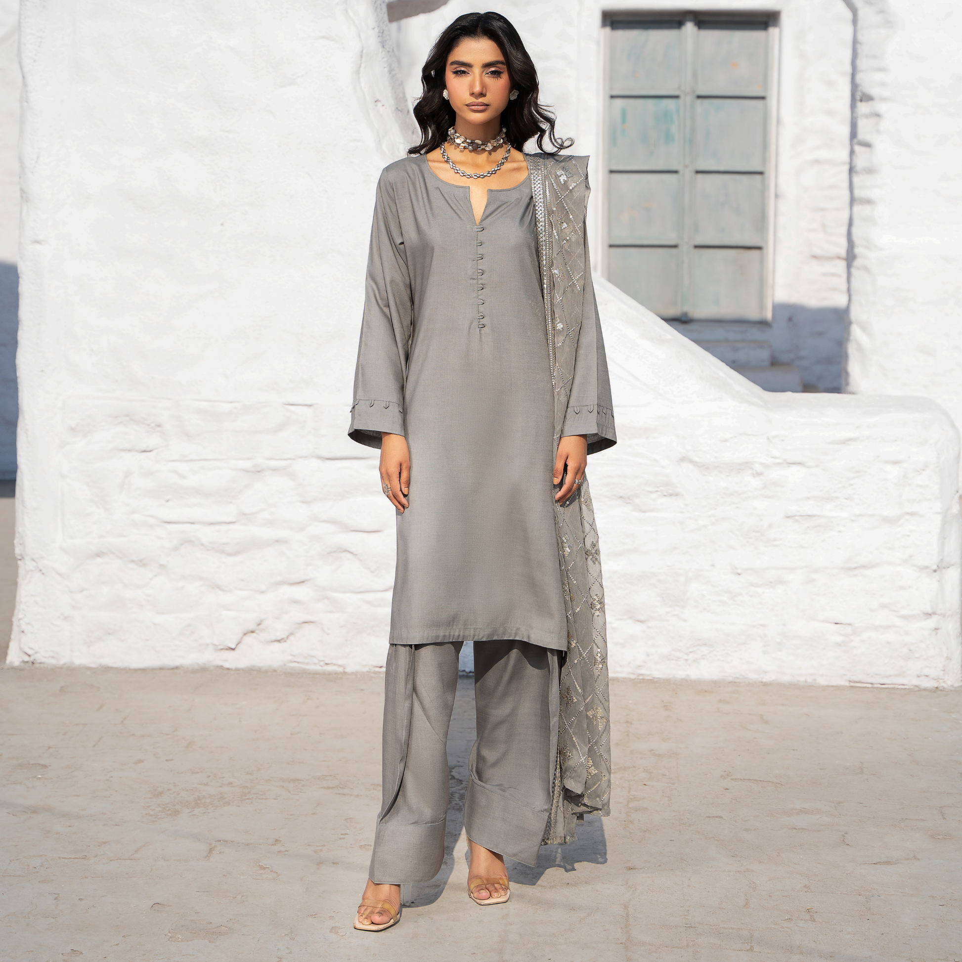 3 Pc Solid Slub Linen Dress with Embroidered Chiffon Dupatta| Winter Collection | Raniya.h | RA-13