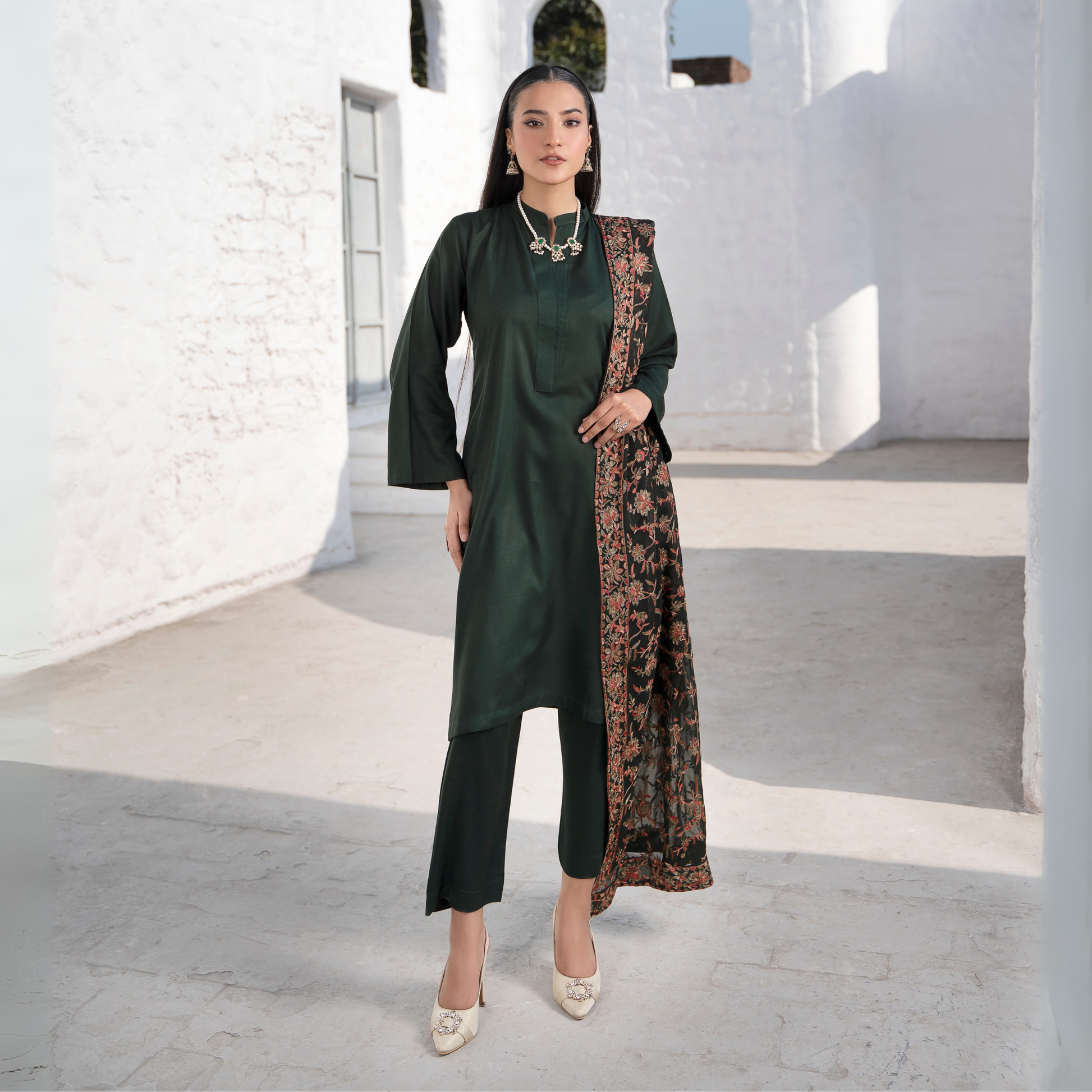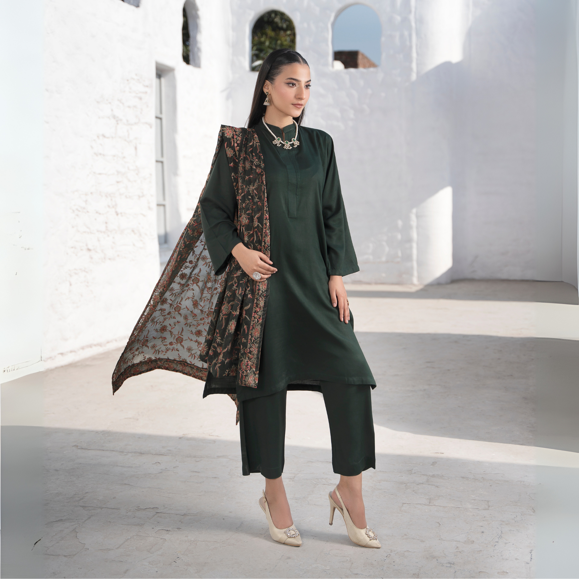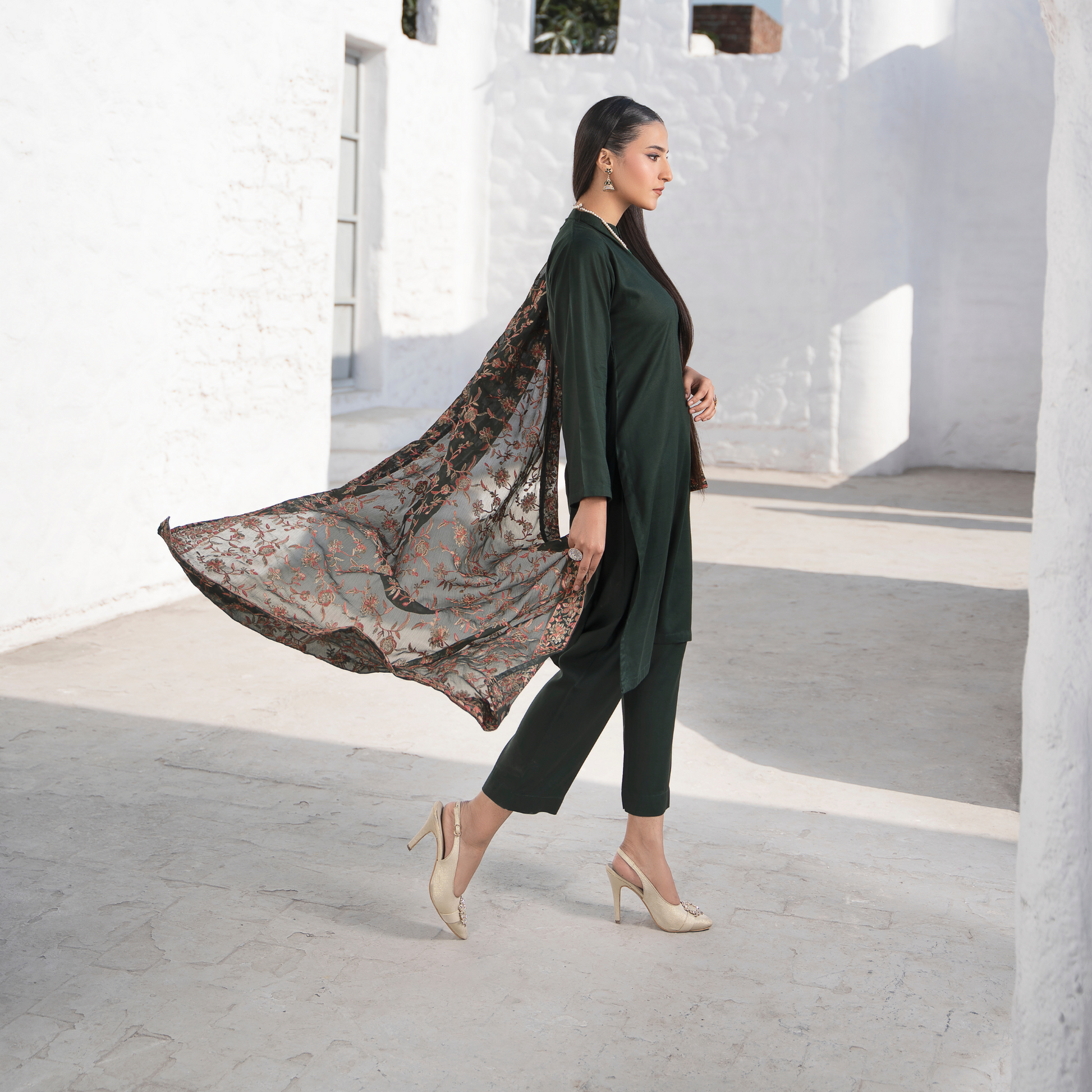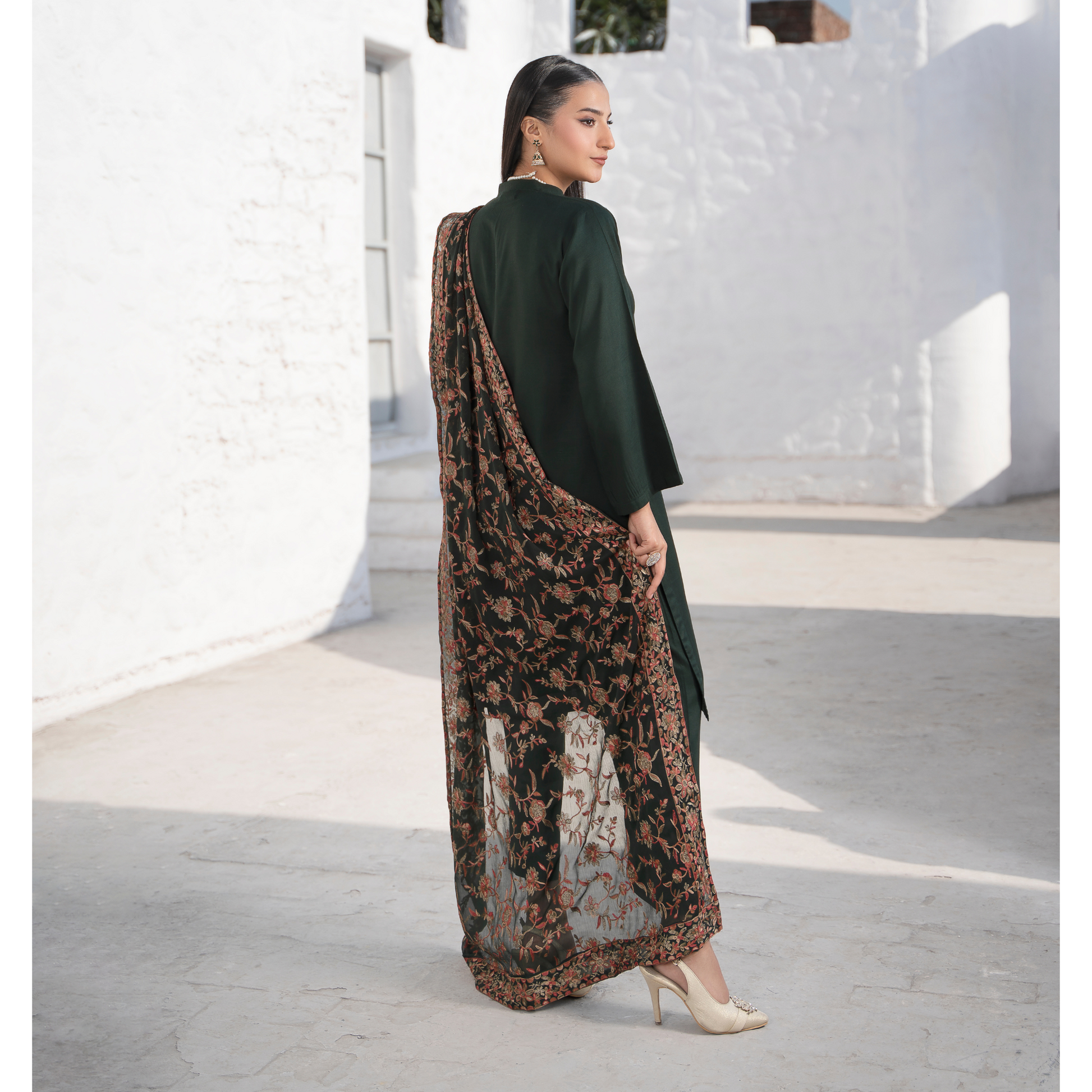 Elevate your wardrobe with this exquisite bottle green slub linen ensemble, Paired with a fully embroidered dupatta, adorned with intricate detailing, this outfit is a true embodiment of refined elegance. The rich textures and delicate craftsmanship add a touch of tradition, making it a timeless statement piece.