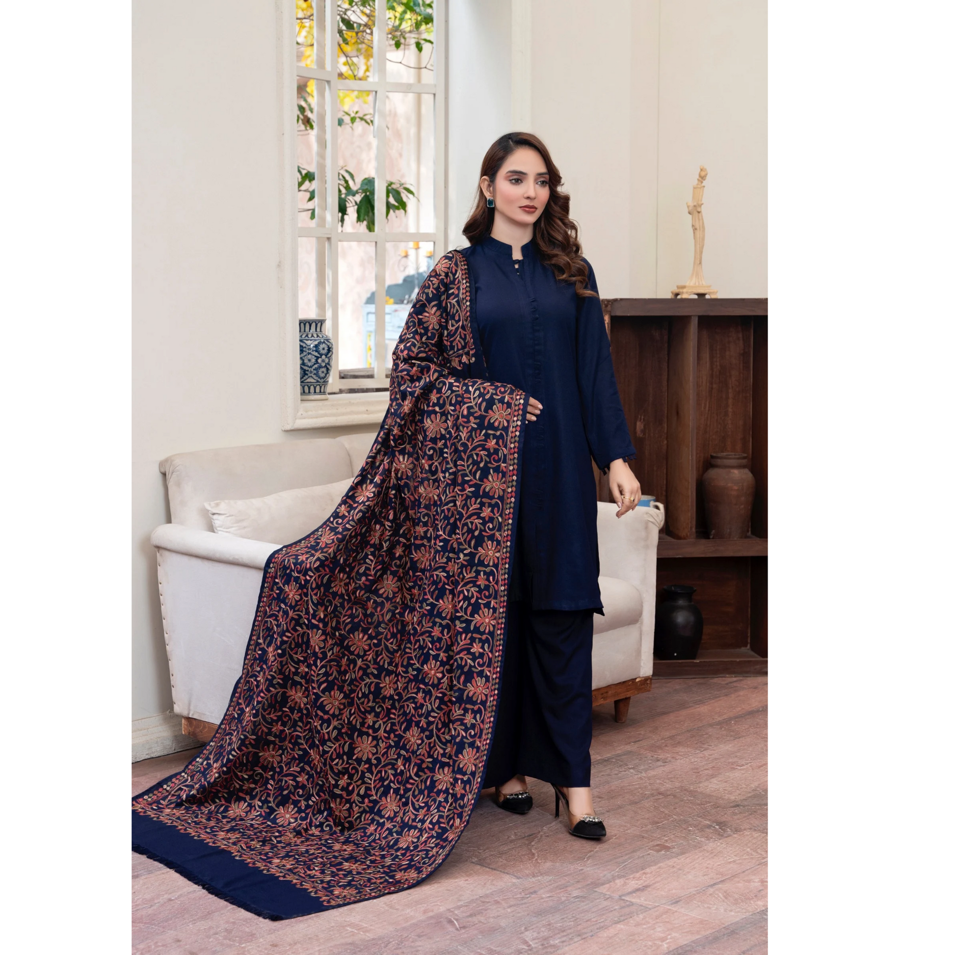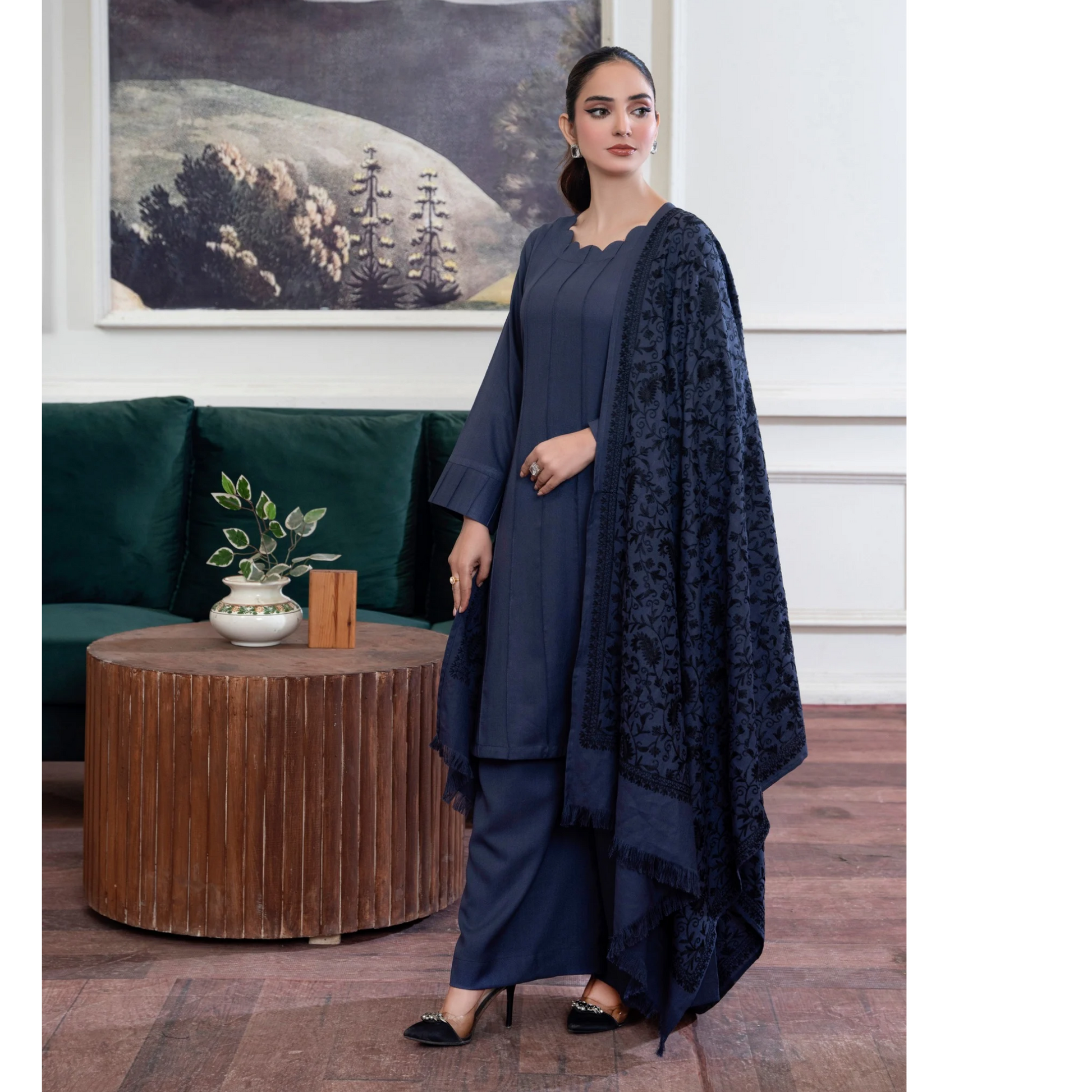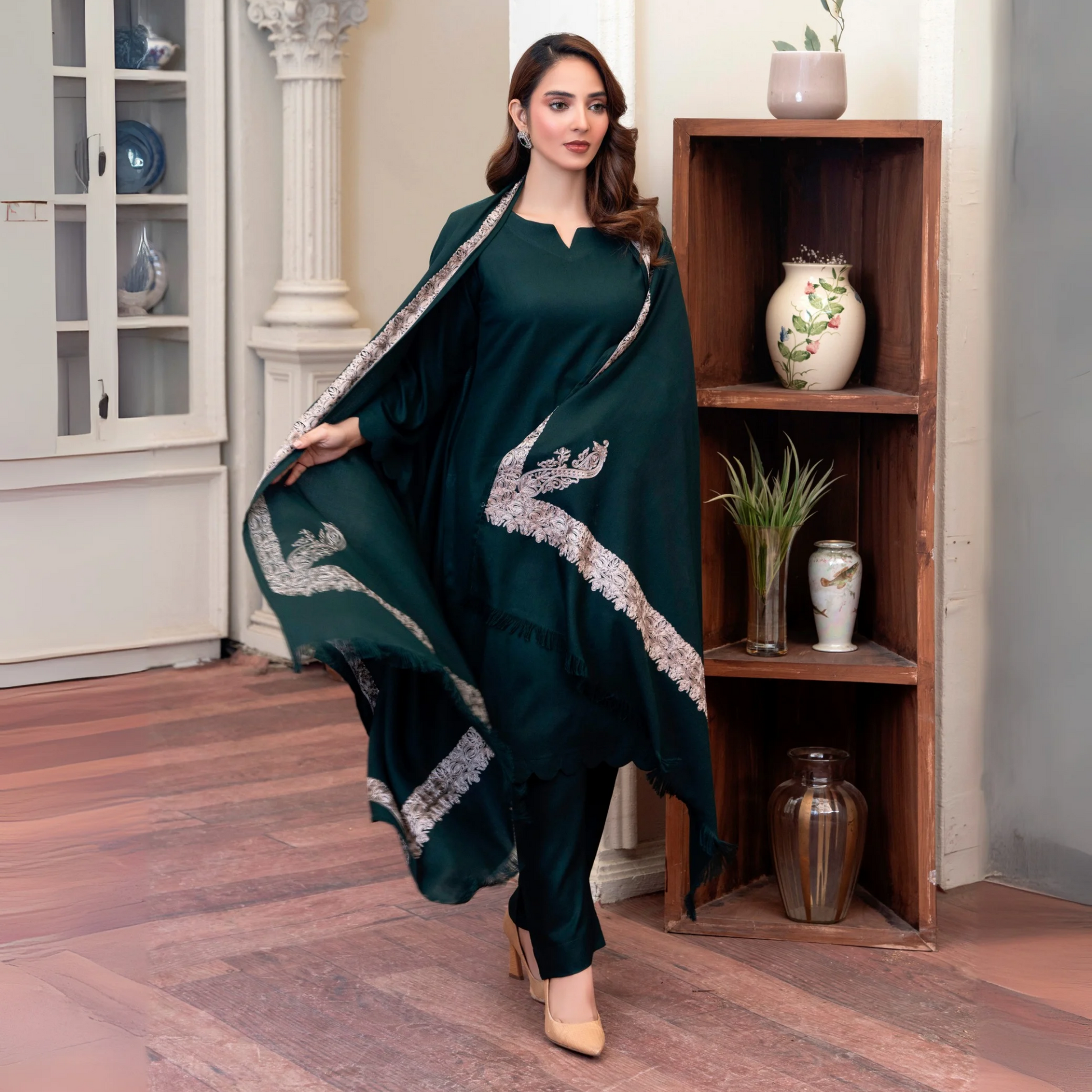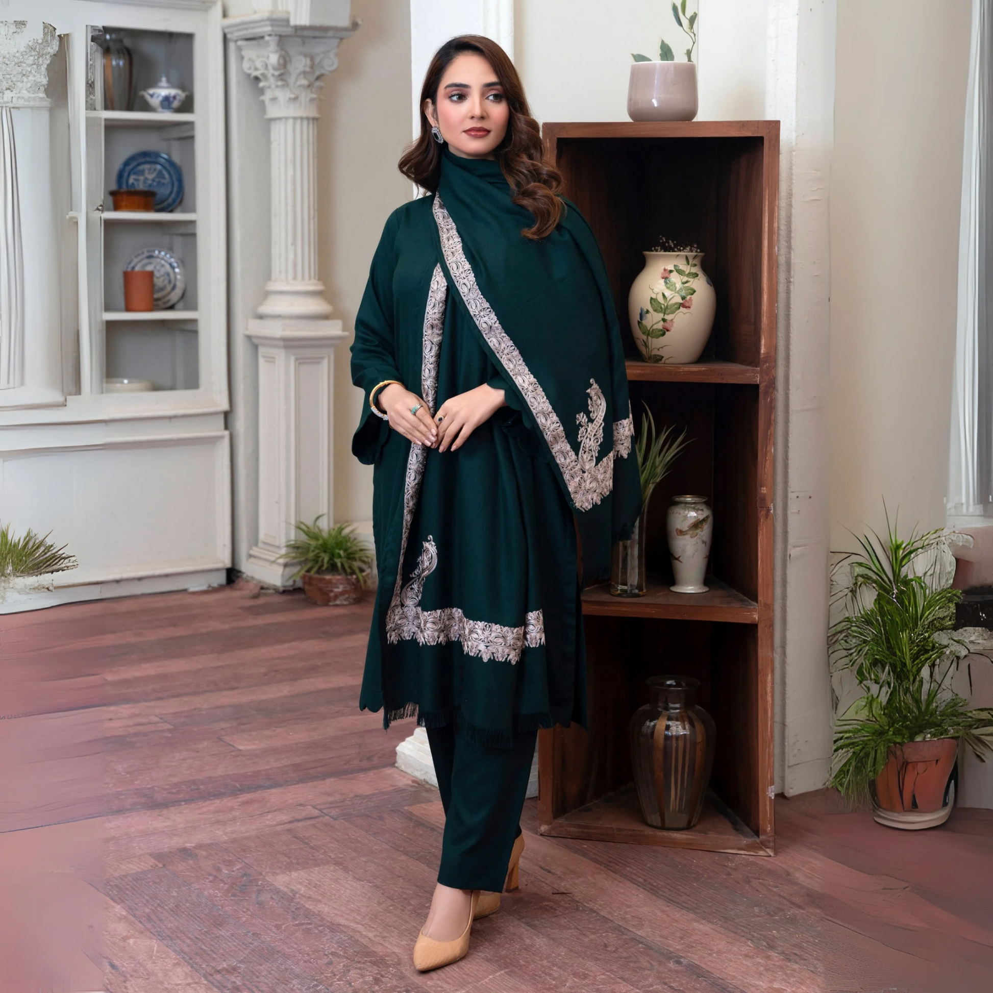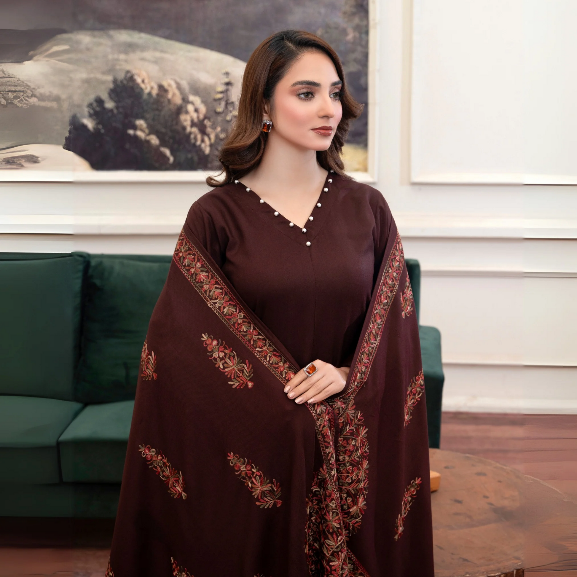 Introducing our stunning dress, made from luxurious Dhanak winter fabric. This dress is complemented by an intricately embroidered shawl, adding a touch of elegance. The shirt is designed in a chic stitching style, ensuring both comfort and fashion for the colder months.