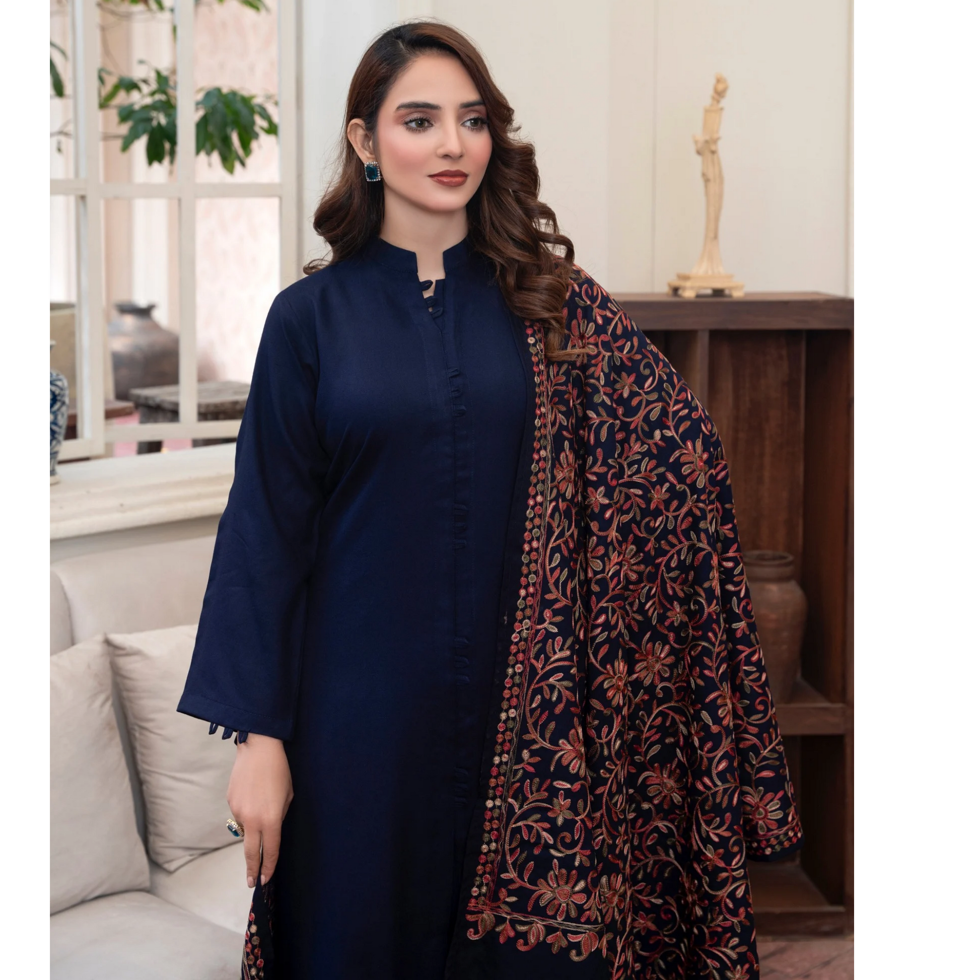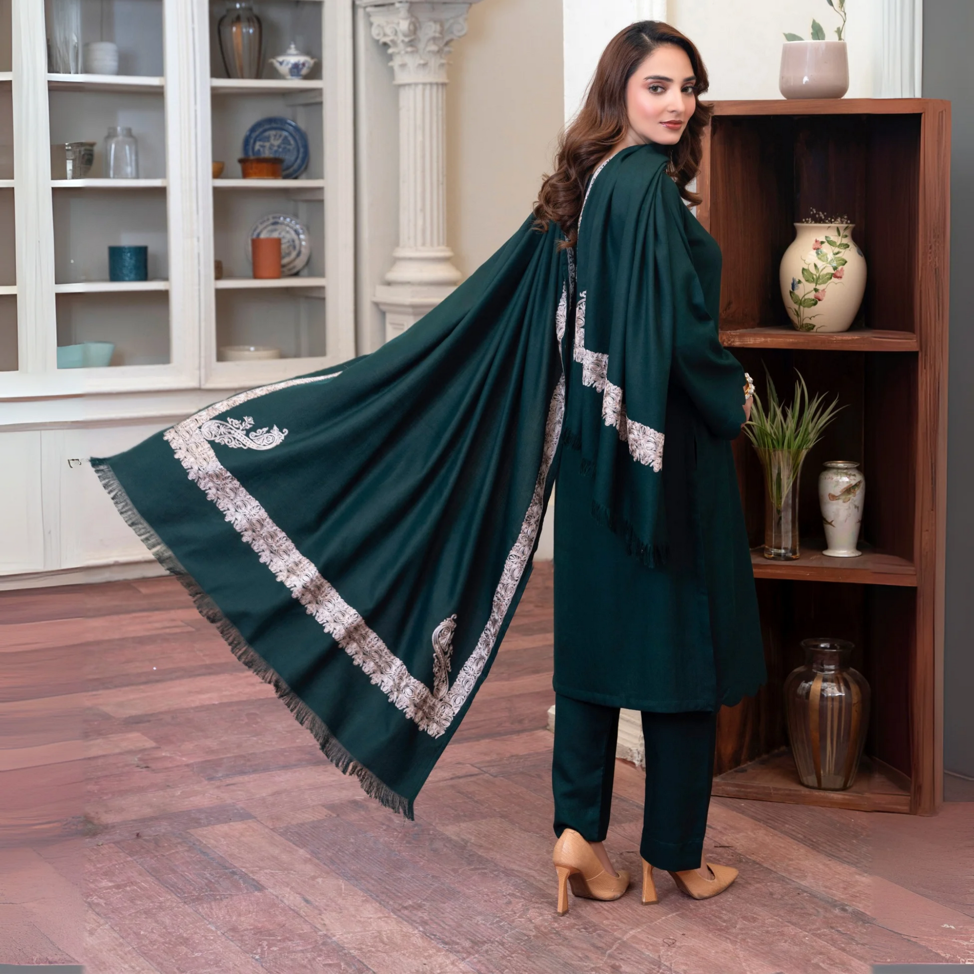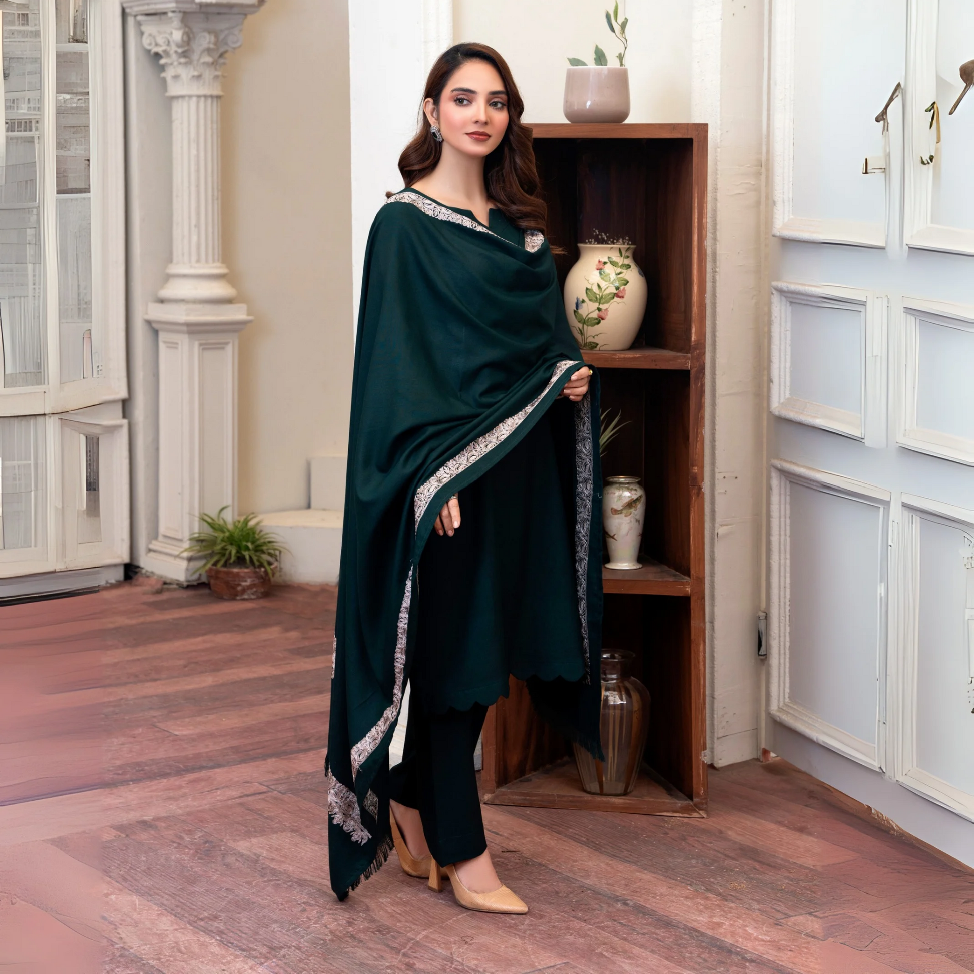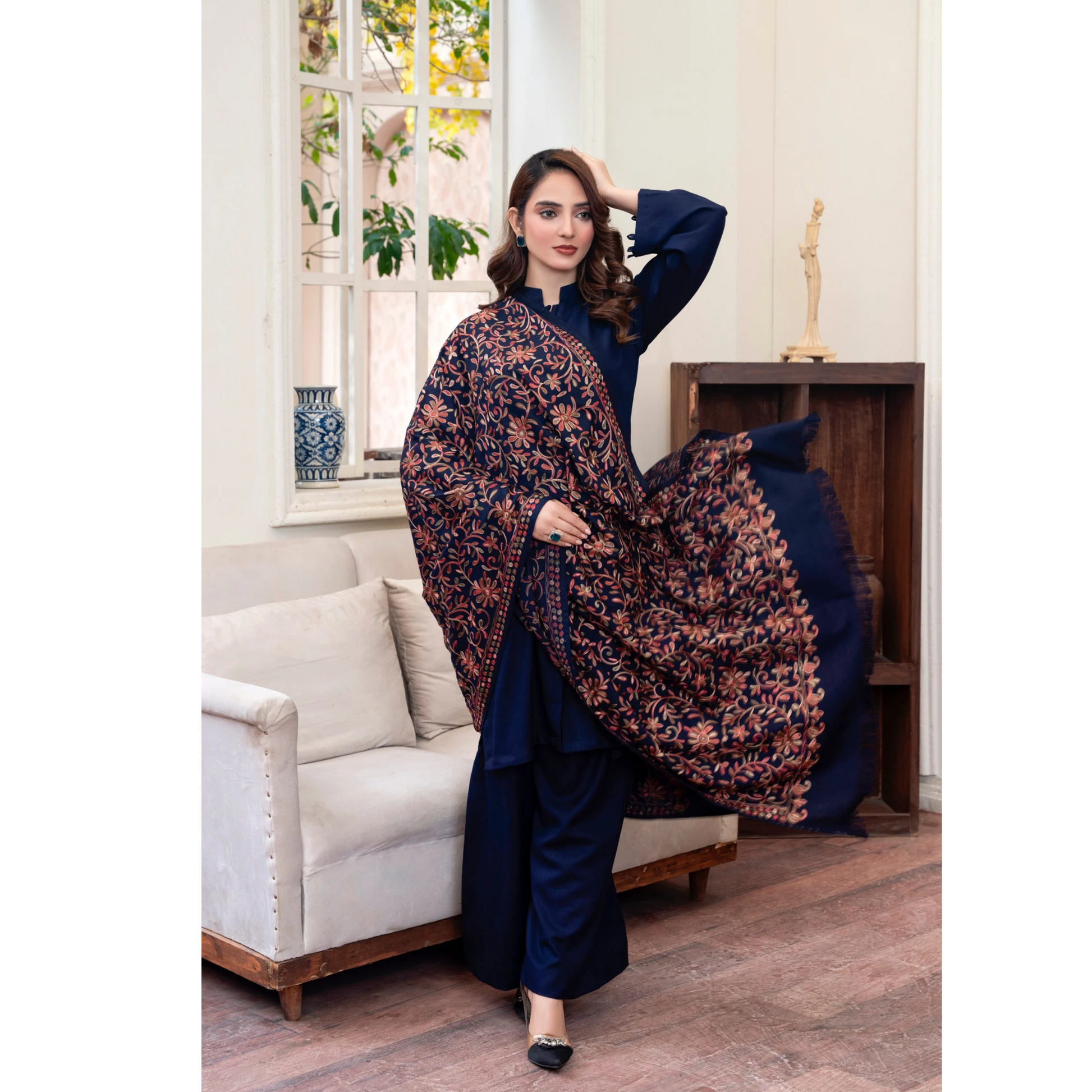 Introducing our stunning dress, made from luxurious Dhanak winter fabric. This dress is complemented by an intricately embroidered shawl, adding a touch of elegance. The shirt is designed in a chic stitching style, ensuring both comfort and fashion for the colder months.