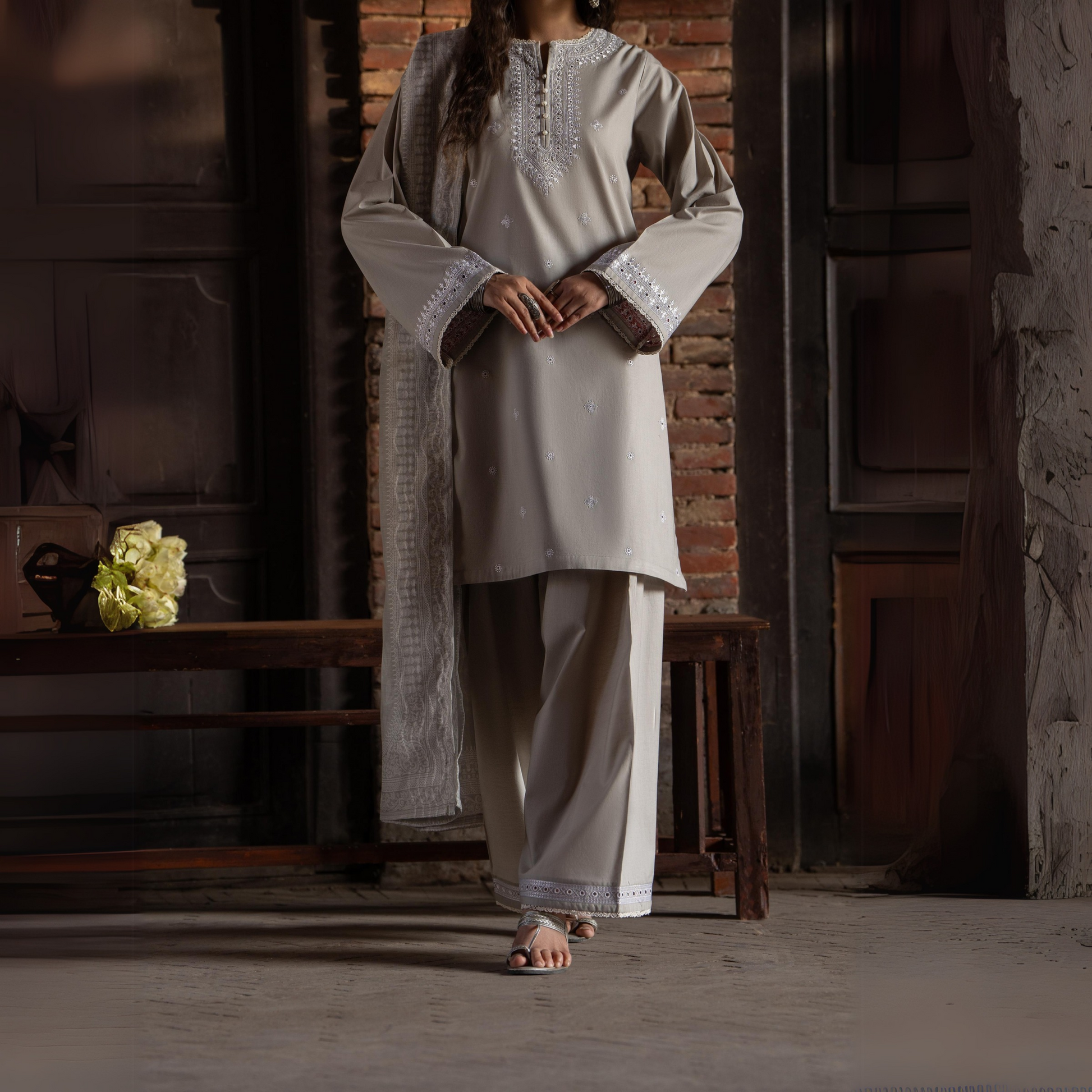 Elegant Cambric Cotton Three-Piece Suit with Silk Dupatta – Perfect Blend of Style and Comfort