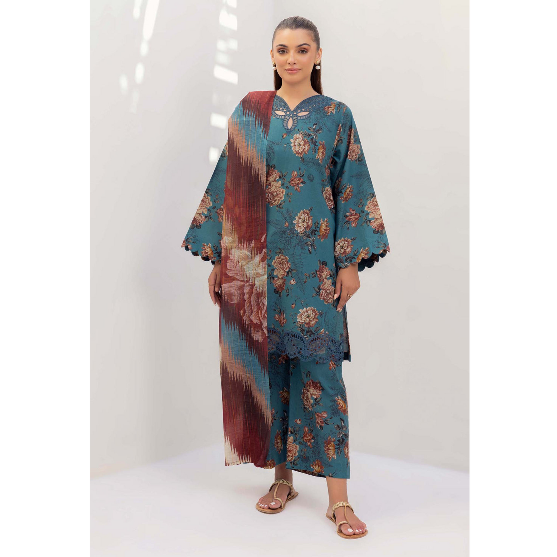 Discover elegance with our stunning Embroidered Printed Khaddar Shirt/Kameez dress, adorned with delicate embroidery on the neckline, sleeves, and daman Paired with matching Printed Khaddar Trouser and Printed Chiffon dupatta.