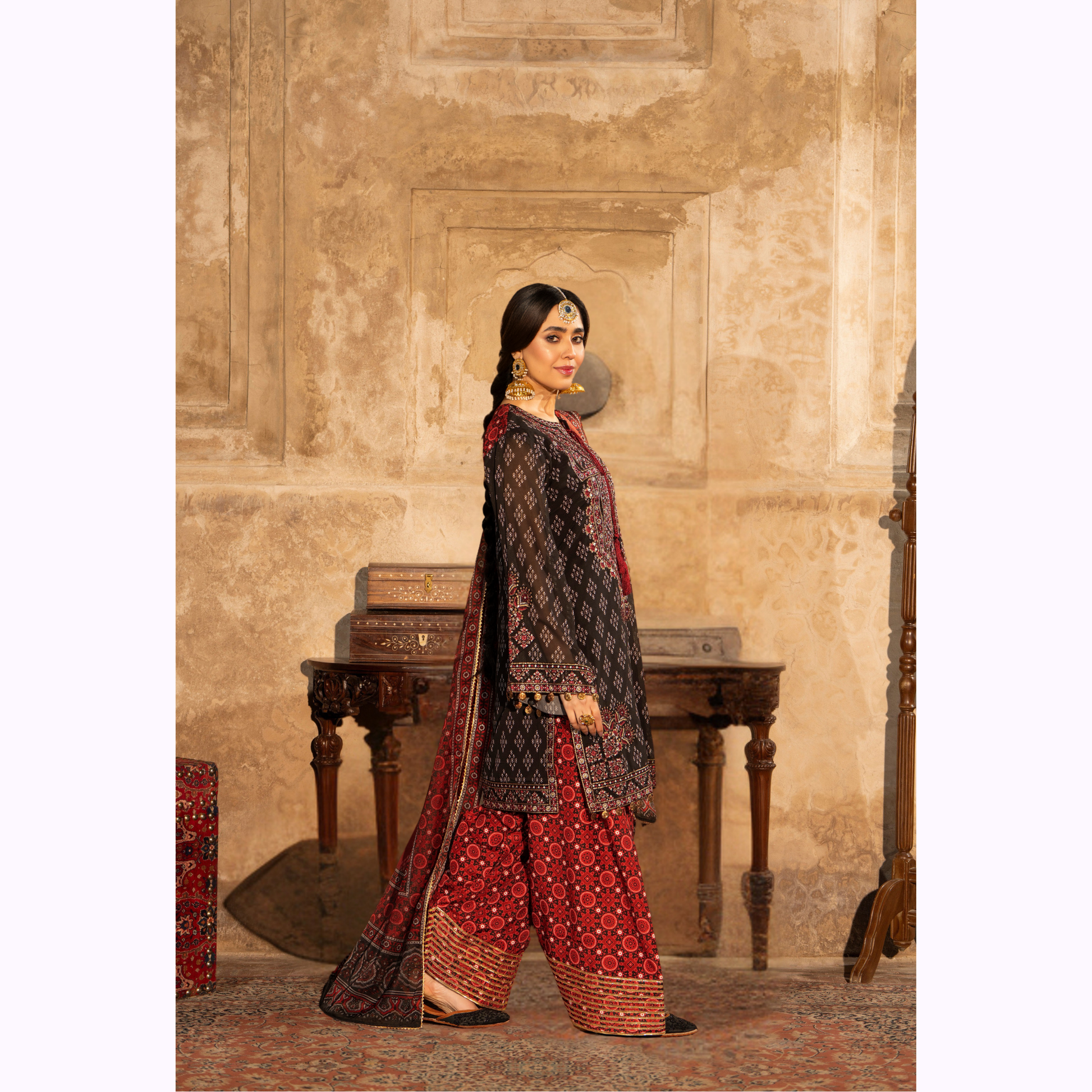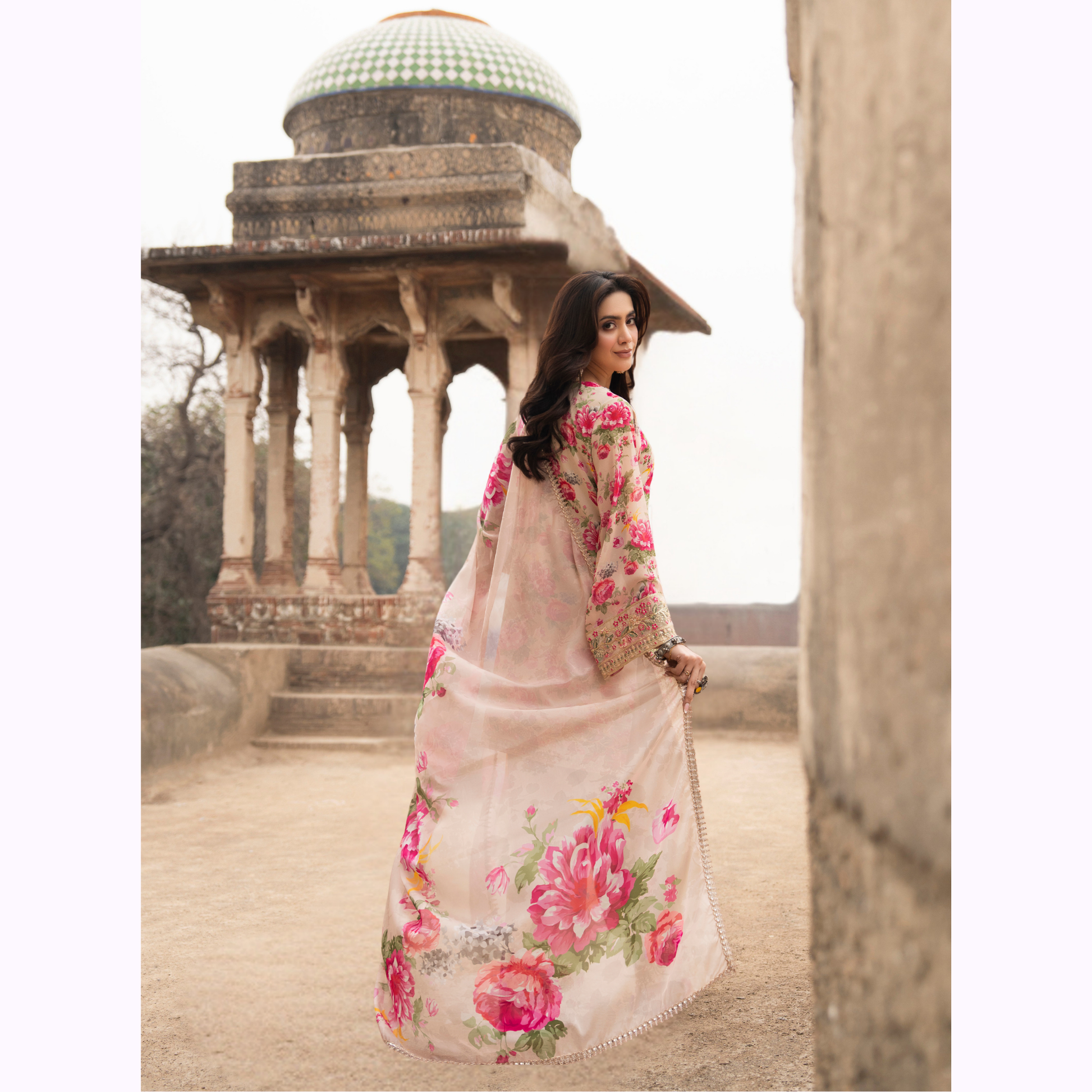 The collection offers a mix of embroidered and printed trousers, including trendy Farshi Shalwars or sharara in selected designs, adding a graceful and traditional touch. Each outfit is paired with a complementing Printed Dupatta enhancing the overall charm and femininity of every look.