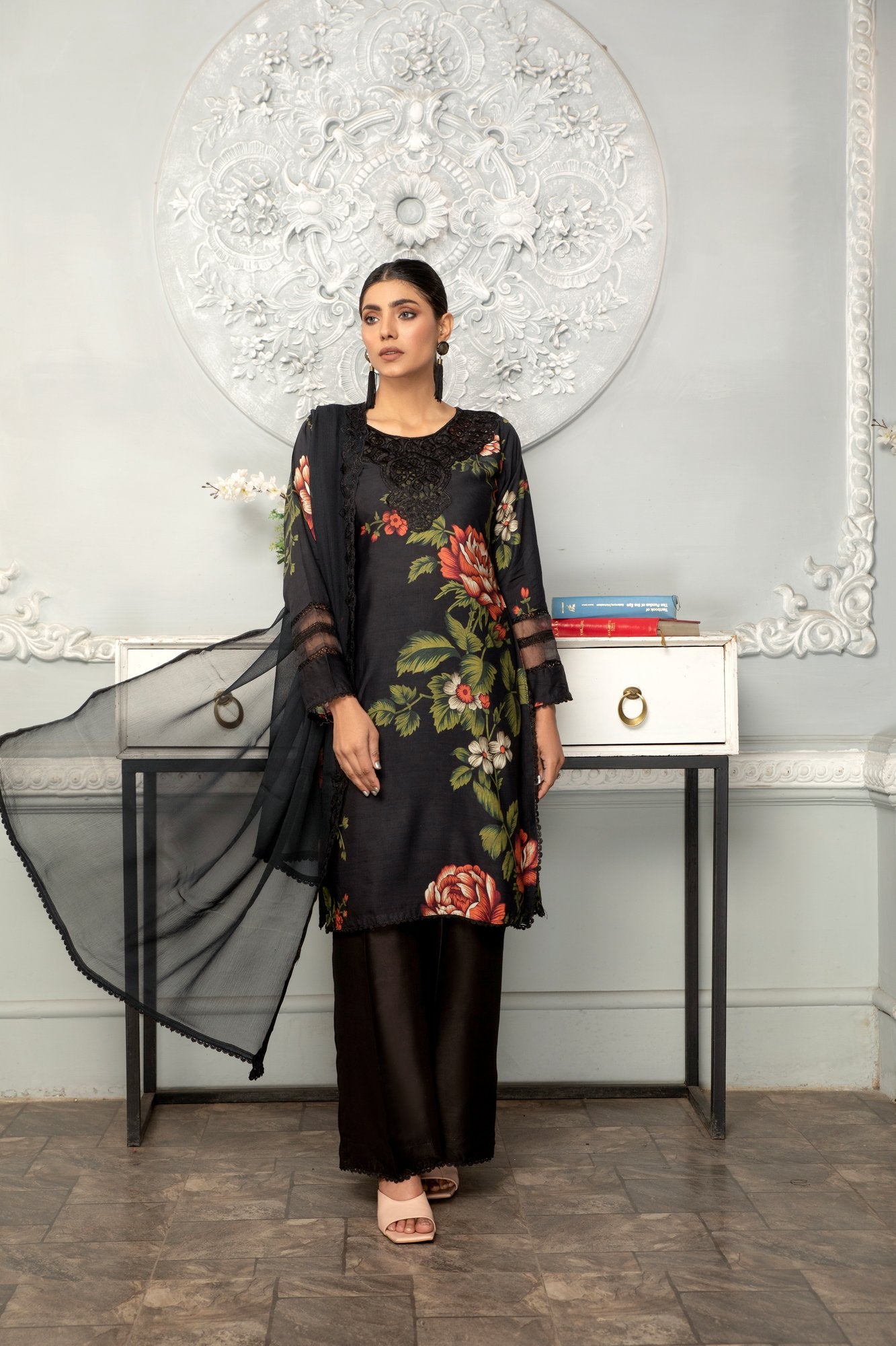 Black | Floral Printed Embroidered Linen | 3 Pc | Ready-to-wear Dress - Simrans