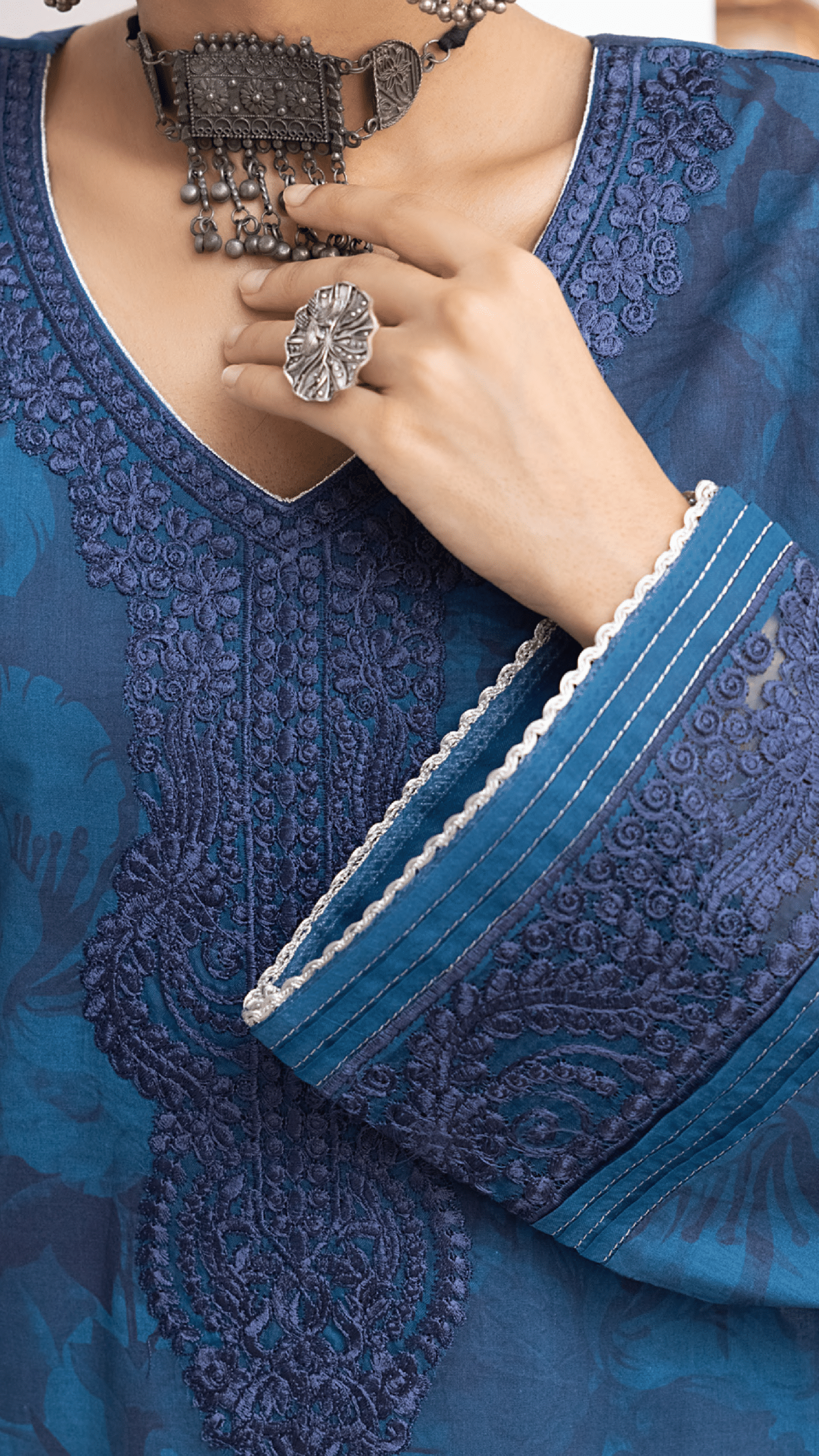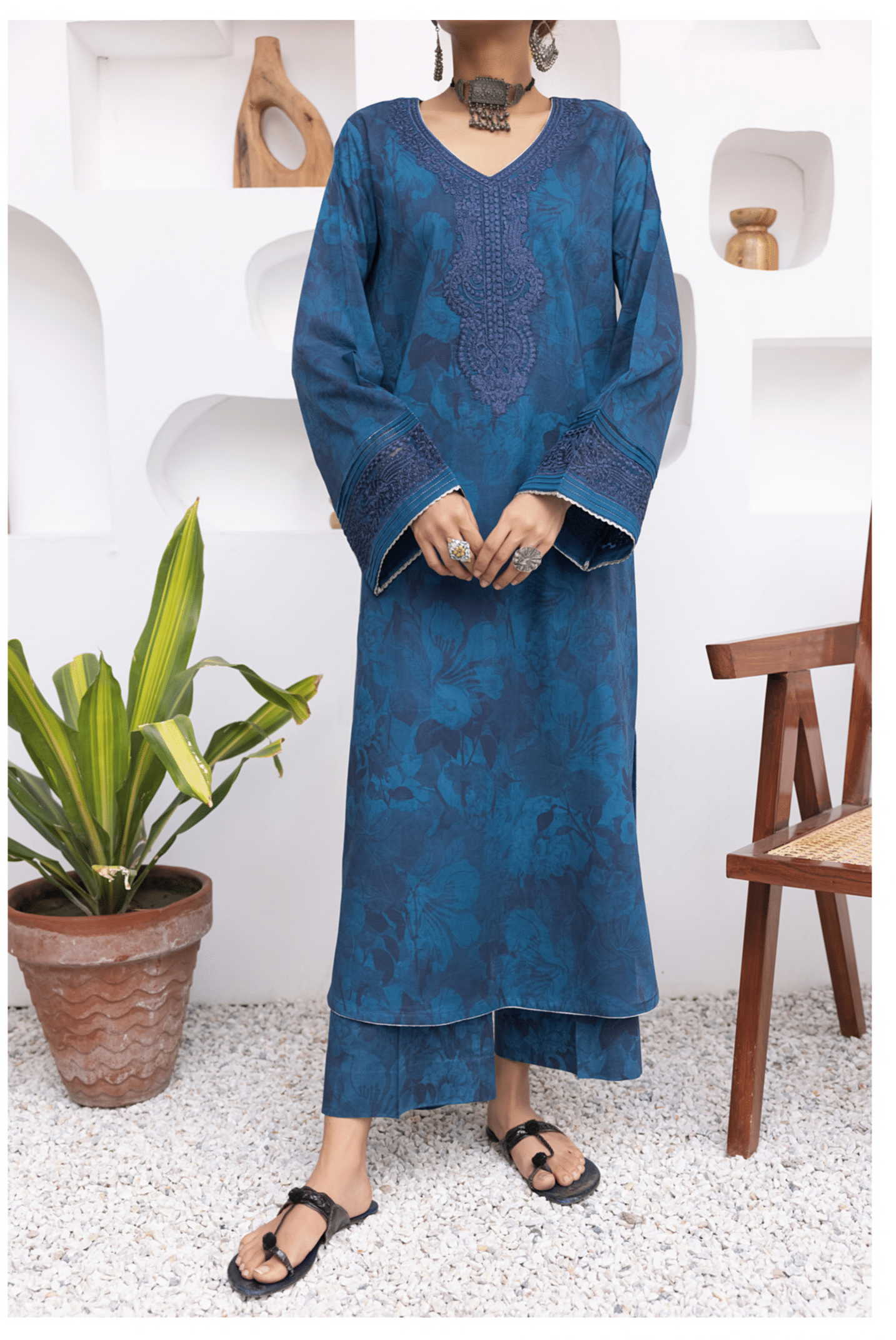 Blue 2 Pc Embroidered Printed Cotton Lawn Solid Outfit - Casuallite