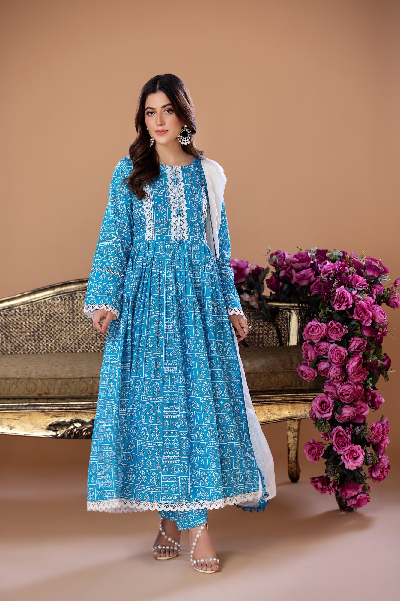 (Blue) 3 Pc Printed Cambric Cotton Long Frock - Heera's