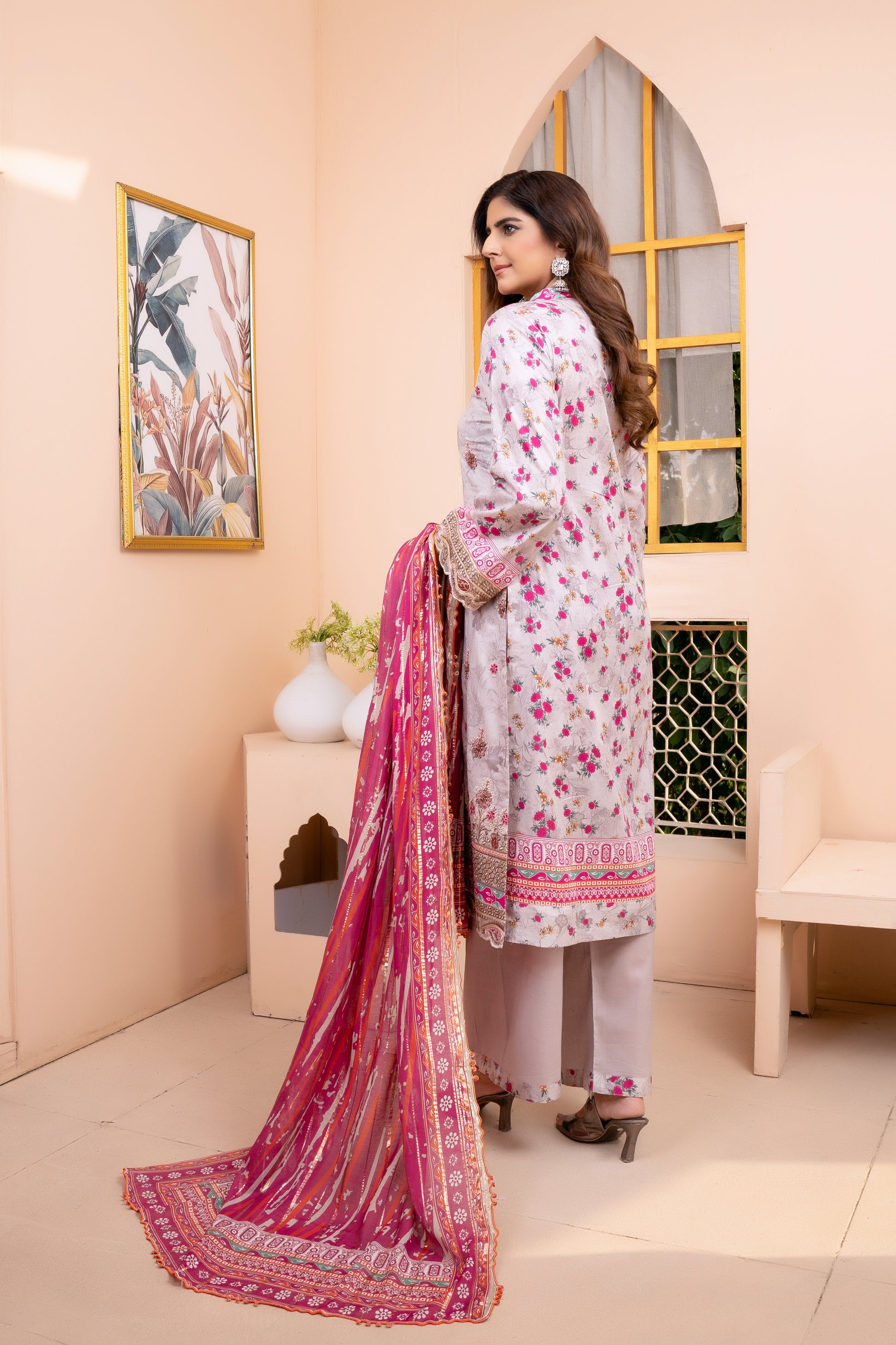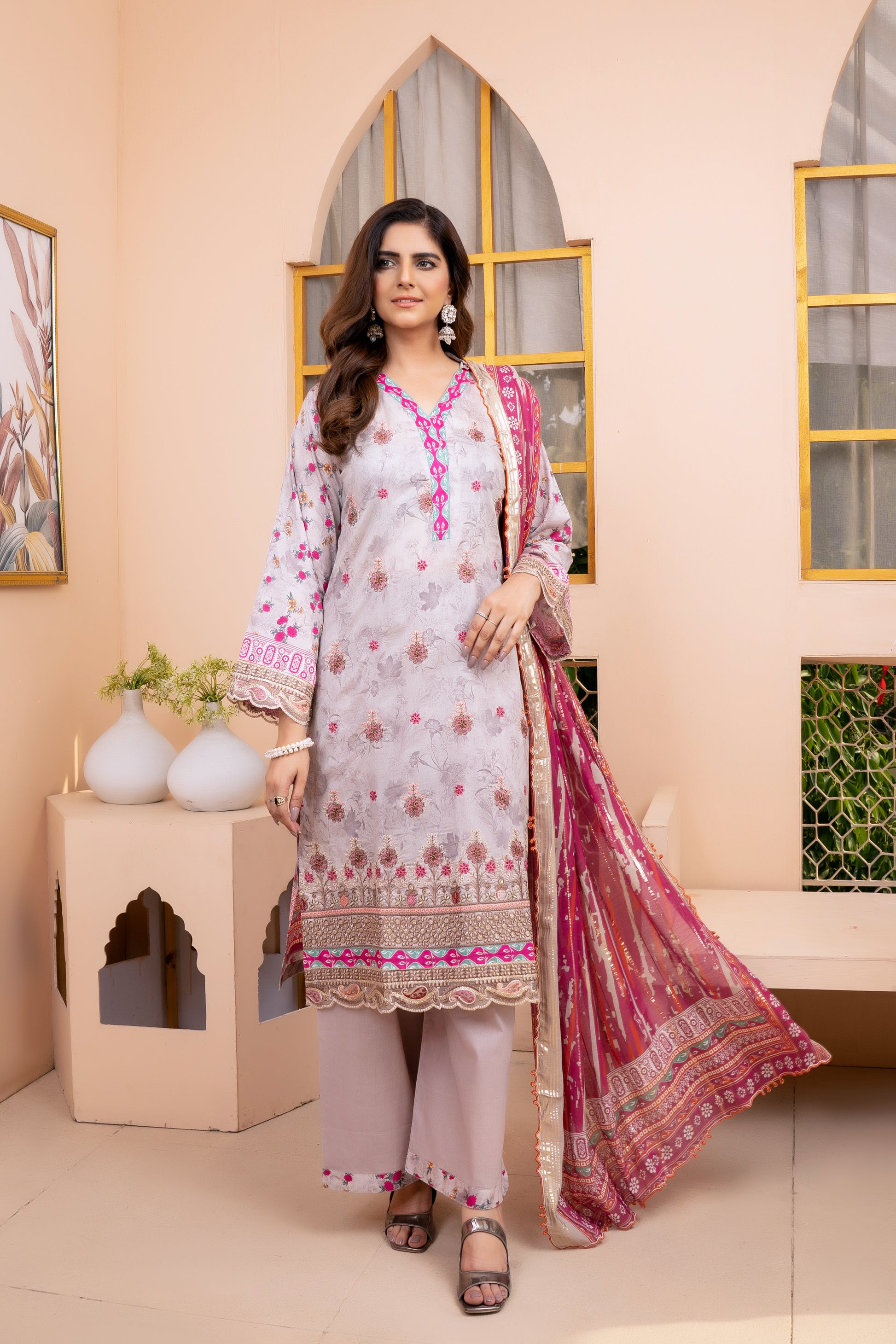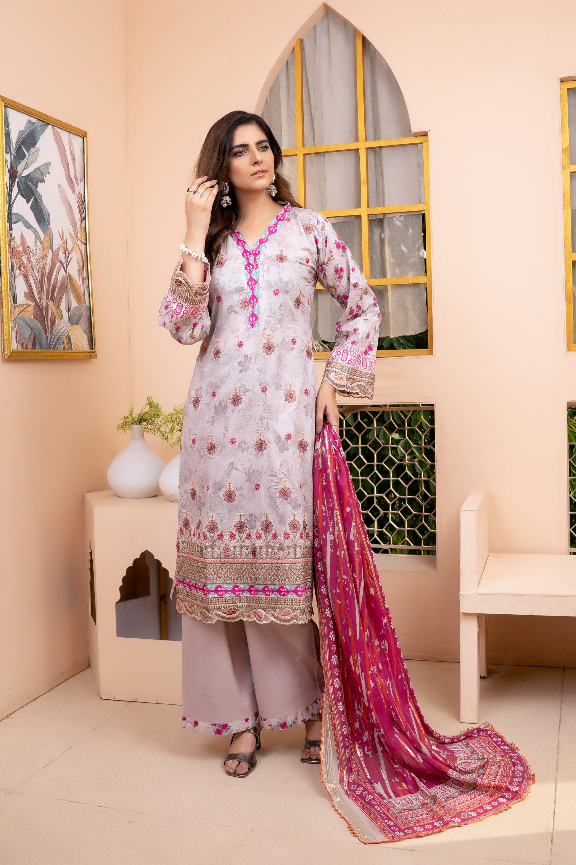 (Pinkish Grey) 3Pc Printed Embroidered Lawn Dress by MUNIRA