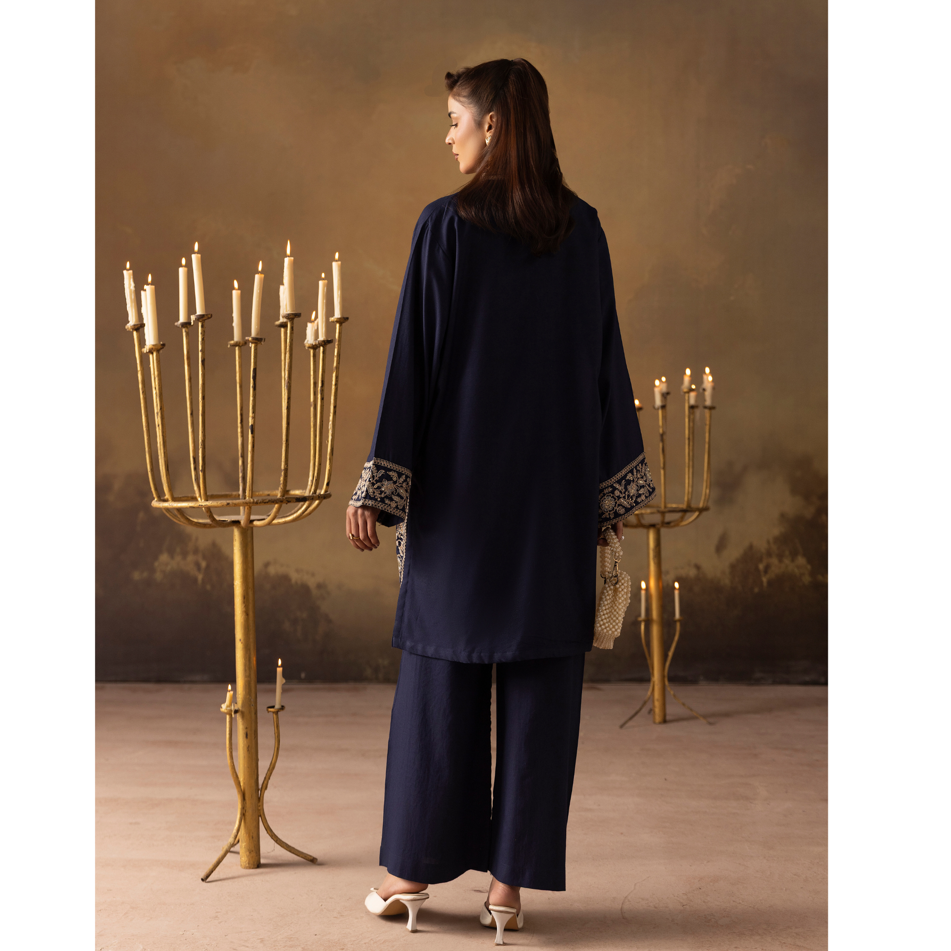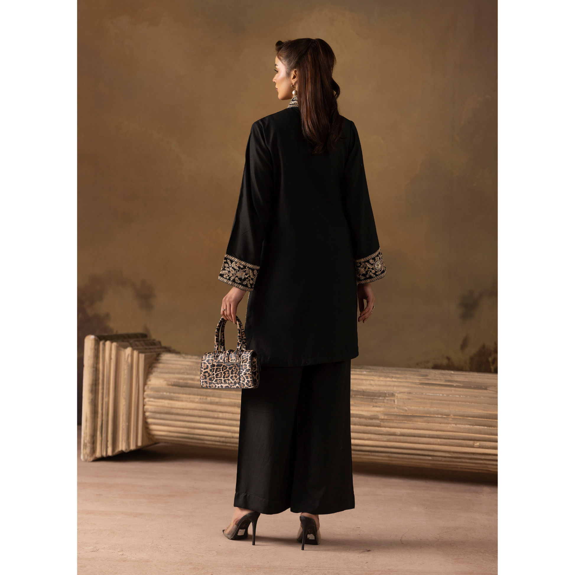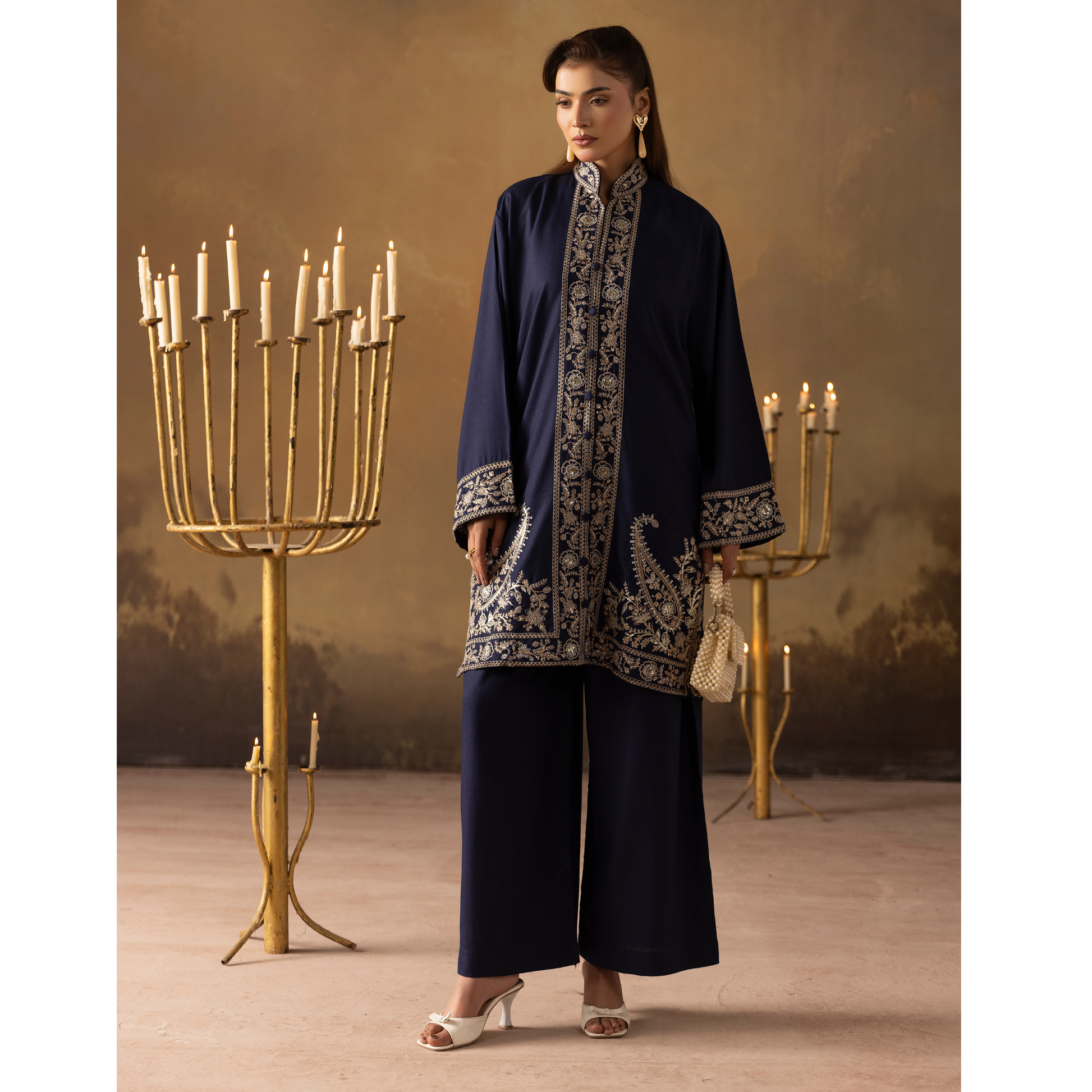 This elegant 2-piece set is crafted from premium winter Dhanak fabric, offering warmth with a graceful fall. The straight shirt features rich antique-gold embroidery along the neckline, front panel, sleeves, and hem, inspired by classic traditional motifs. Paired with matching straight trousers, the look is balanced and refined. Available in black, Teal Blue, and navy, this collection is perfect for formal winter wear and festive evenings.