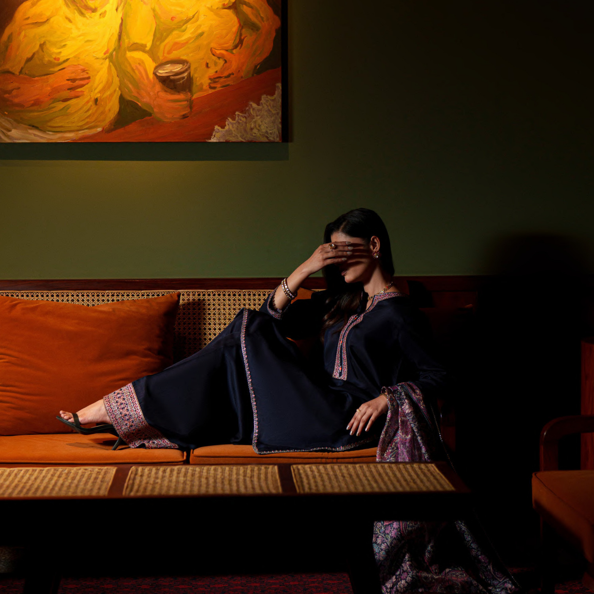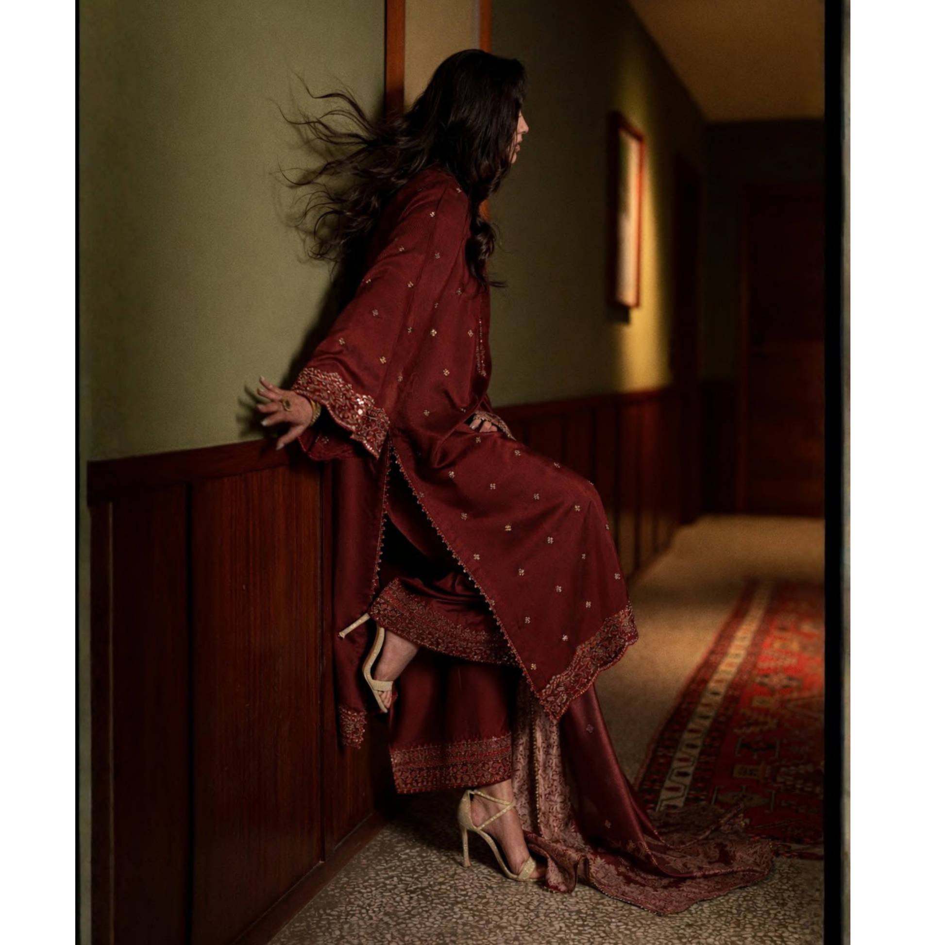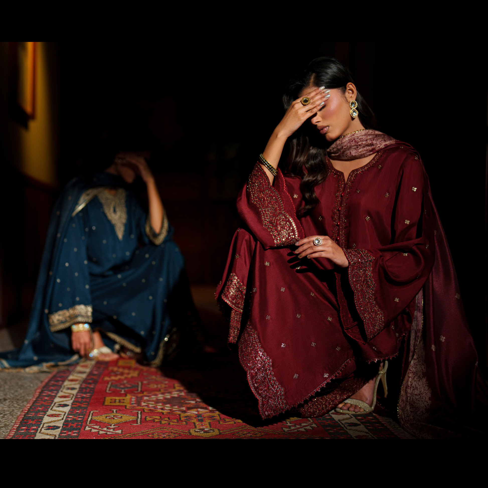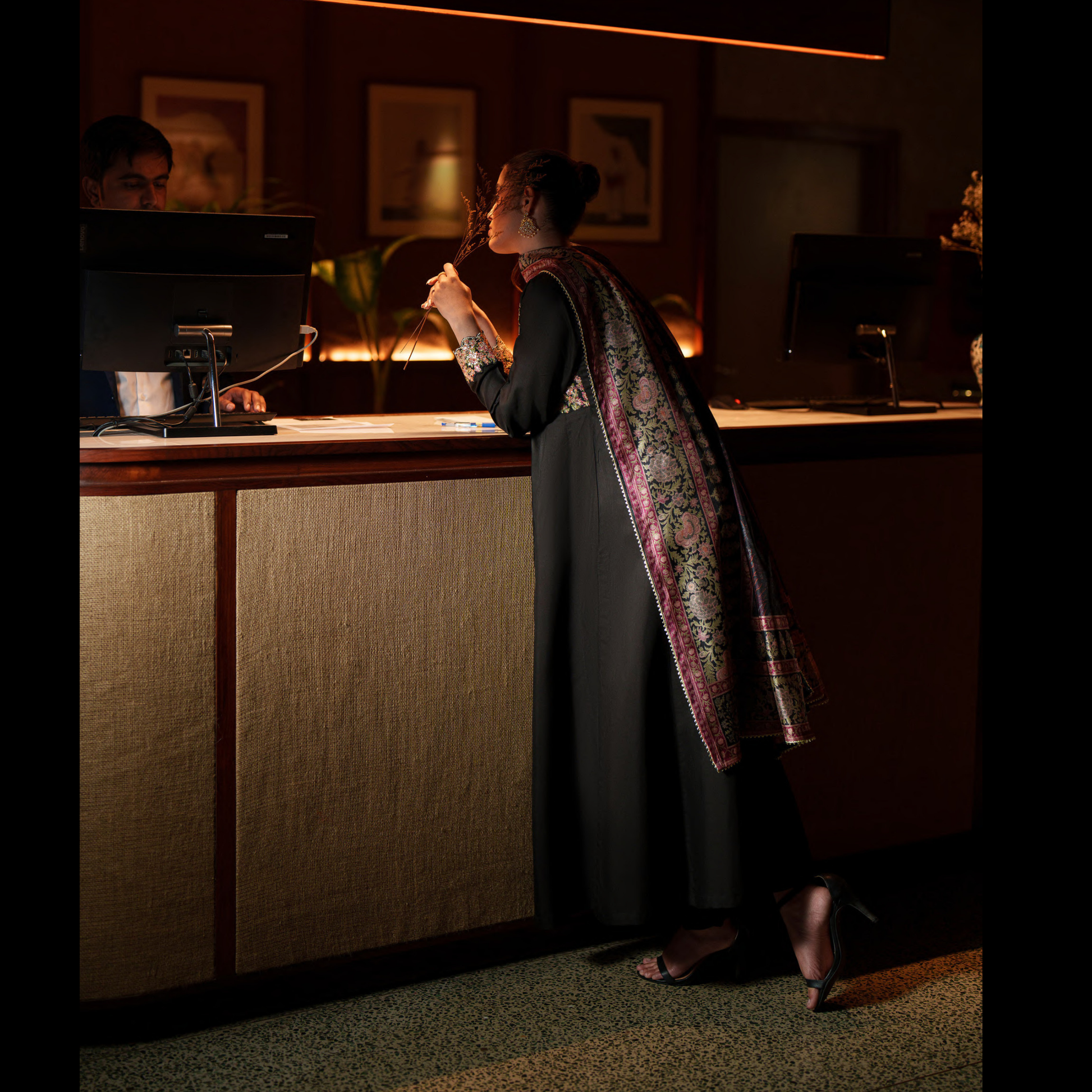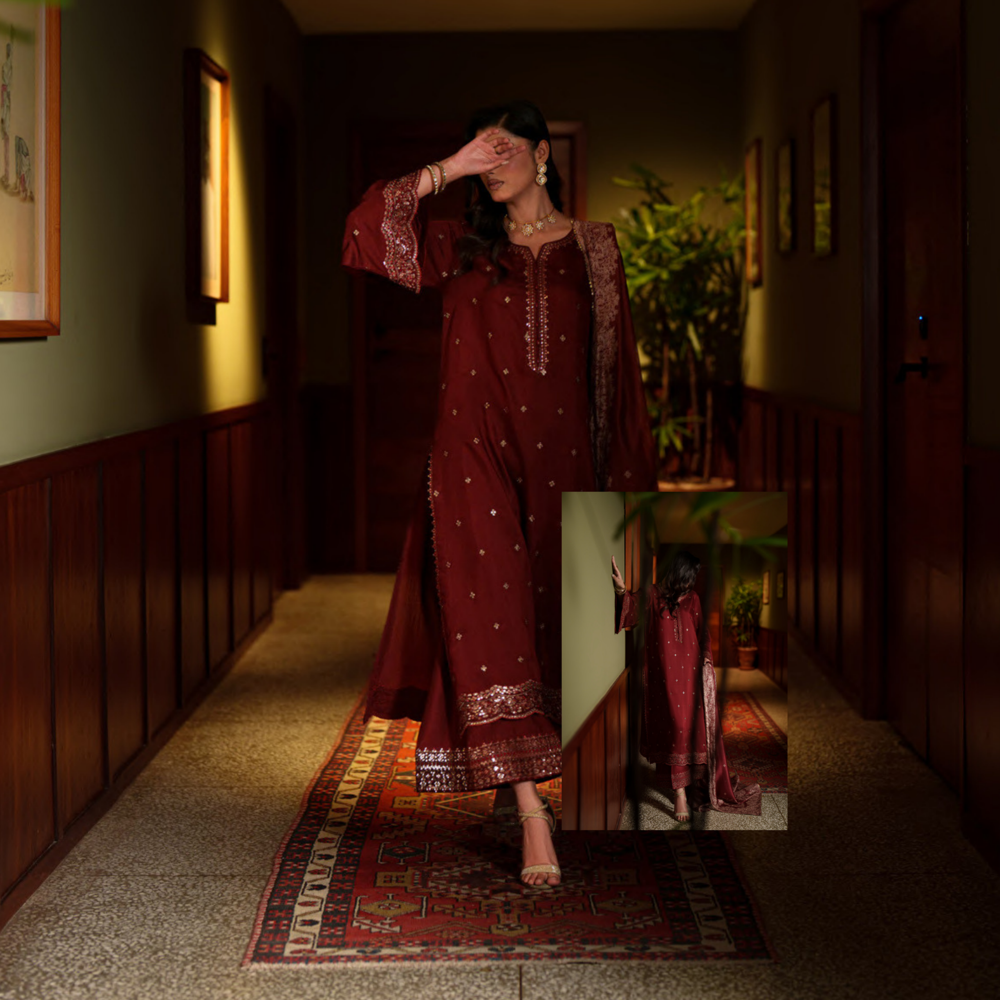 Introducing ELARA Luxury Festive ’26 Collection by Casuallite. A timeless celebration of elegance and refined craftsmanship, this embroidered viscose dress paired with a printed silk dupatta is designed to make every festive moment unforgettable. Crafted from premium quality viscose fabric, the shirt features intricate embroidery across the neckline, front panel, and sleeves, enhanced with delicate detailing that adds depth and richness to the overall look. The soft, breathable texture of viscose ensures comfort while maintaining a graceful fall that flatters every silhouette.