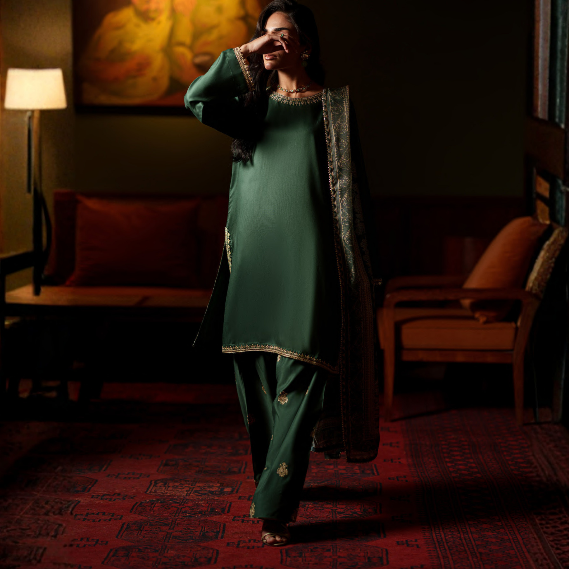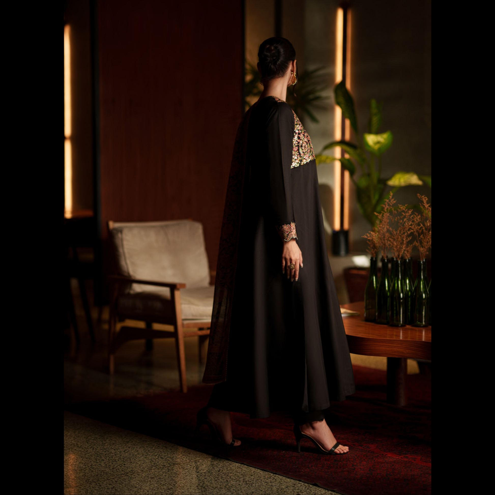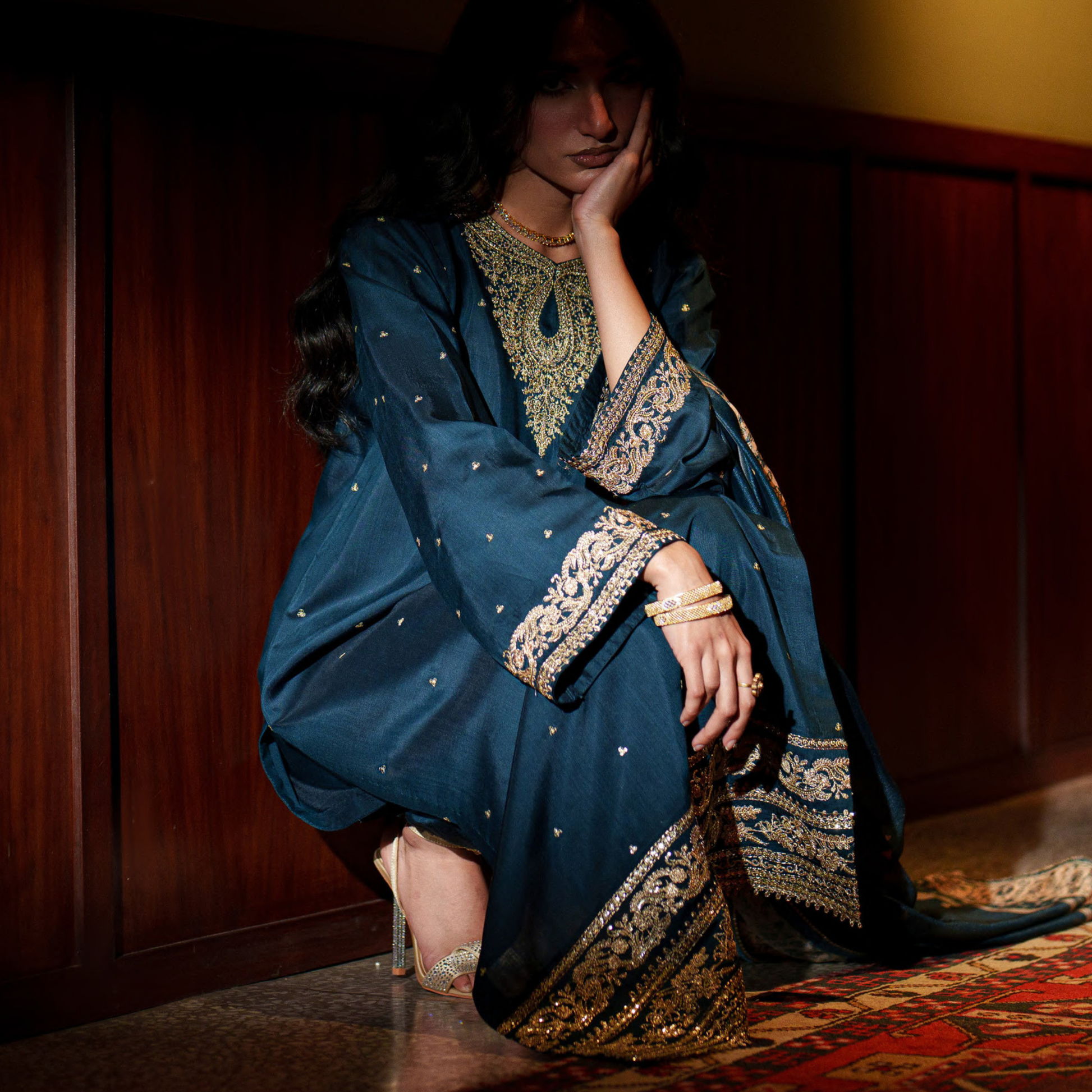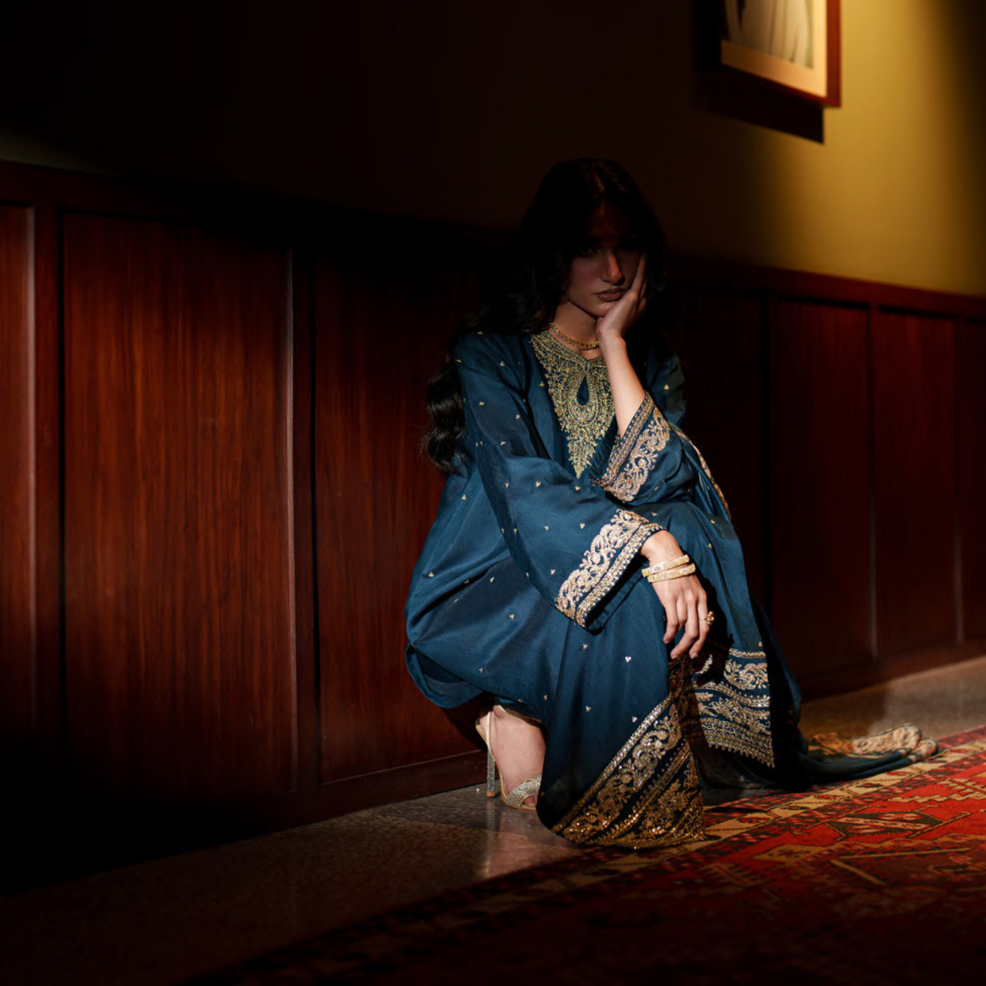 The ensemble is beautifully complemented by a luxurious printed silk dupatta, adorned with artistic patterns and a smooth, lustrous finish that elevates the outfit with a touch of sophistication. The contrast between the detailed embroidery and the fluid elegance of silk creates a perfect balance of tradition and modern charm. Ideal for festive gatherings, wedding events, and formal occasions, this outfit reflects premium craftsmanship, fine finishing, and attention to detail.