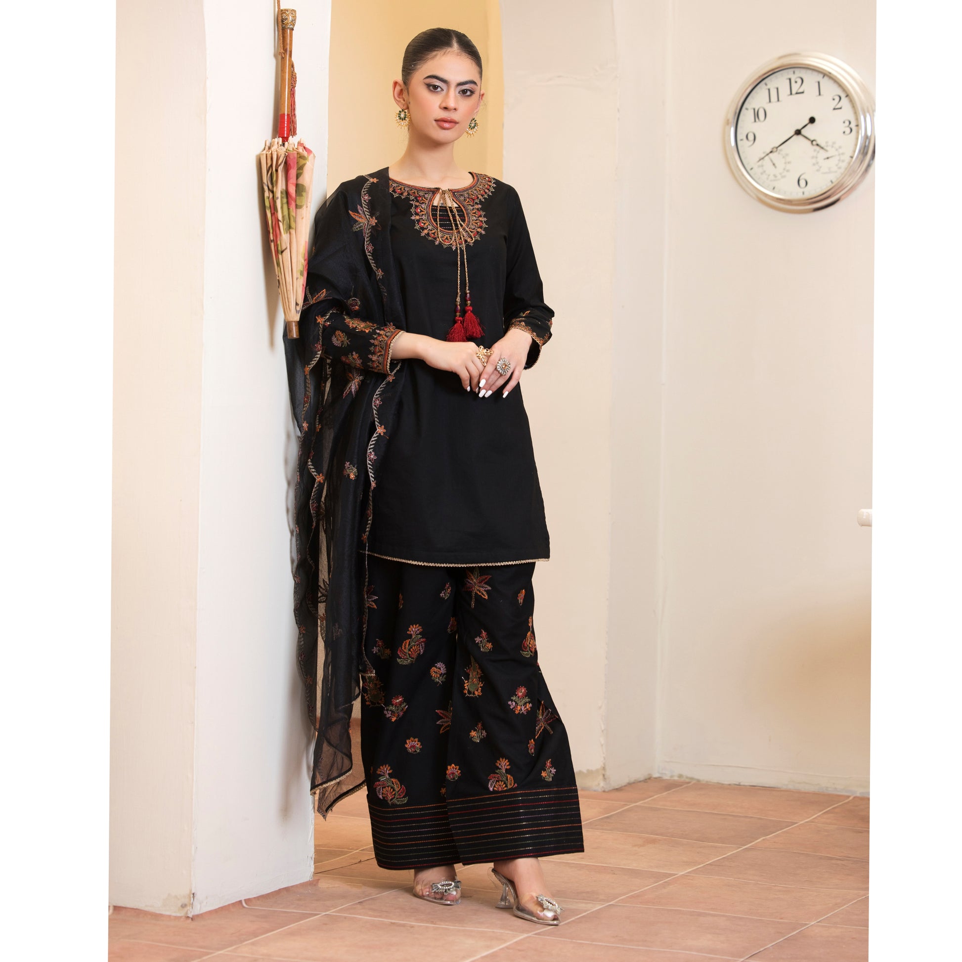 Intoducing beautiful three-piece traditional Cotton black/maroon ensemble that exudes elegance and cultural charm. The kameez features intricate embroidery around the neckline in shades of gold, red, and green, creating a beautifully ornate focal point. Two tassels hang from the neckline, adding a festive touch. The sleeves are full-length with embroidered cuffs that echo the design of the neckline.The wide-leg Farshi Shalwar pants are made of the same black cotton fabric and are adorned with colorful floral embroidery, giving the outfit a rich and coordinated look. The dupatta is lightweight and sheer, with embroidered borders that complement the rest of the attire, and it’s draped gracefully over one shoulder.This outfit is ideal for festive events, combining comfort with detailed craftsmanship.