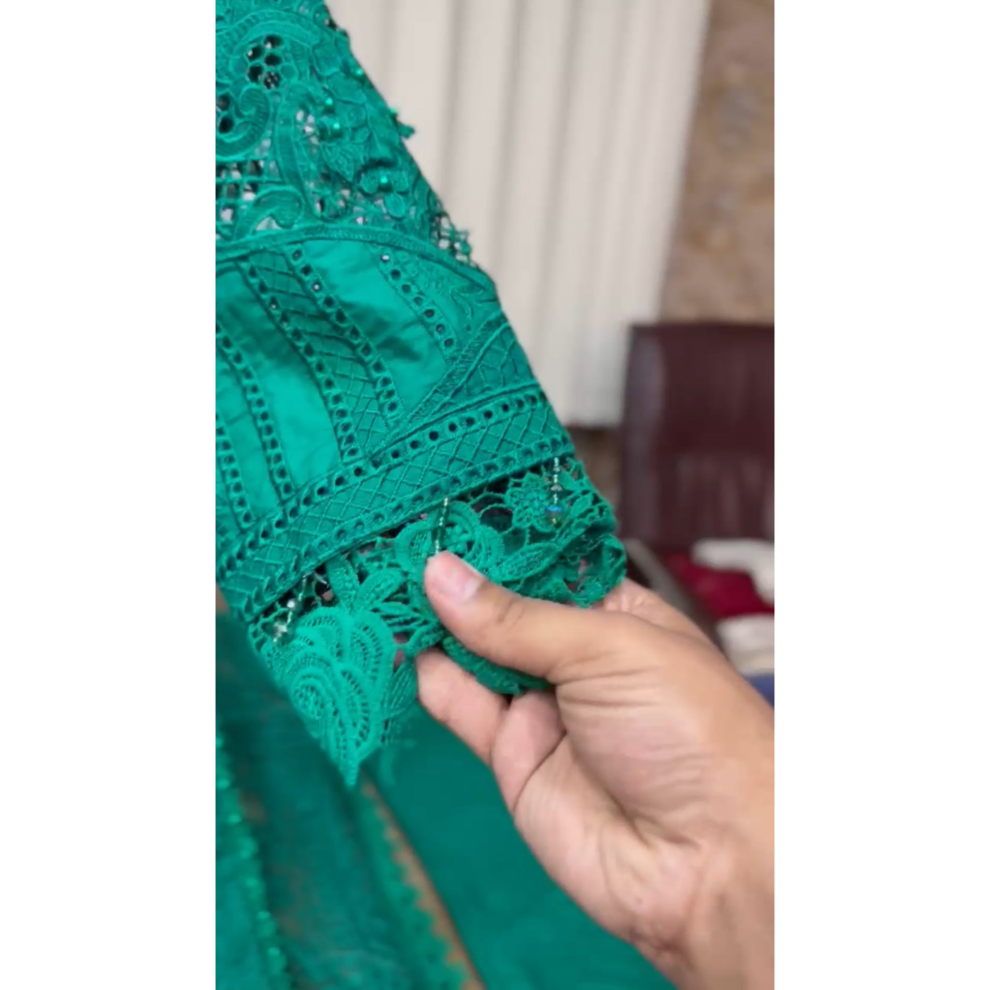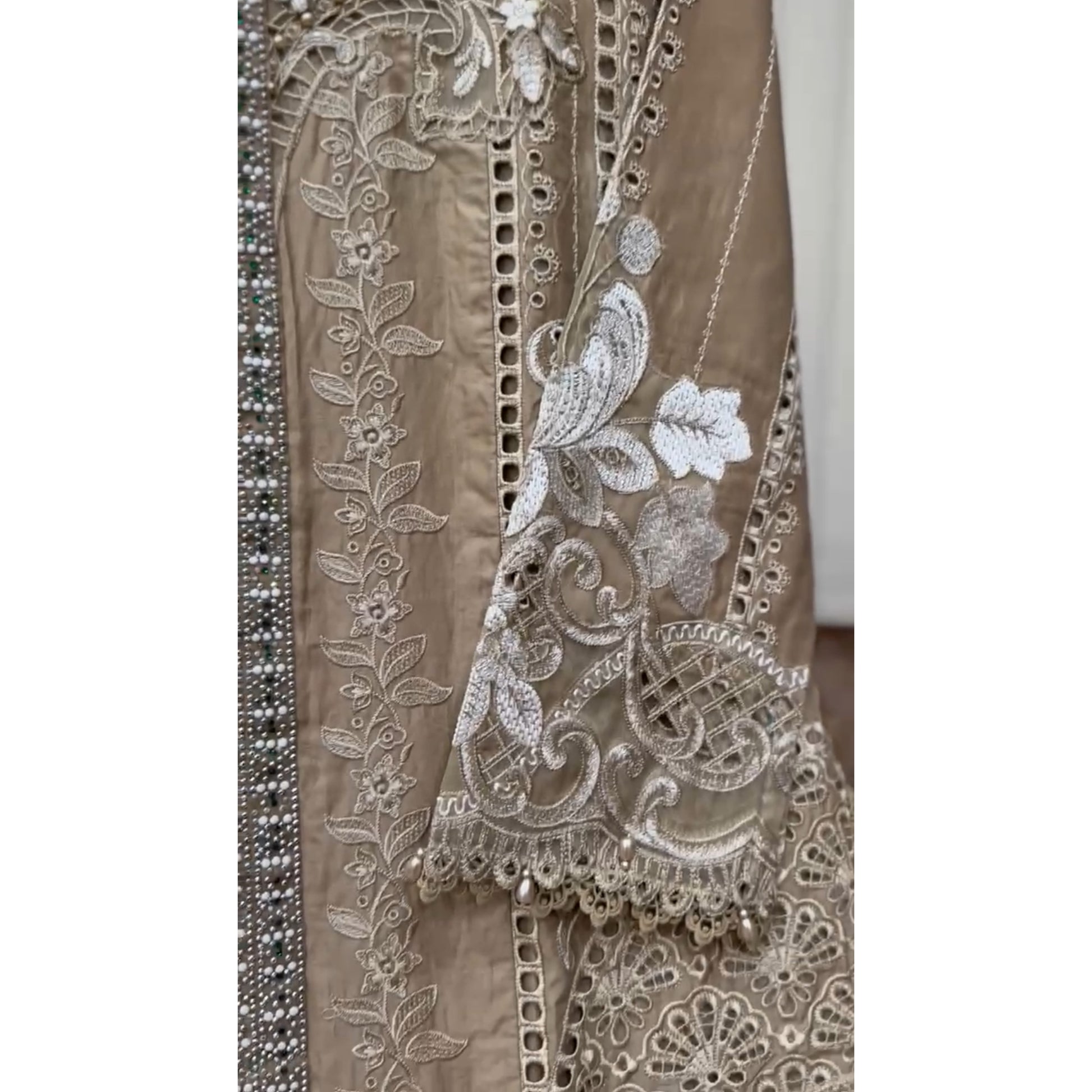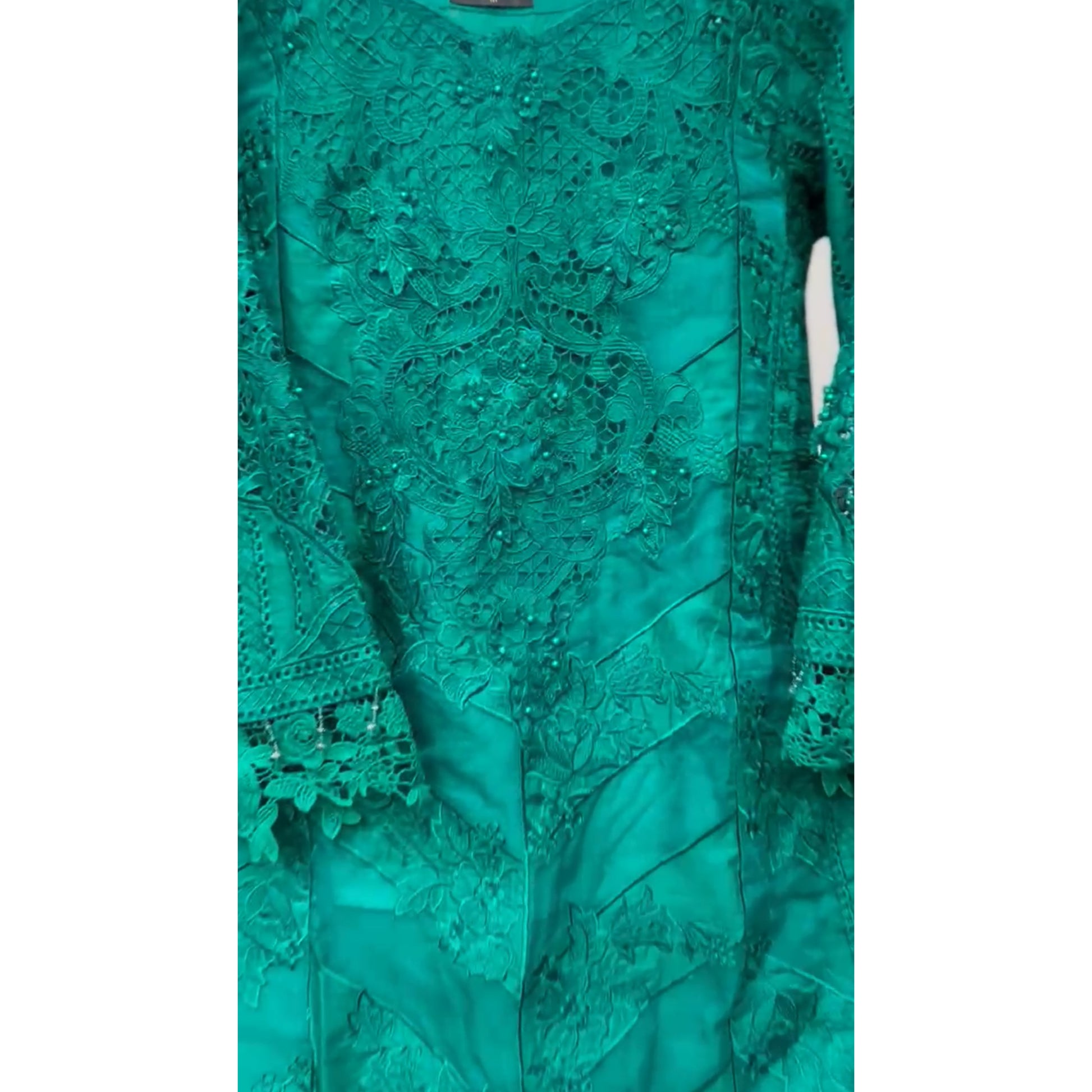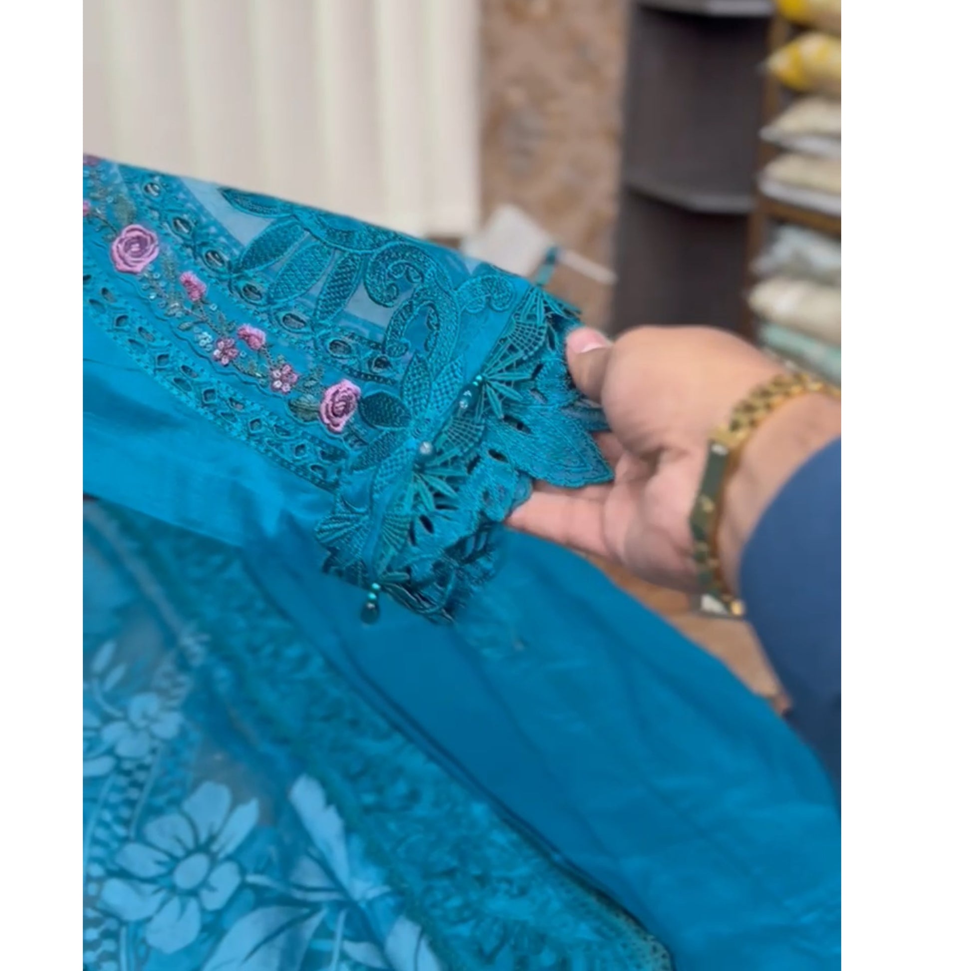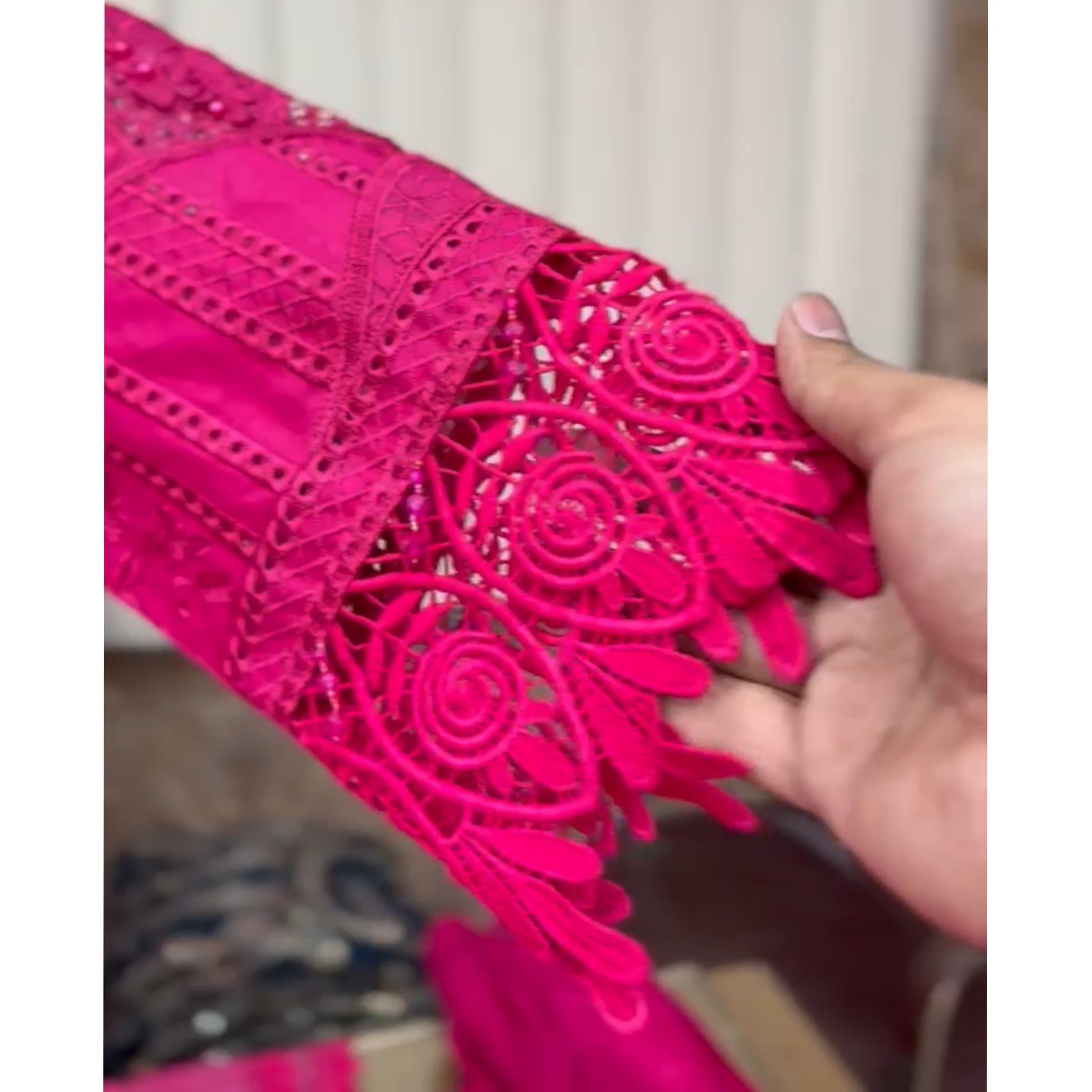 Introducing stunning Luxury Lawn suit featuring intricate embroidery throughout the front. The shirt is adorned with elegant threadwork and delicate cutwork around the neckline and hem, adding a refined touch. Paired with straight-cut matching trousers, the look is completed with a beautifully embroidered Printed dupatta that adds a sheer, graceful charm. The overall ensemble exudes a festive and sophisticated vibe, perfect for summer occasions.