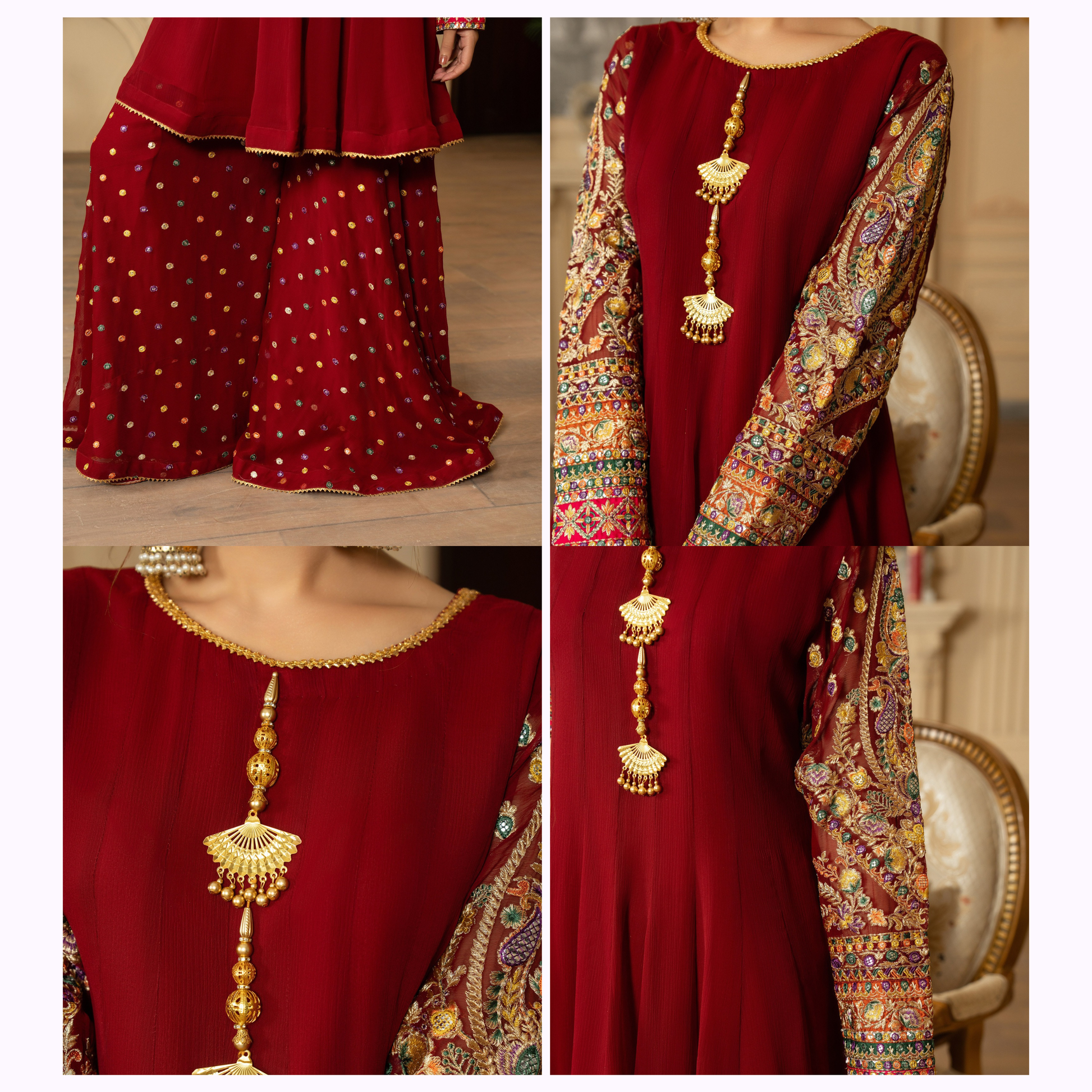 The collection offers embroidered Sharara in thIs designs, adding a graceful and traditional touch. Each outfit is paired with a complementing Embroidered Crinkle Dupatta enhancing the overall charm and femininity of every look.