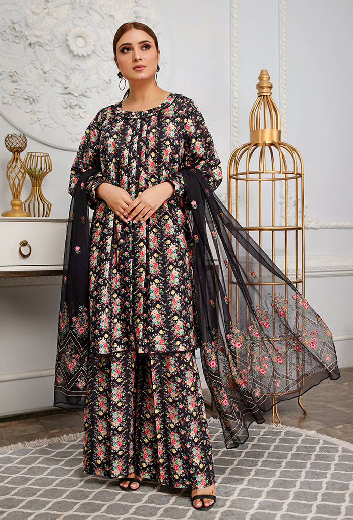 This set includes a printed lawn kameez and printed lawn trousers, complemented by an embroidered chiffon dupatta for a graceful and elegant ensemble.