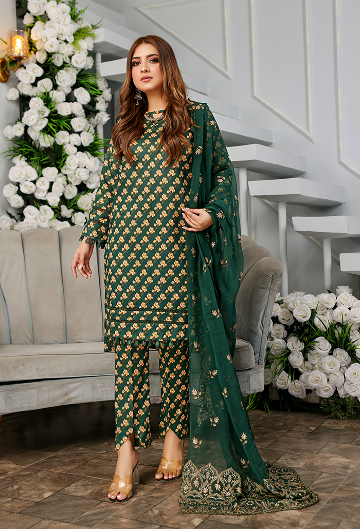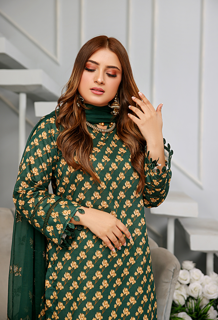 This ensemble features a printed lawn kameez paired with printed lawn trousers, enhanced by an embroidered chiffon dupatta for a sophisticated and polished look.