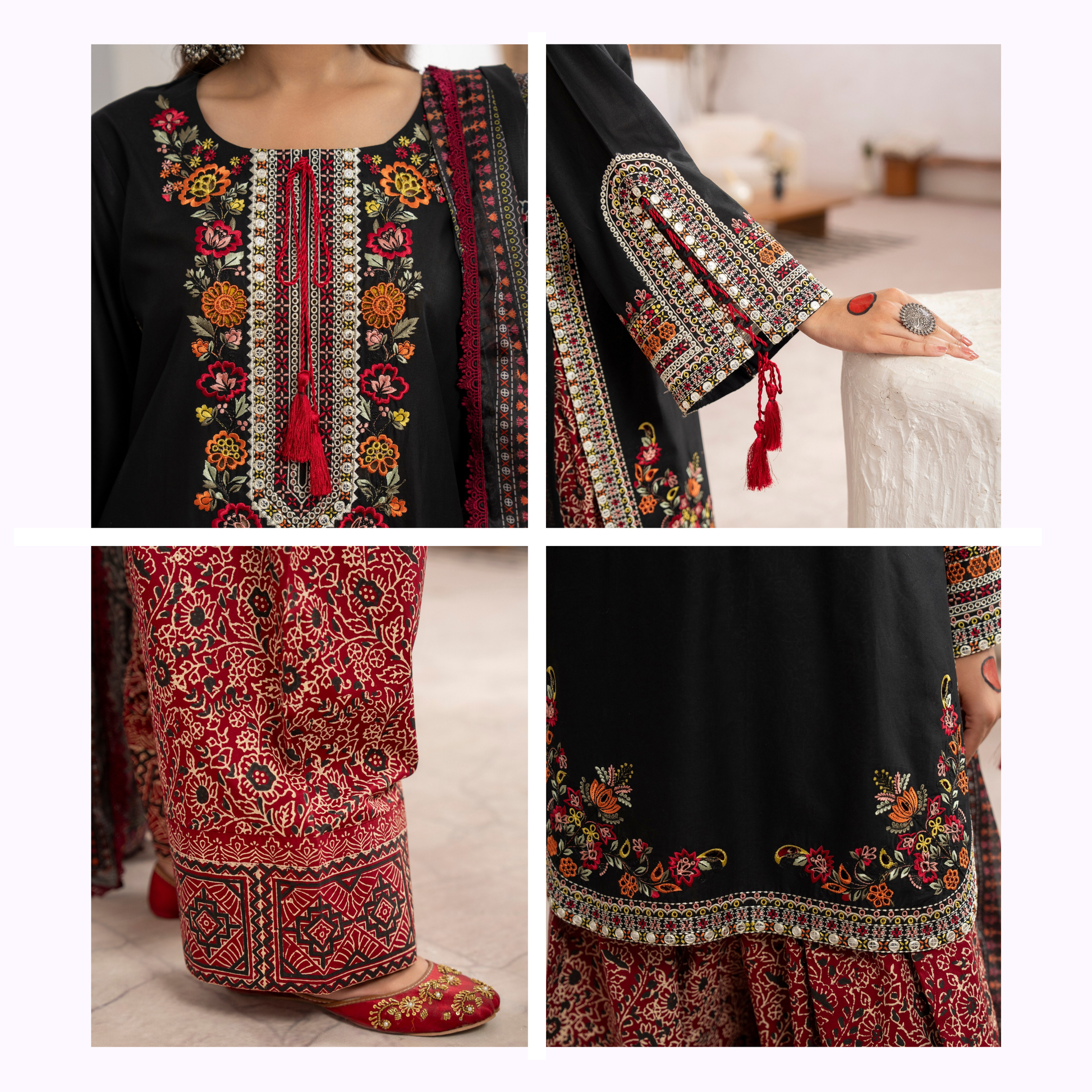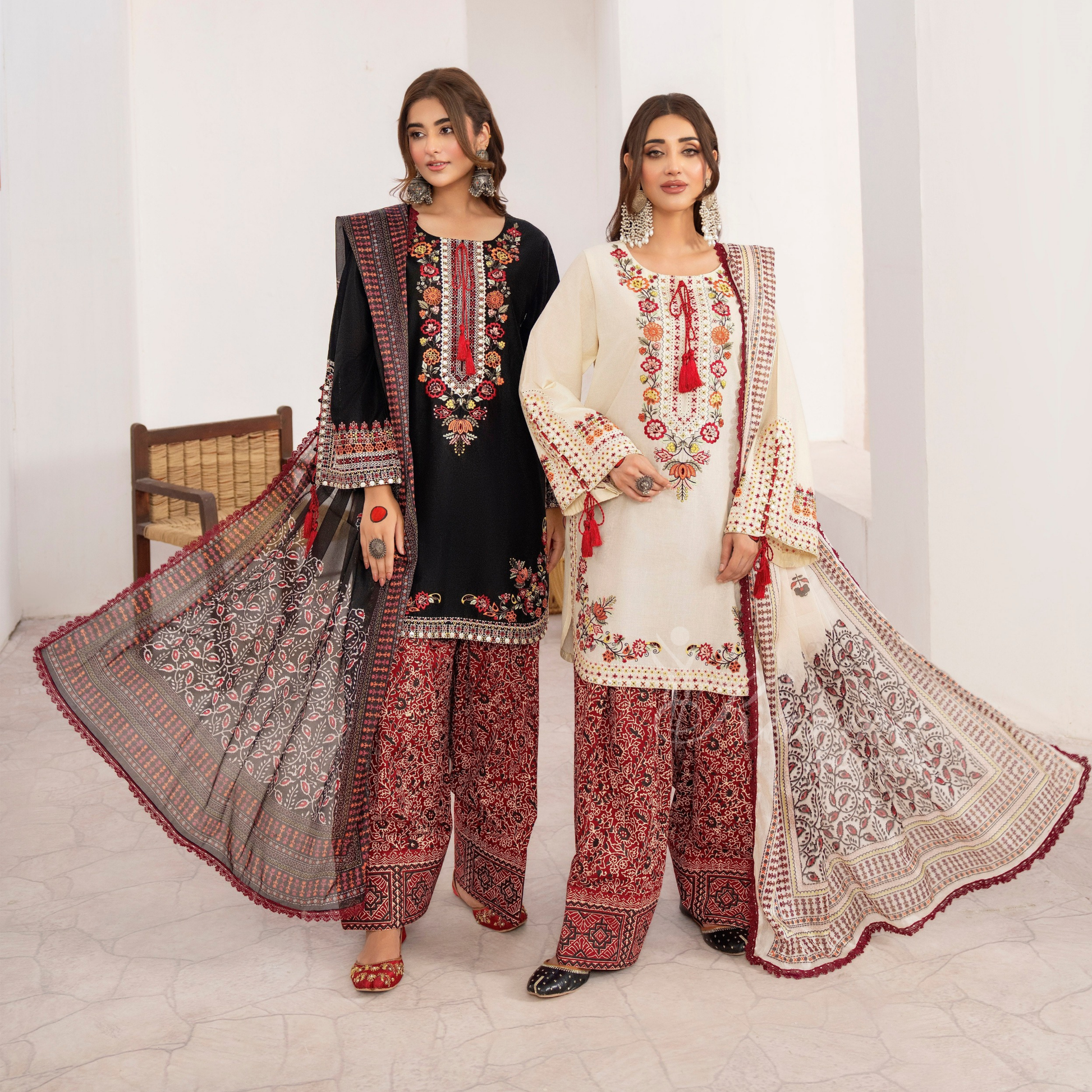 Sleeves adorned with intricate embroidery in multicolored threads that runs along the neckline, sleeves, and hem, adding a luxurious touch. The block Printed wide-legged farshi shalwar complements the kameez , enhancing the overall traditional appeal. Paired with a vibrant Printed Traditional silk Dupatta the ensemble reflects festive grandeur and timeless cultural elegance.