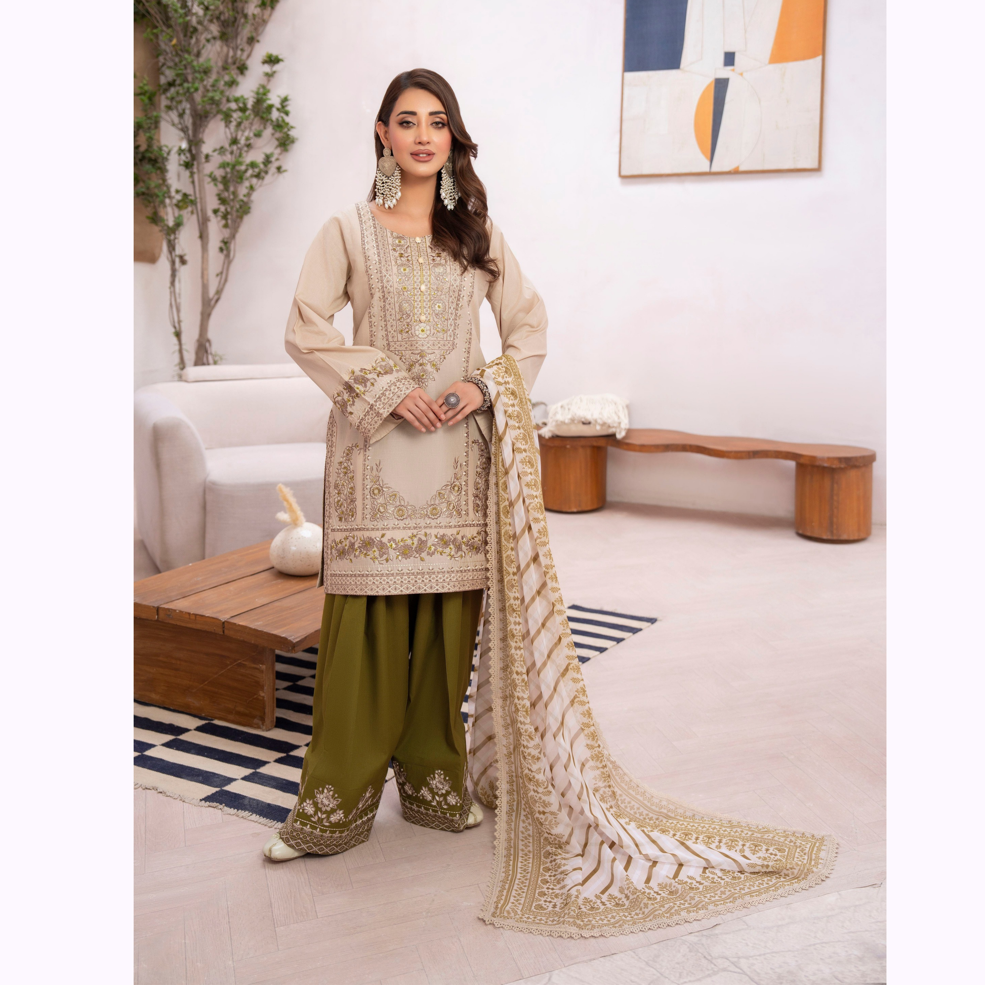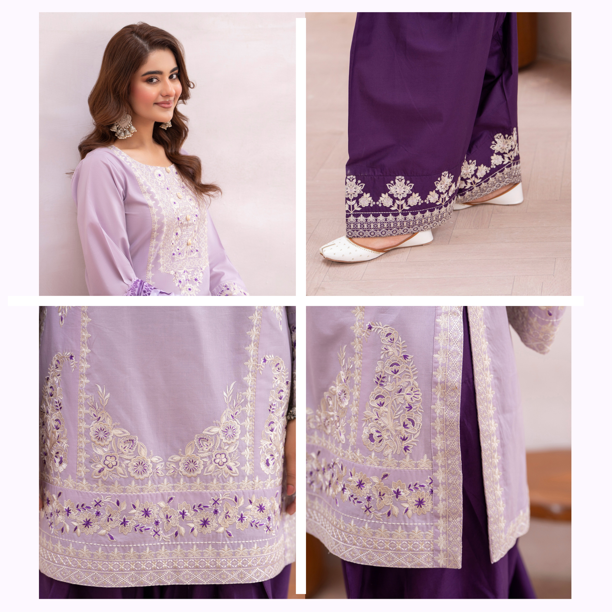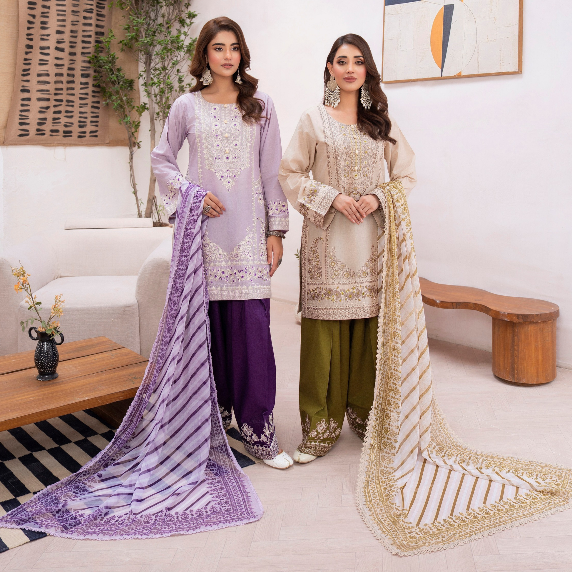 Introducing Beautiful farshi shalwar dress exudes elegance in 2 shades, made from breathable cambric cotton that beautifully balances comfort and style. This elegant cambric cotton shalwar kameez features thread embroidery across the front, hem, and sleeves. The purple/mehndi green shalwar adds a rich contrast, beautifully embellished with floral embroidery at the cuffs. Completing the look is a light Printed Chiffon dupatta with delicate printed patterns and a detailed border, giving the outfit a refined and graceful charm..