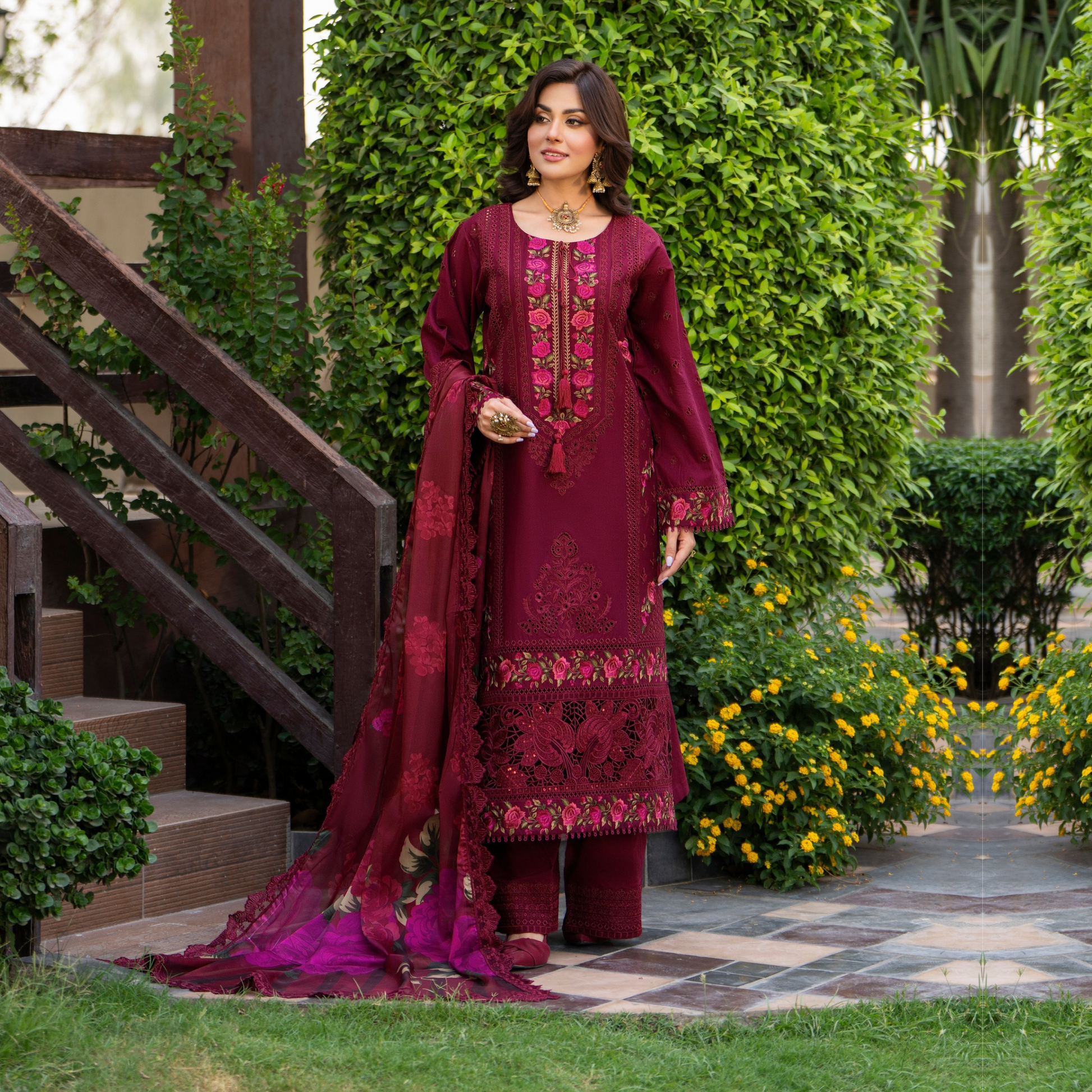 this 3PC ready-to-wear ensemble presents a long shirt embellished with multi-Chikankari thread work and a 3D laser patch on the border, offering a regal aesthetic. The apple silk dupatta, fully embroidered with patch detailing, drapes lushly, while loose trousers with embroidered accents and an elasticized waistband complete the outfit in graceful sophistication.