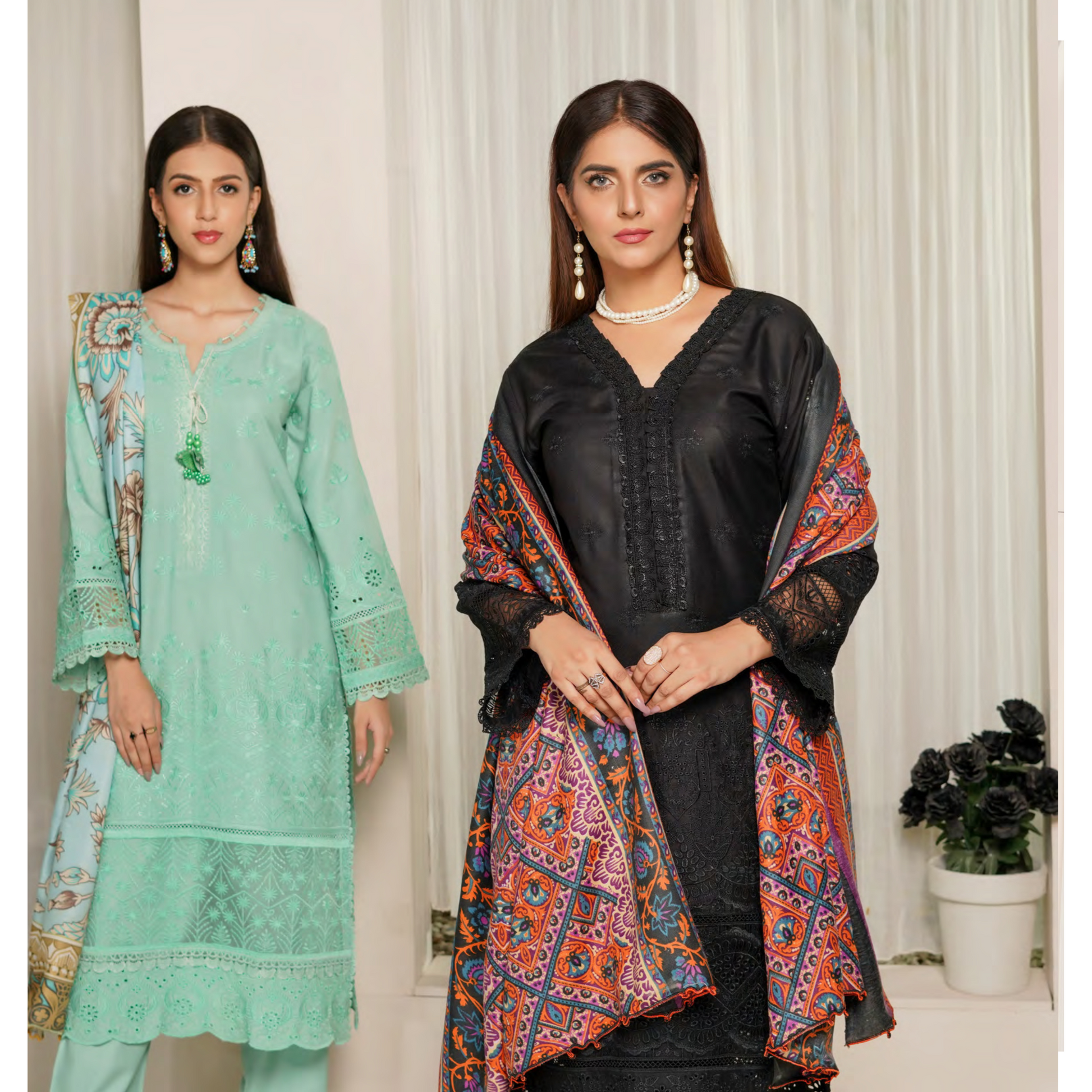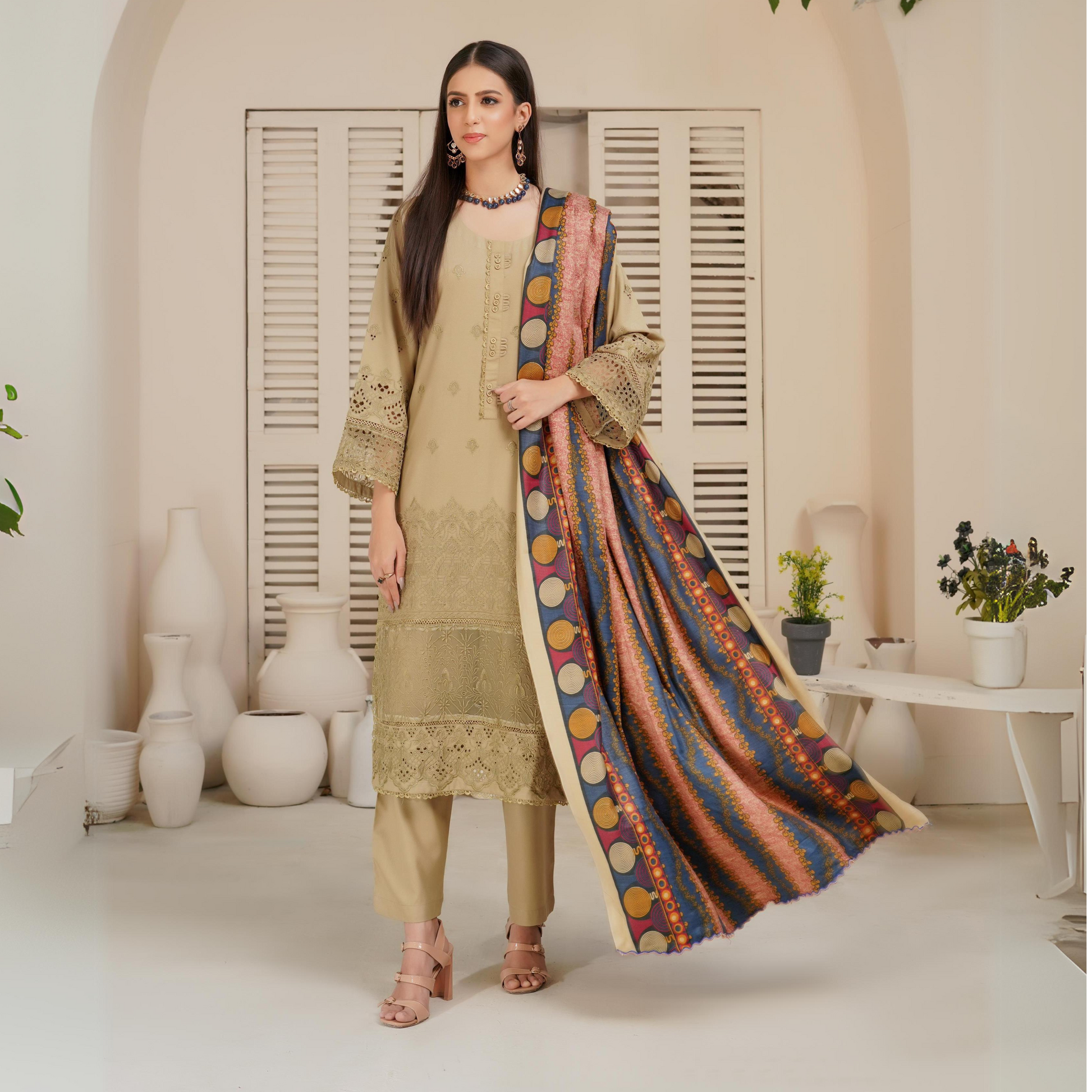 Shawl: The printed wool shawl completes the ensemble, adding warmth and a stylish layer that enhances the entire outfit. Its rich print and soft texture provide a luxurious feel, perfect for elevating your look with comfort and class.