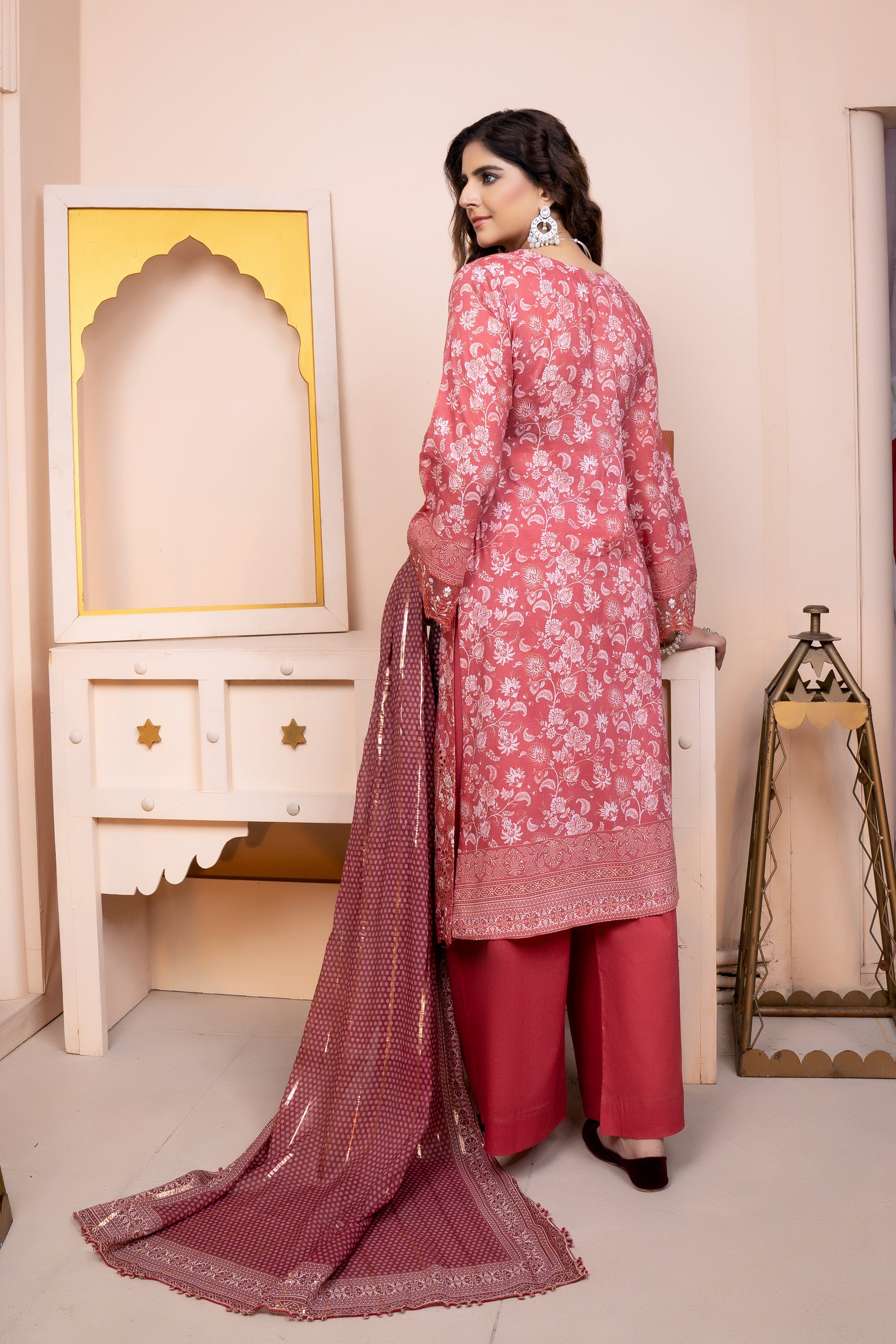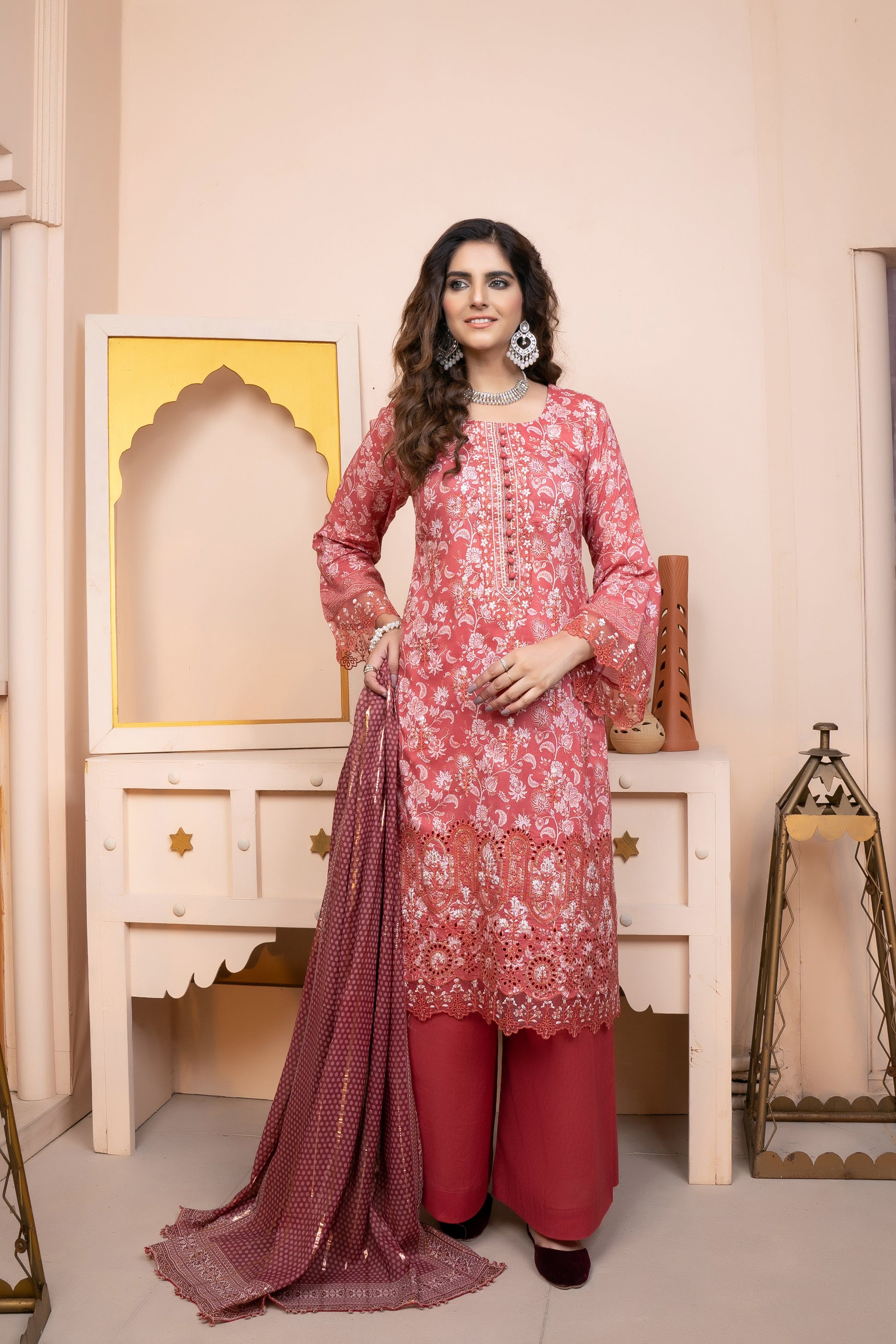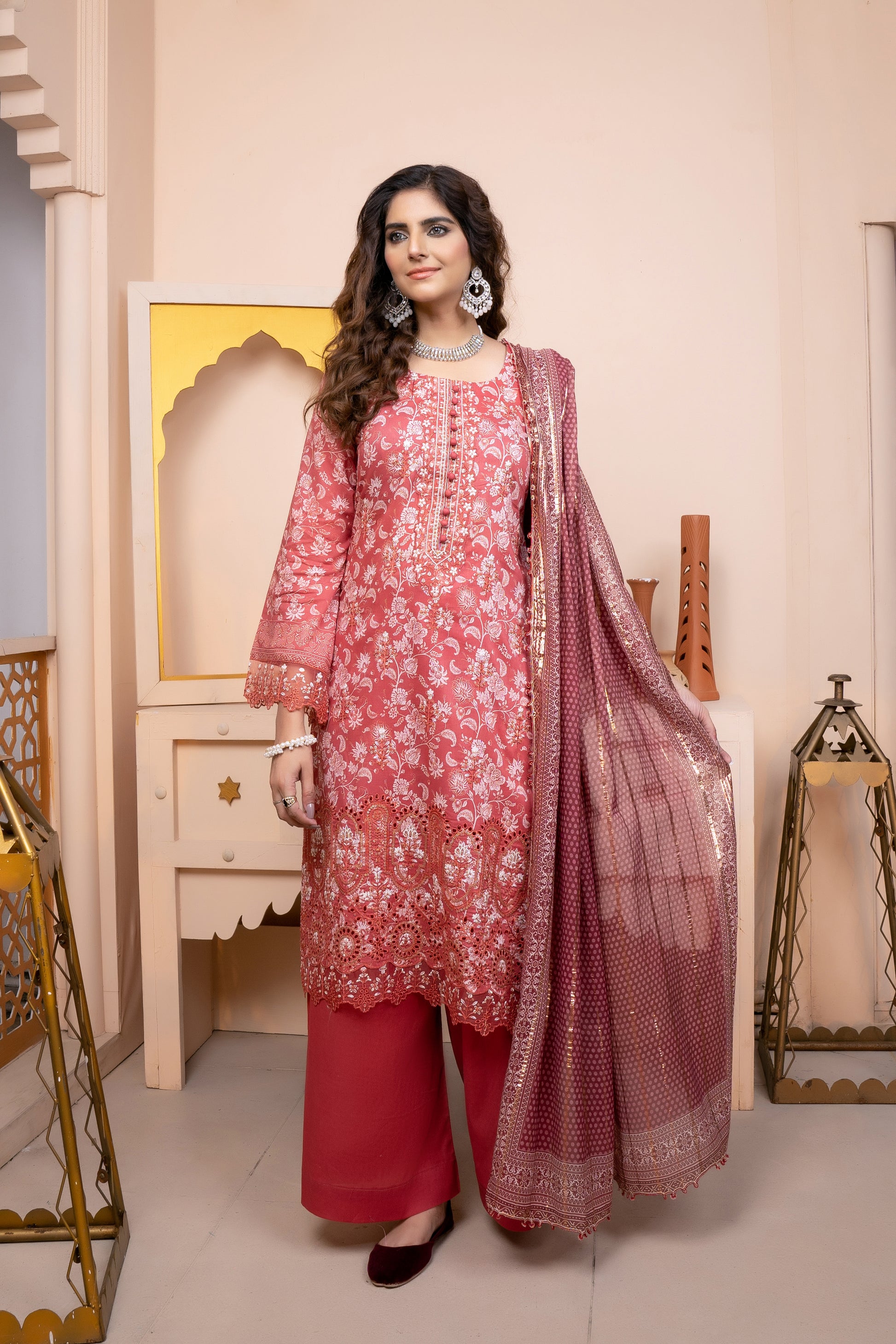 (Maroon) 3Pc Printed Embroidered Lawn Dress by MUNIRA