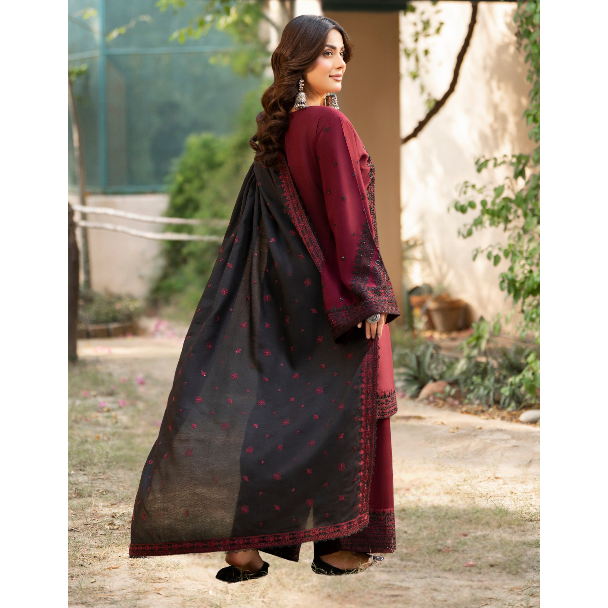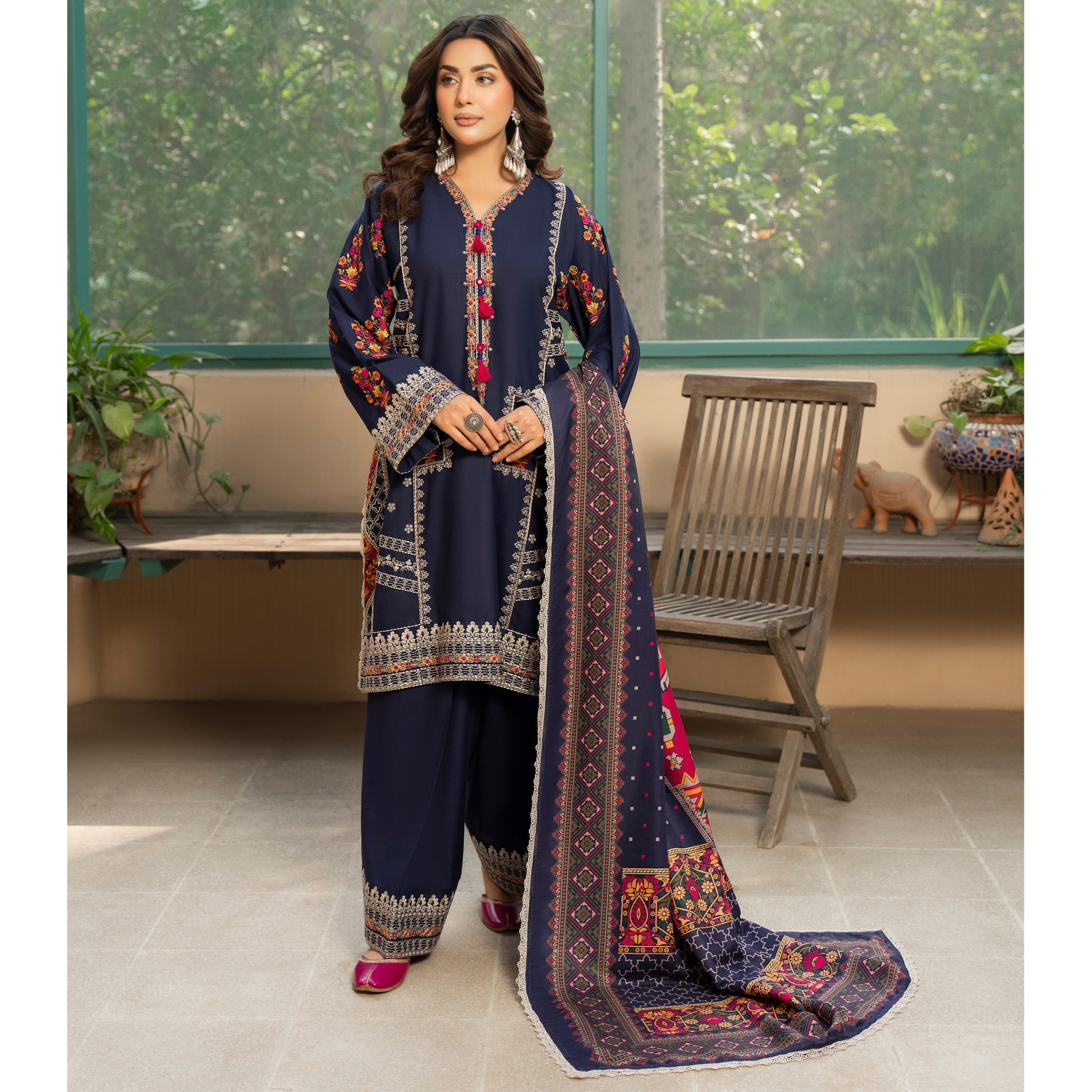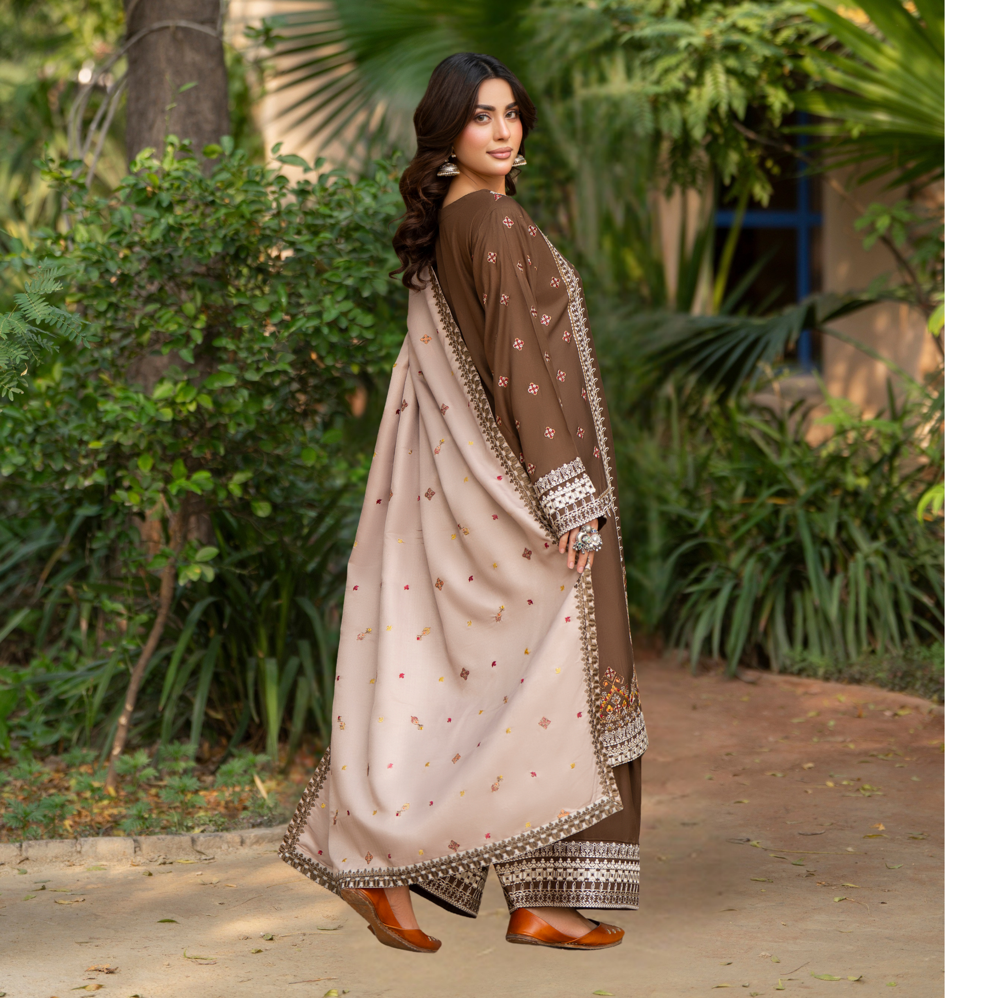 The collection offers a mix of embroidered and Embroidered trousers, including trendy Farshi in selected designs, adding a graceful and traditional touch. Each outfit is paired with a complementing Printed Embroidered Dupatta enhancing the overall charm and femininity of every look.